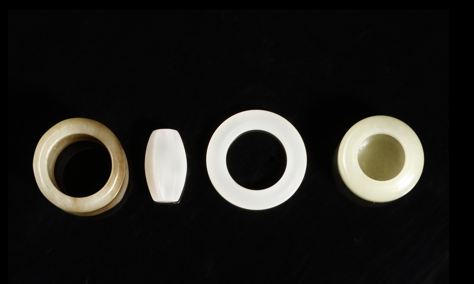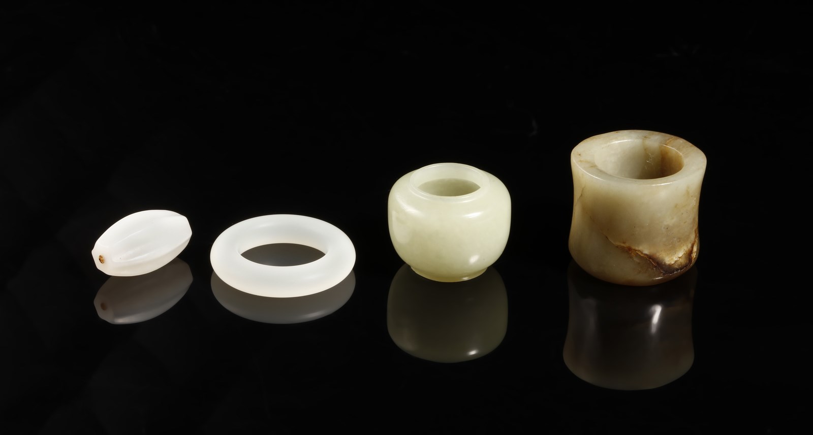 Il lotto è composto da: un piccolo vaso cilindrico in giada celadon, un elemento di collana scannellato in giada bianca, un anello in giada bianca ed un anello da arciere in giada marezzata. 2,20 cm. 2,00 cm. 2,20x 3 cm.