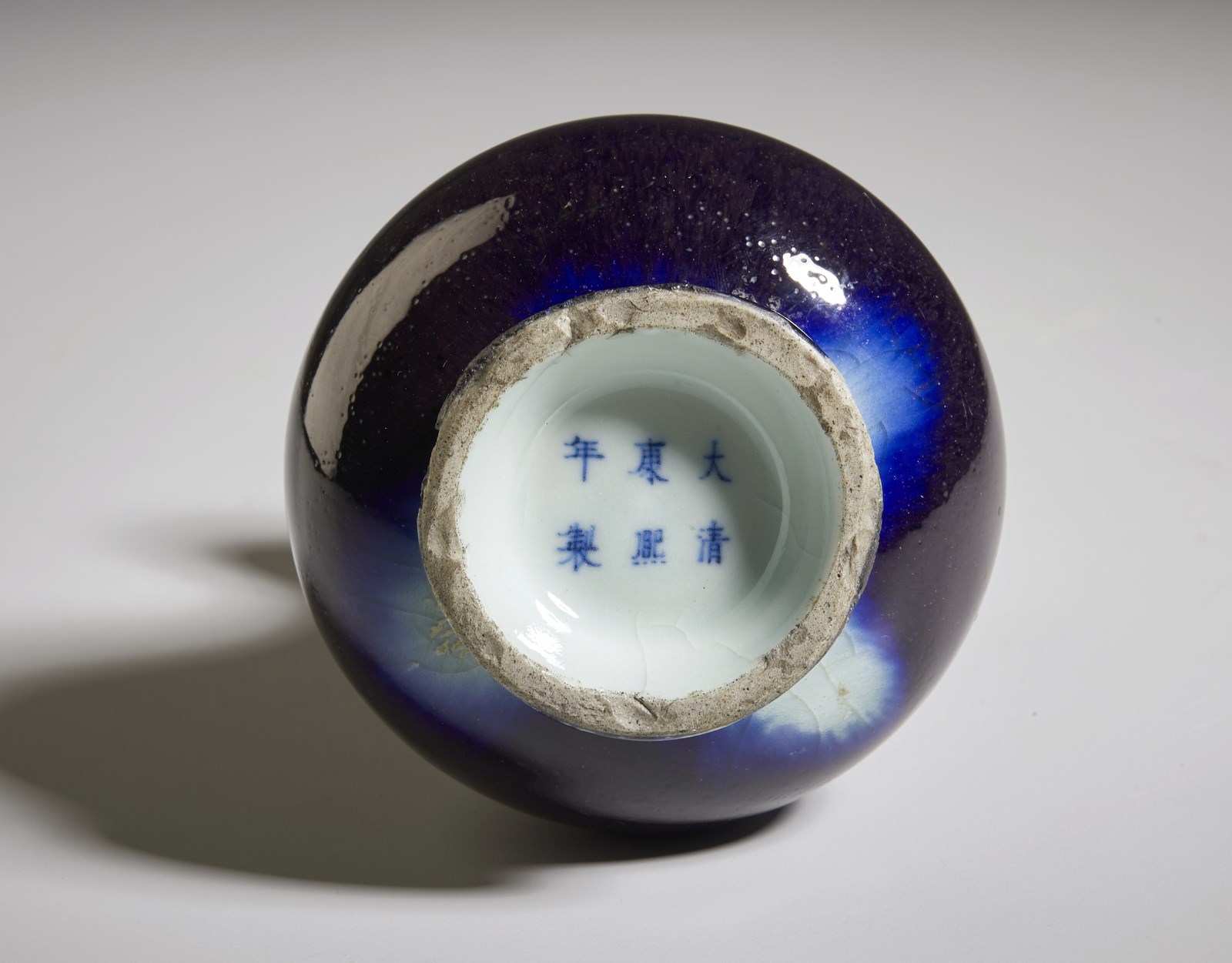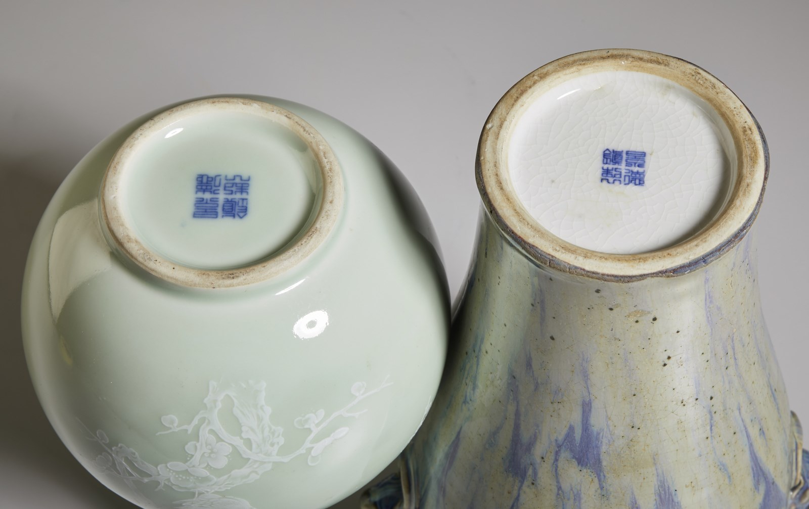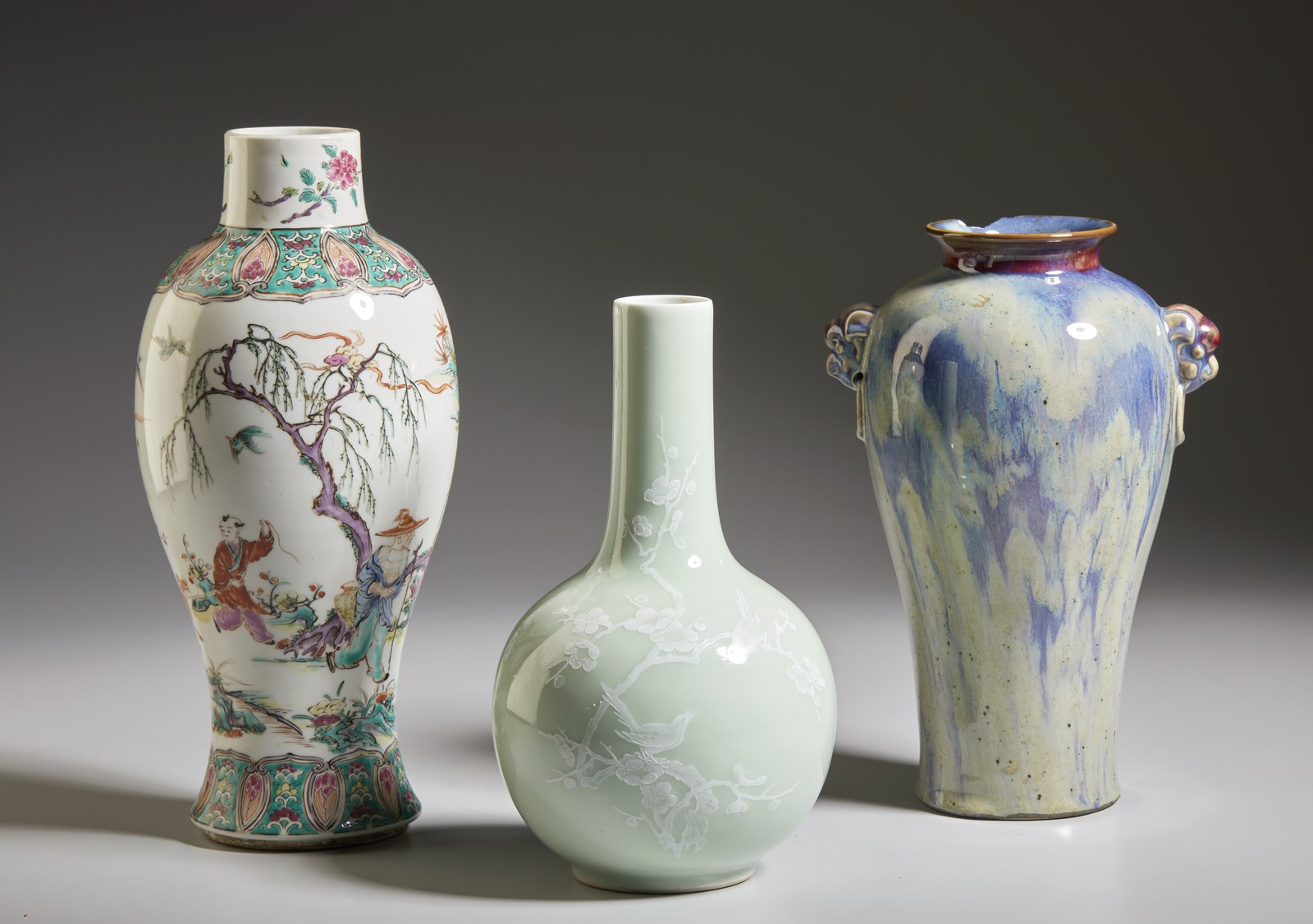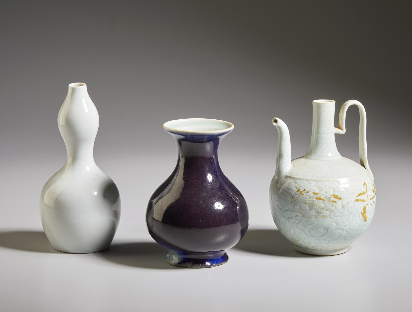 Include: Una teiera con invetriatura claire de lune e decorazione lavorata a stampo (h. 18,5 cm). una bottiglia celadon con decorazione di rami fioriti (h. 24 cm). un vaso meiping con invetriatura flambé color lavanda( h. 25,5 cm). un vaso a doppia zucca monocromo bianco (h. 19,5 cm).un vaso a balaustro famiglia rosa dipinto con bambini (h. 29,5). un vaso a bottiglia con invetriatura blu e marchio kangxi a sei caratteri sulla base (h. 16 cm)