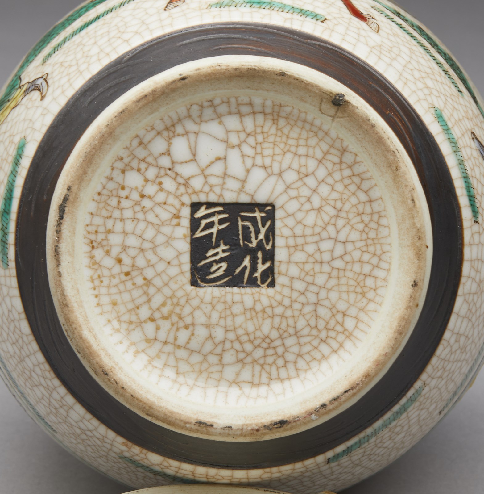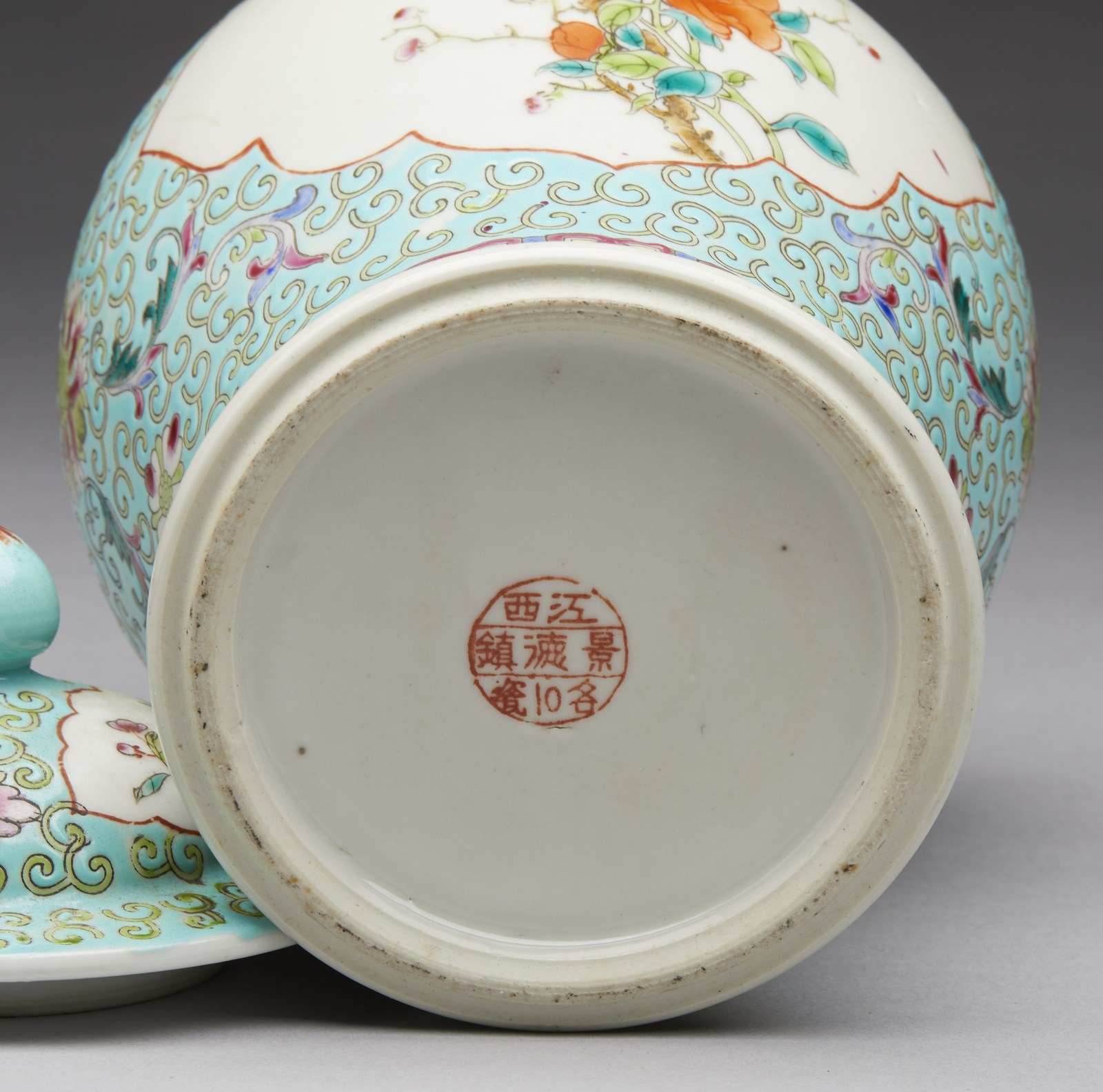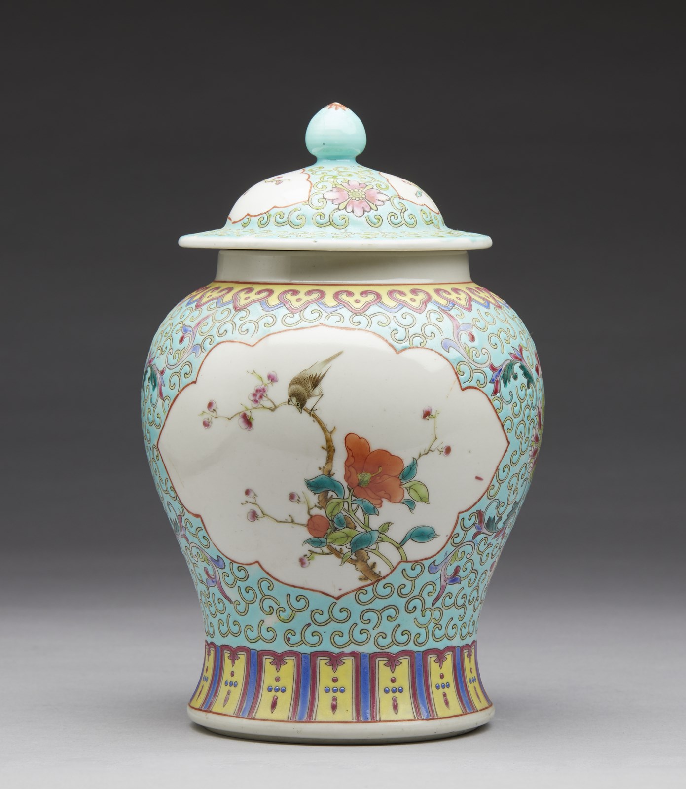 Include: due potiche con coperchio dipinte in blu sottocoperta. un vaso a balaustro con sfondo giallo. una potiche con coperchio decorata con tralci vegetali su sfondo turchese, una grande teiera decorata con iscrizioni, una potiche con coperchio con invetriatura craquelè ed un vaso dipinto con peonie ed iscrizioni. Il più grande ha le misure indicate.