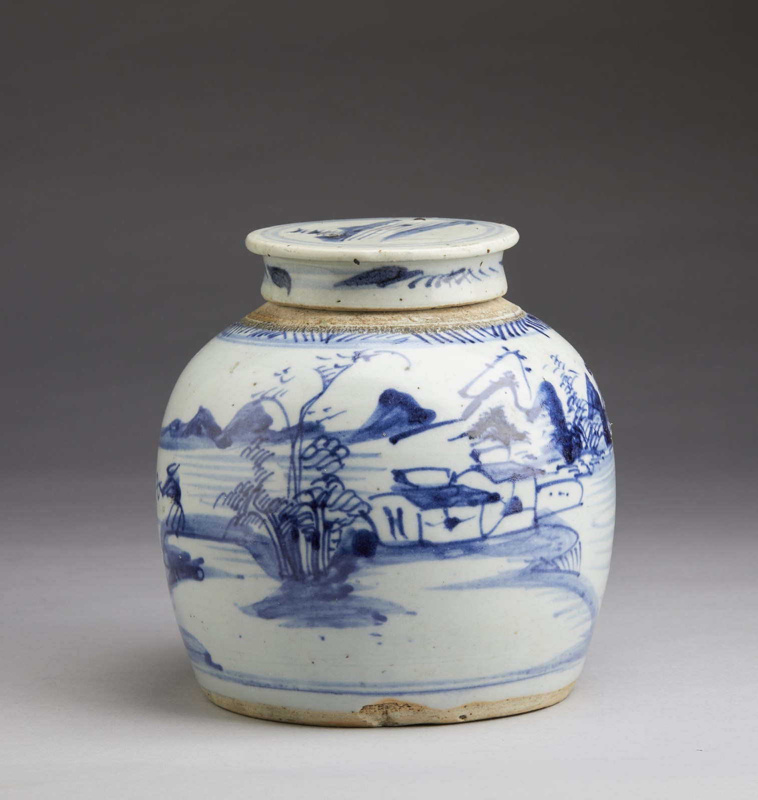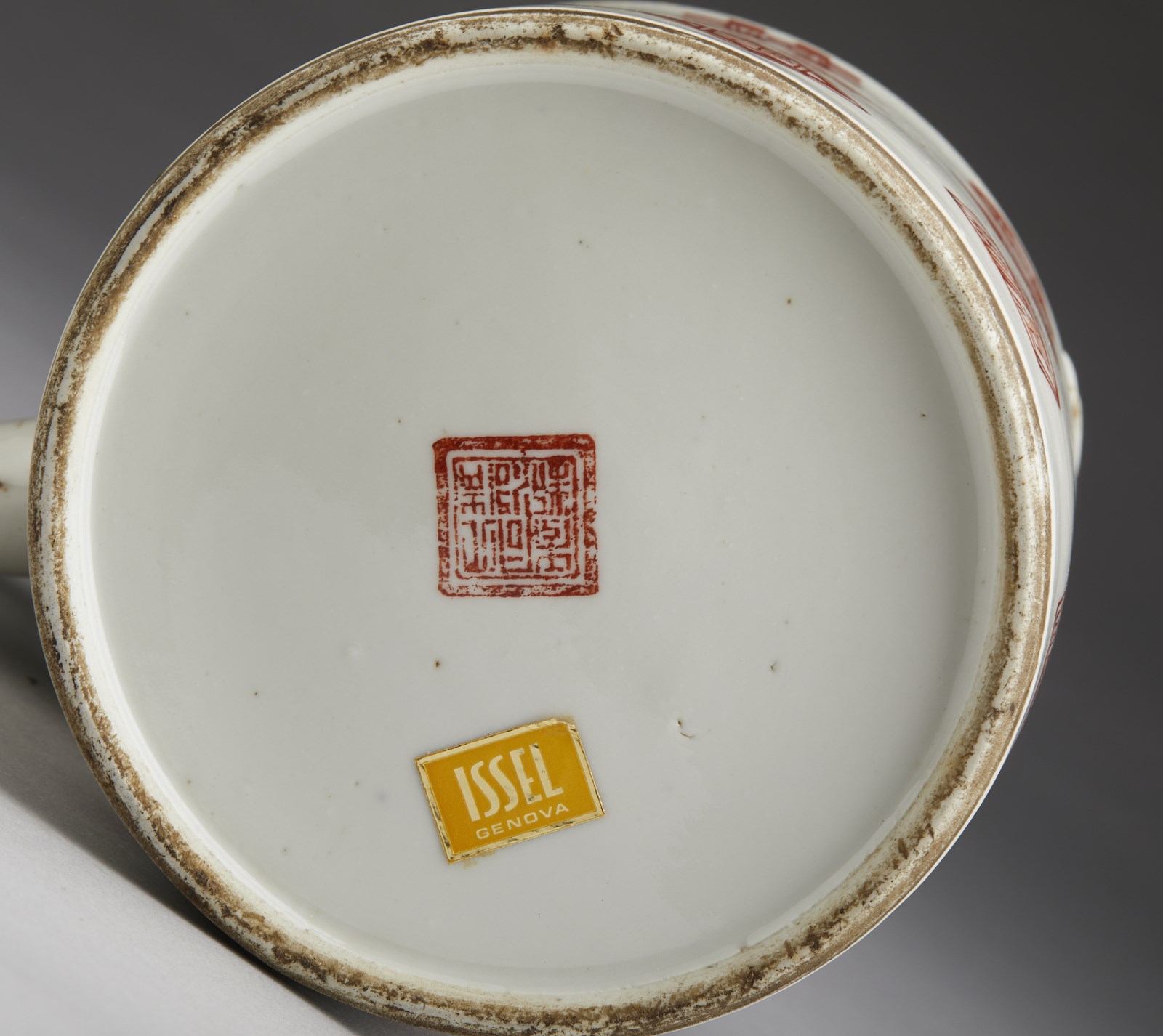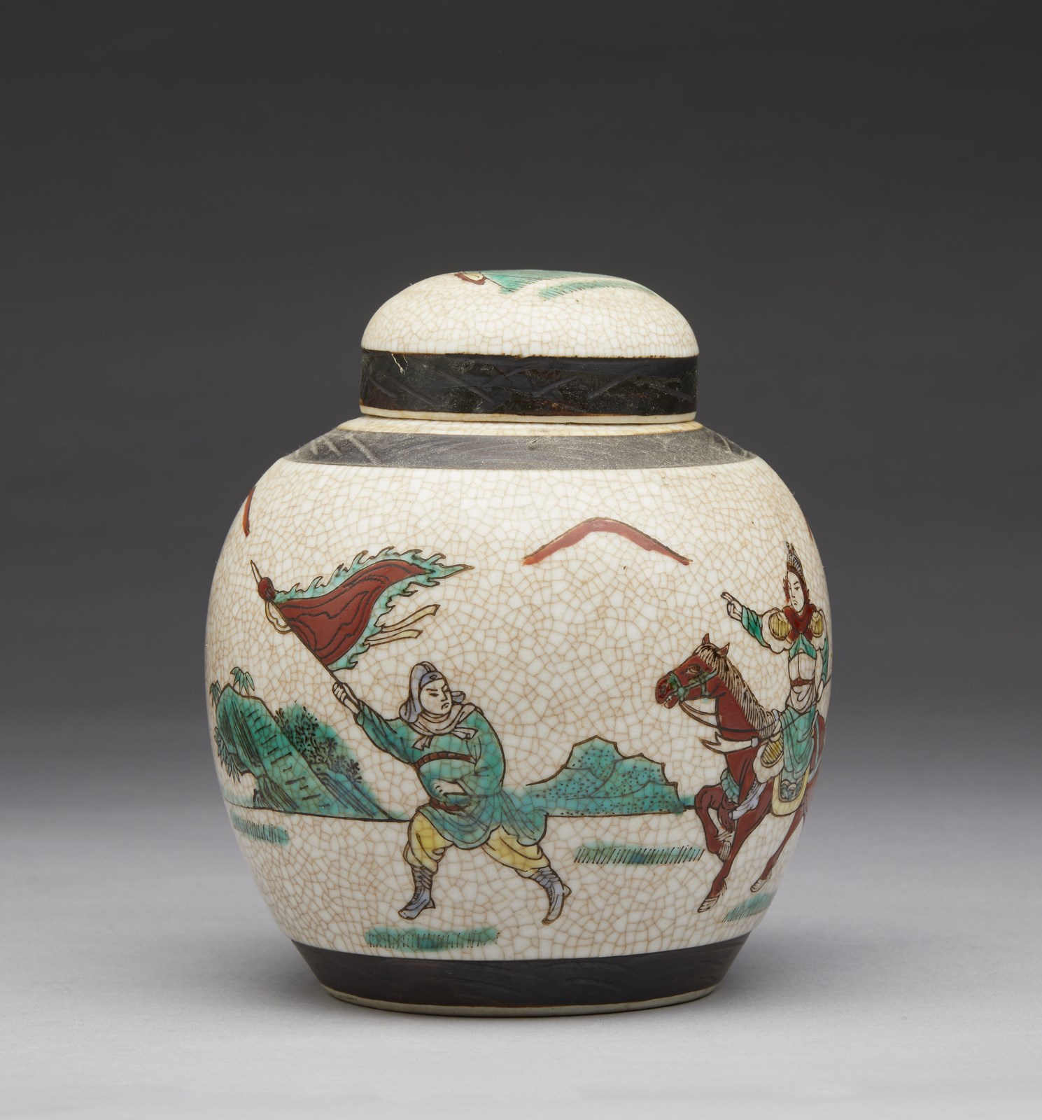 Include: due potiche con coperchio dipinte in blu sottocoperta. un vaso a balaustro con sfondo giallo. una potiche con coperchio decorata con tralci vegetali su sfondo turchese, una grande teiera decorata con iscrizioni, una potiche con coperchio con invetriatura craquelè ed un vaso dipinto con peonie ed iscrizioni. Il più grande ha le misure indicate.