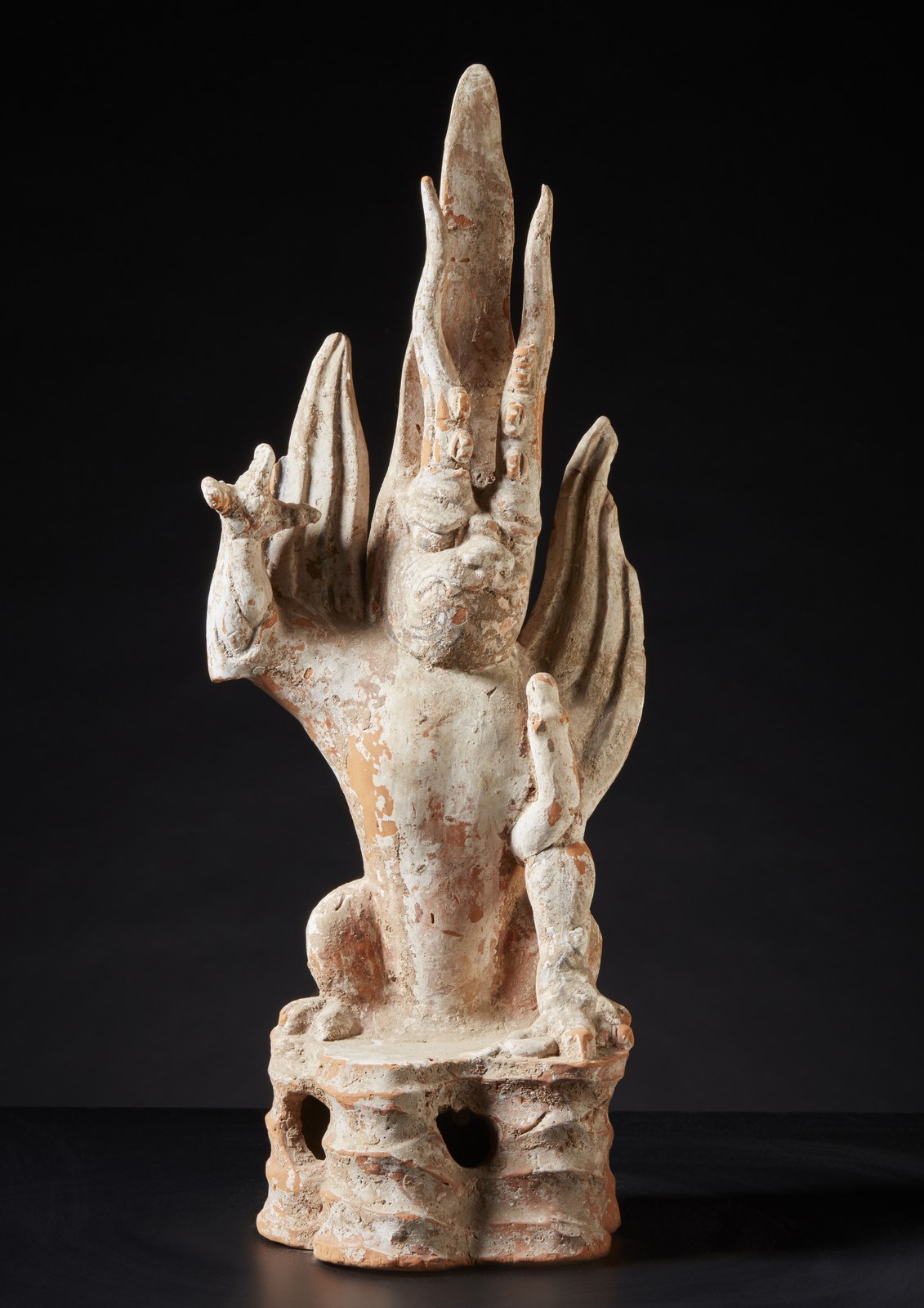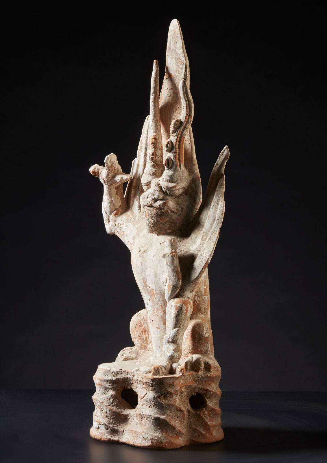 Scultura funeraria raffigurante un animale mitologico con ali e cresta, accovacciato su una base lobata. Tracce di originaria pigmentazione.