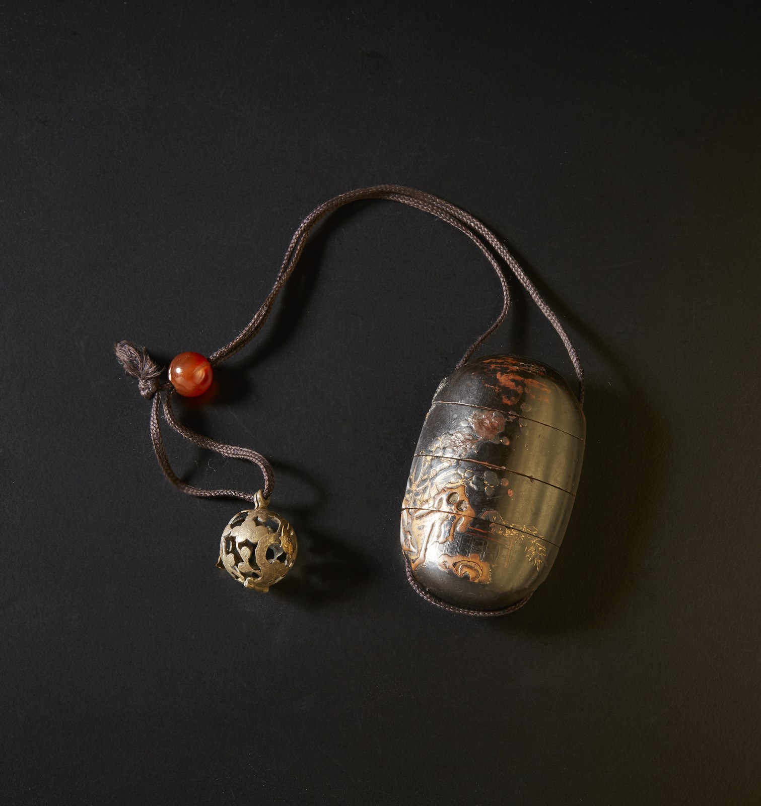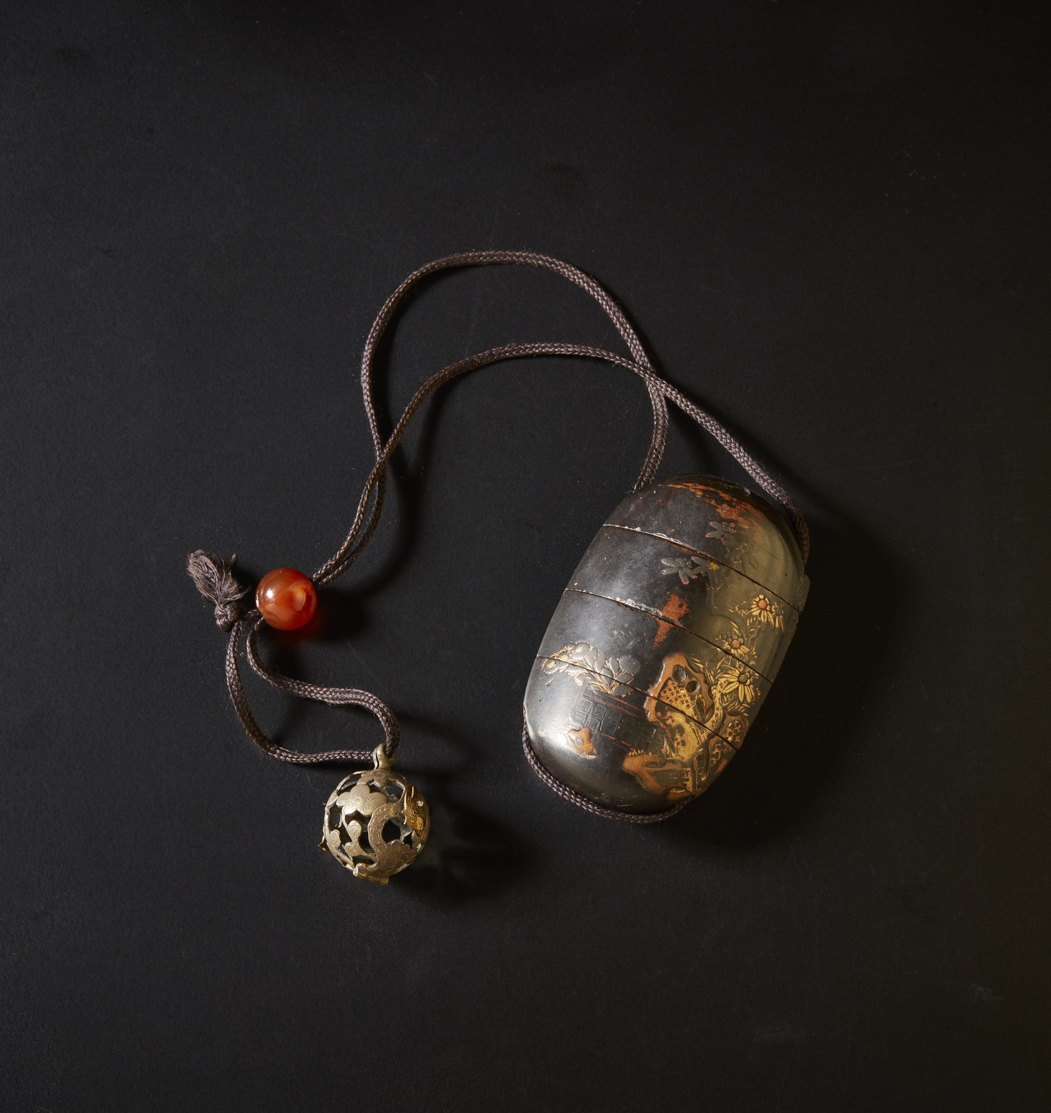 Inro a quattro scomparti in lacca, ojime in corniola e netzuke in metallo.