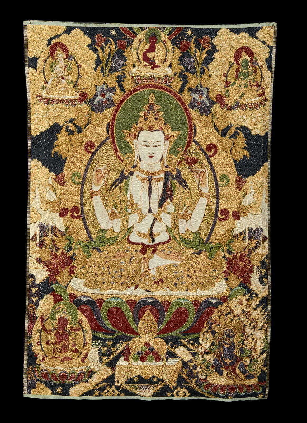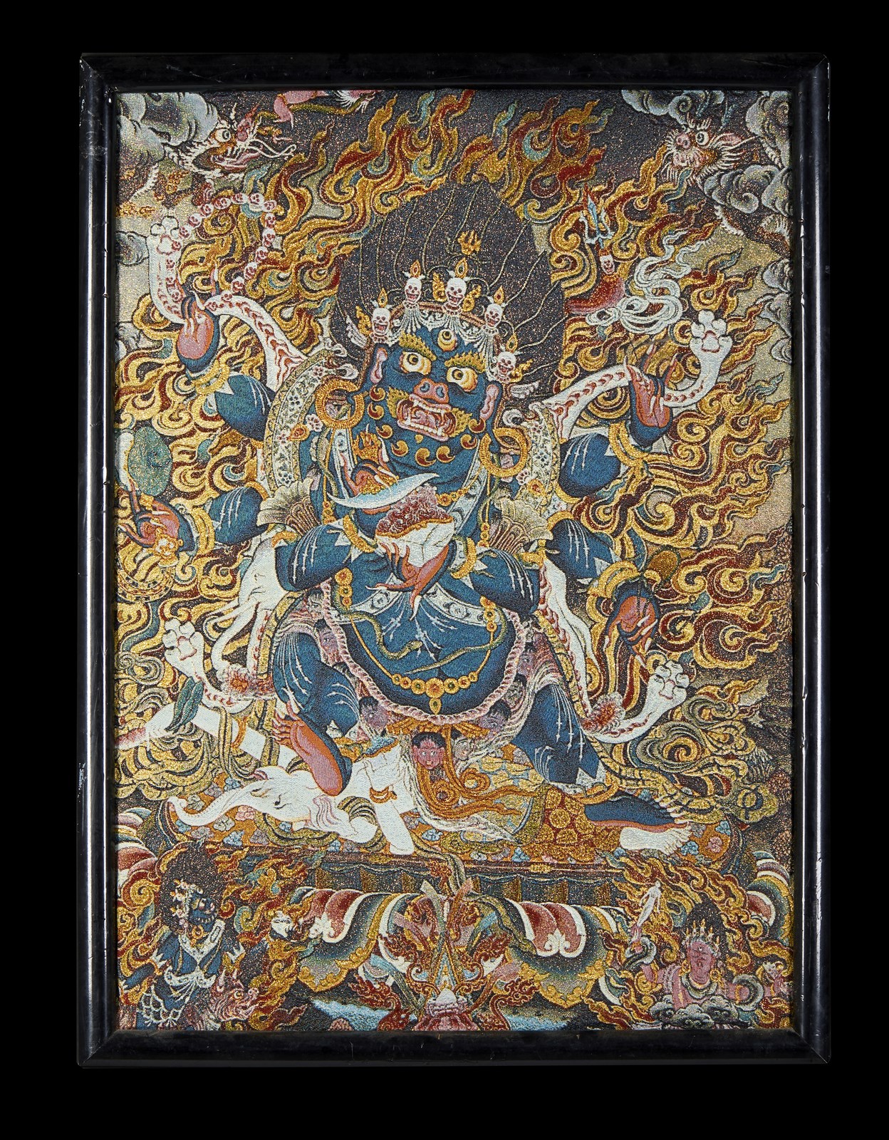 Lotto composto da tre tessuti ricamati:Un tessuto devozionale buddista ricamato a filo d'oro con figura di Avalokitesvara (h. 89 X 59 cm).Una thangka ricamata a filo d'oro raffigurante Mahakala (h. 73 X 52 cm).Un ricamo su seta raffigurante uccelli, gru e piante (h. 100 X 54 cm).