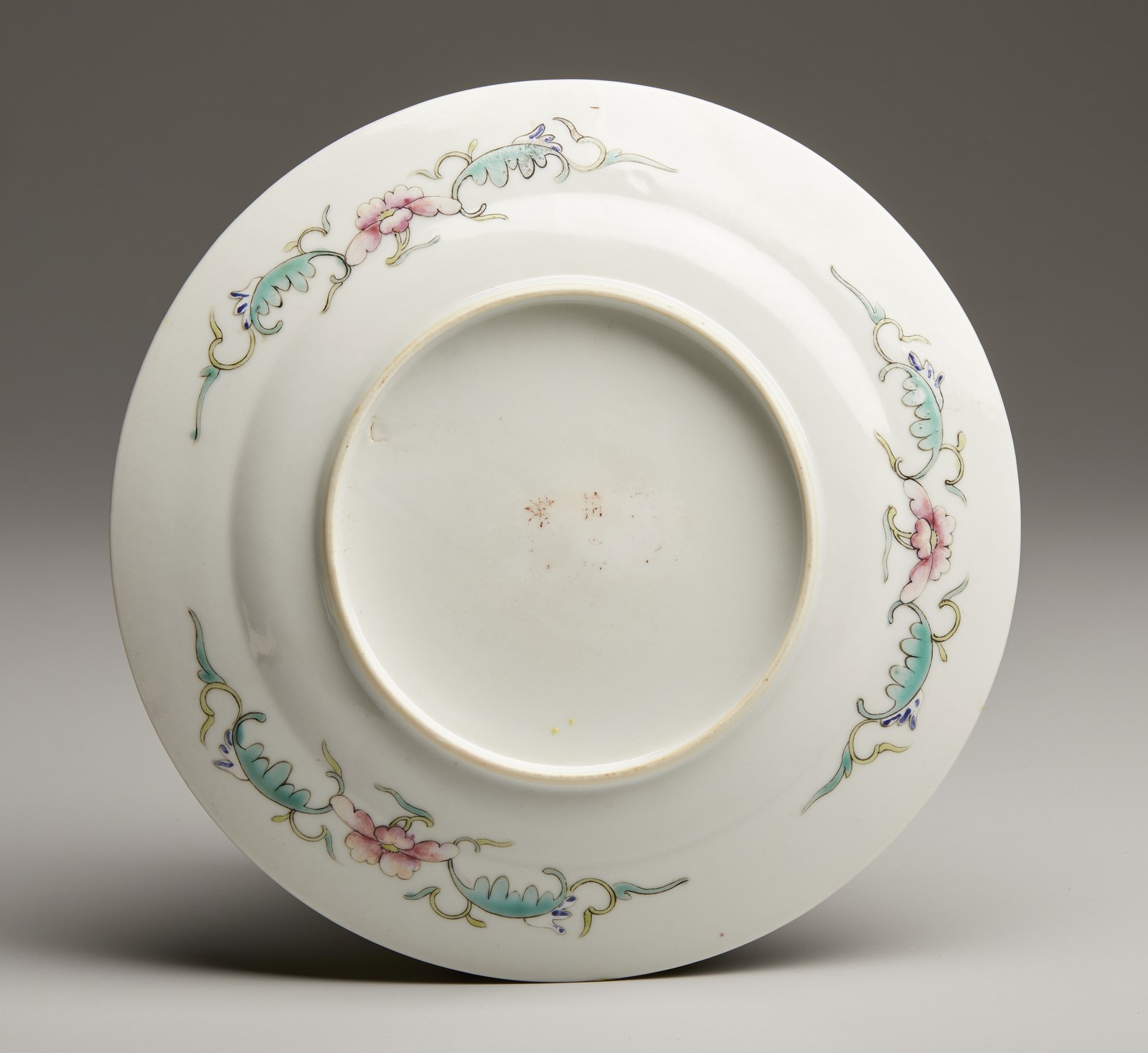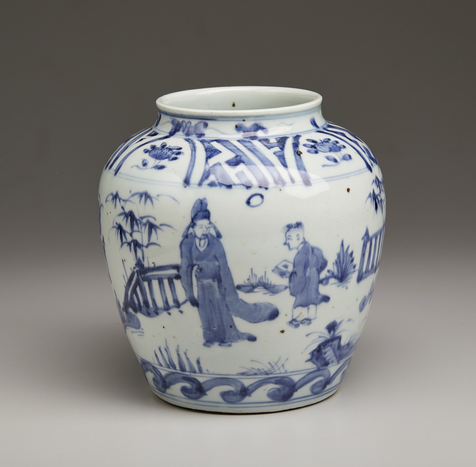 Include: Una giara in ceramica bianco e blu con decorazione figurativa (h. 17,5 cm) ed un piatto in porcellana smaltata con ideogrammi e simboli di buon auspicio (diam. 21,3 cm).