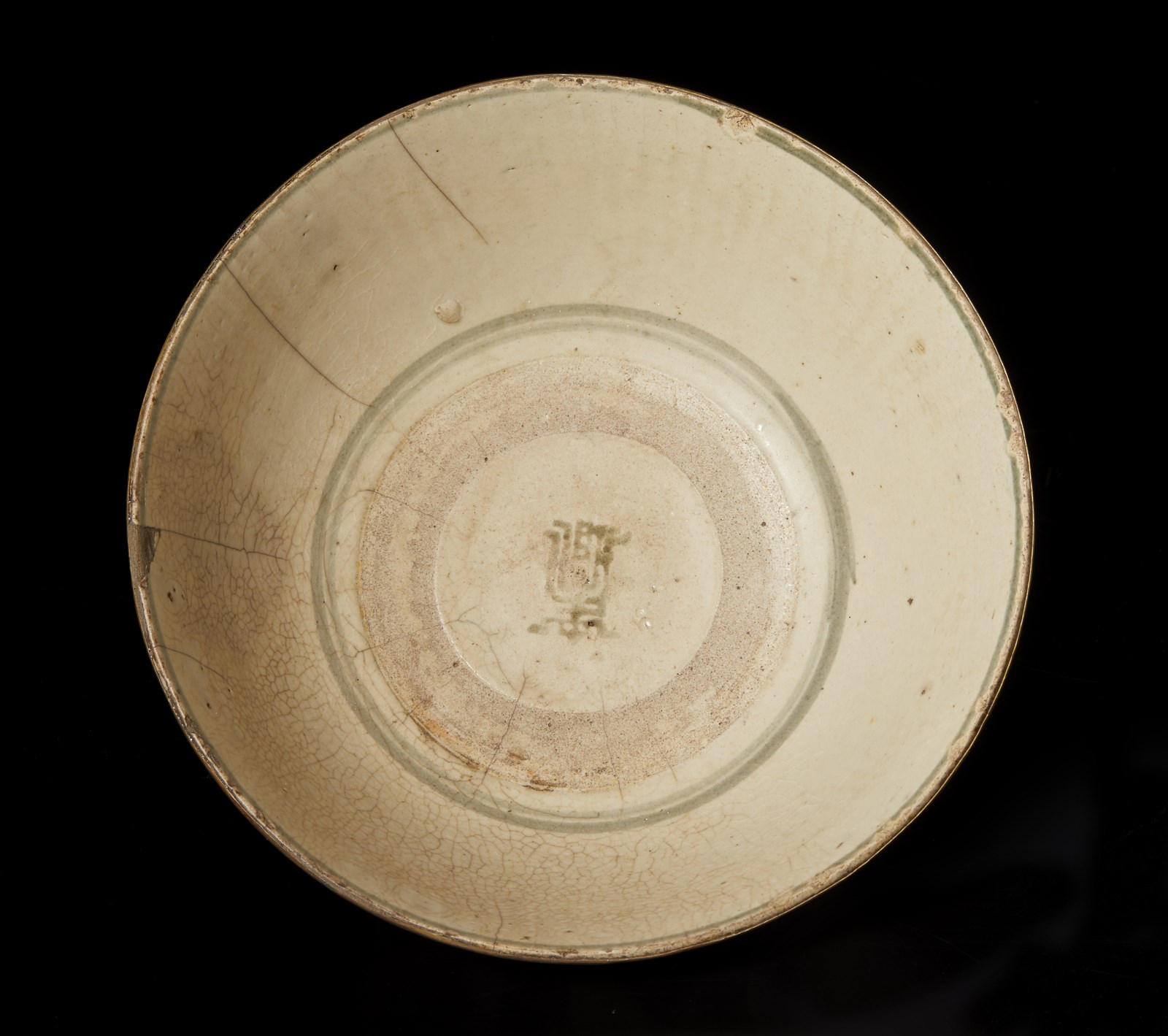 Include una ciotola decorata con ideogrammi blu (h. 10,5 X 23,5 cm) ed un vaso monocromo con invetriatura leggermente craquelè.