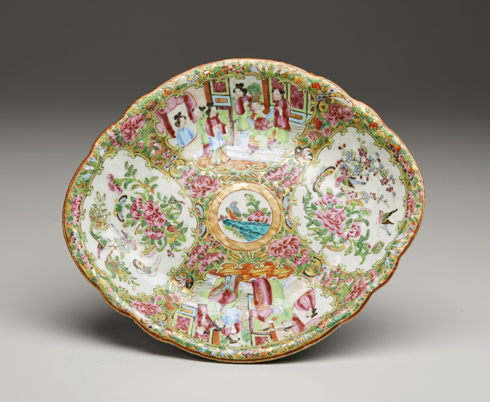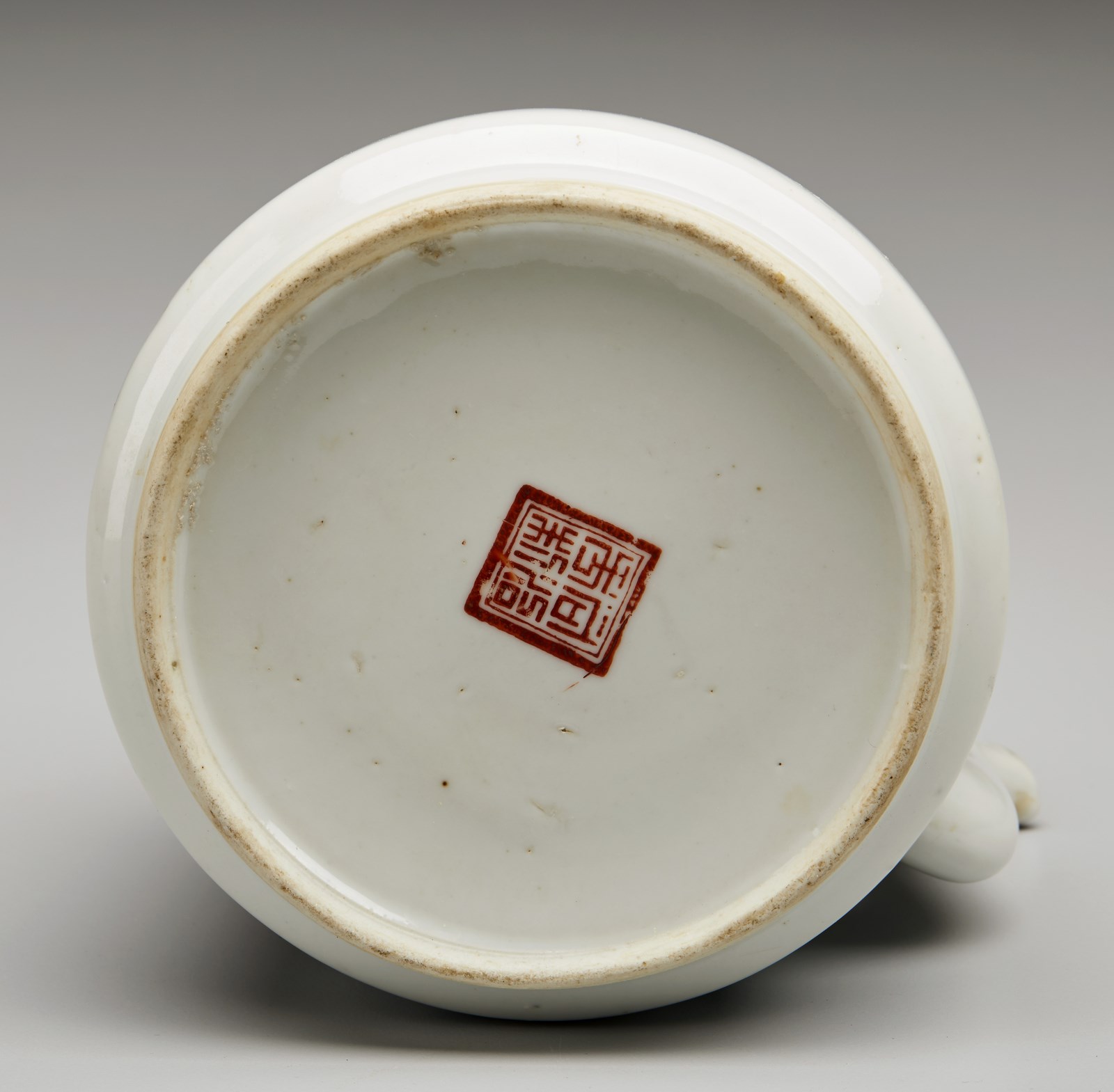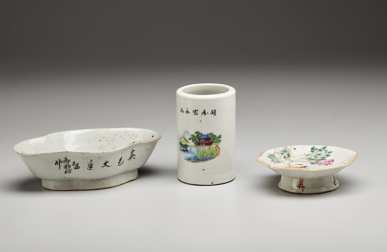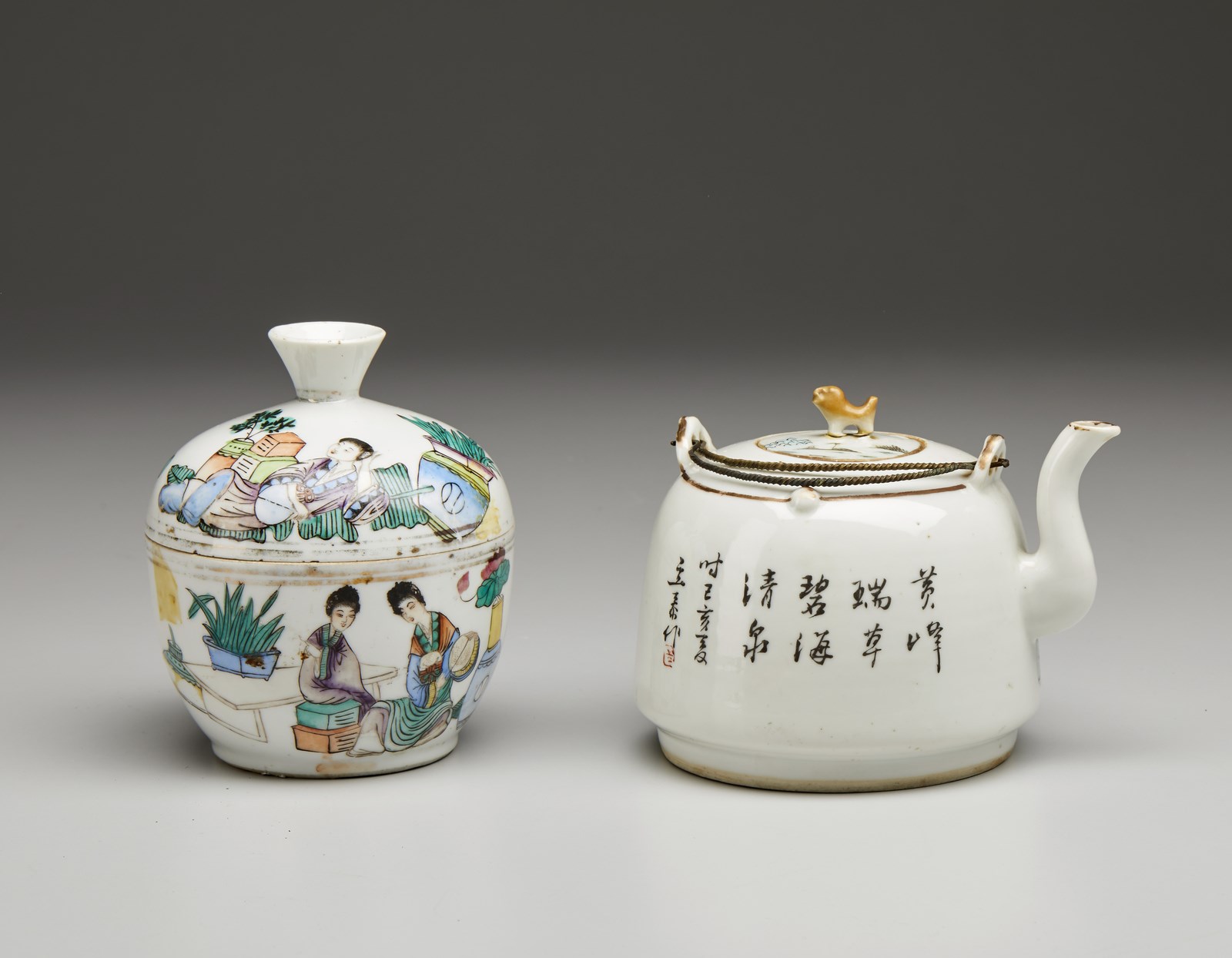 Include: 2 piatti bianco e blu (diam. 15 cm). un piatto ottagonale famiglia rosa (diam. 26,5 cm), un'alzatina periodo Repubblica (h. 3,5 X 12,5 cm), una teiera famiglia rosa (h. 9,5 cm), una tazza con coperchio (h. 12 cm), una tazza lobata con iscrizioni (5,5 X 18,5 cm) e un portapennelli (h. 11 cm)