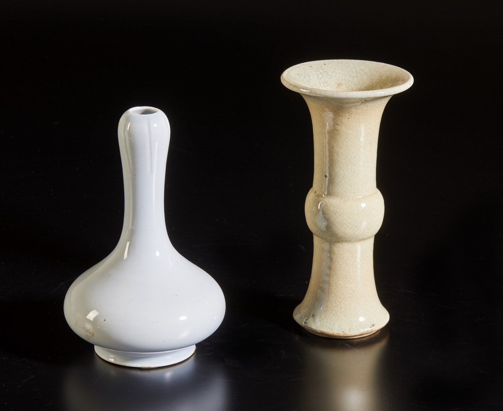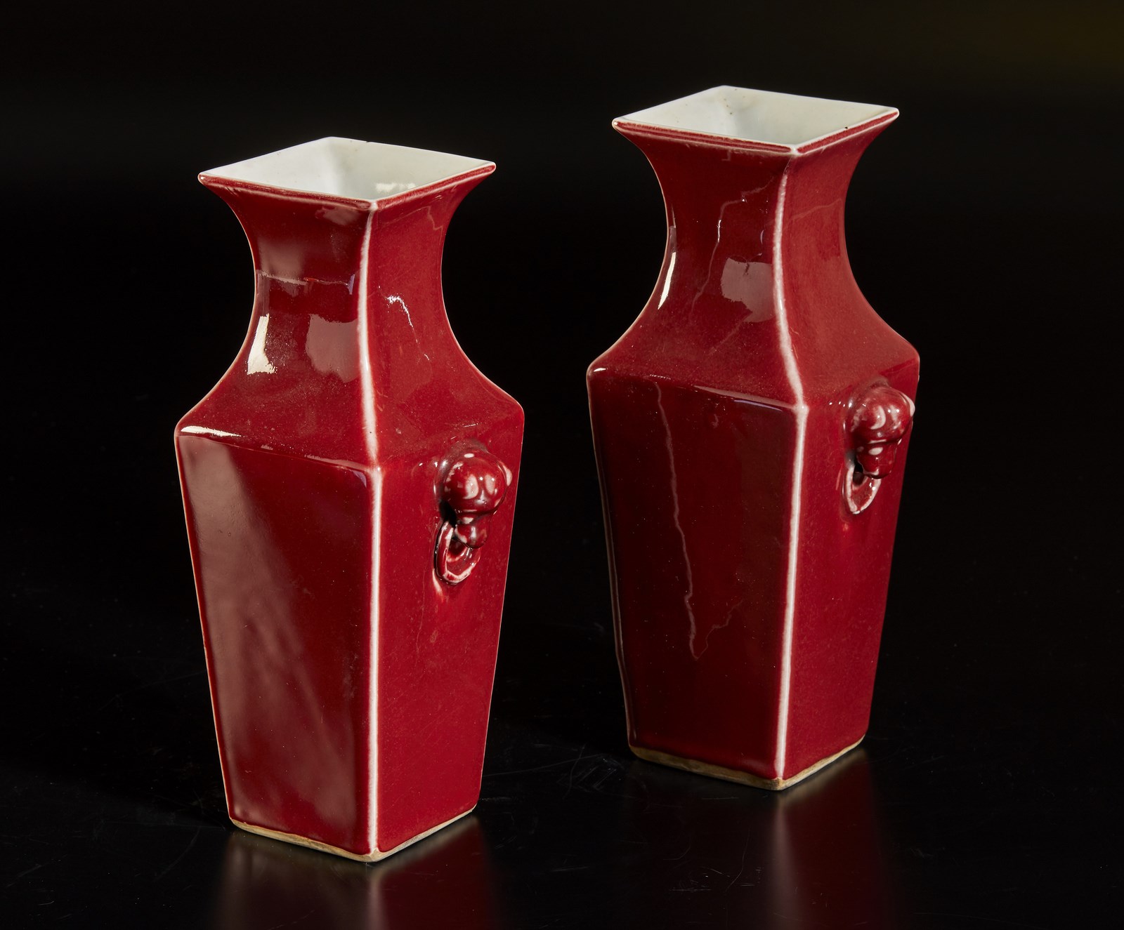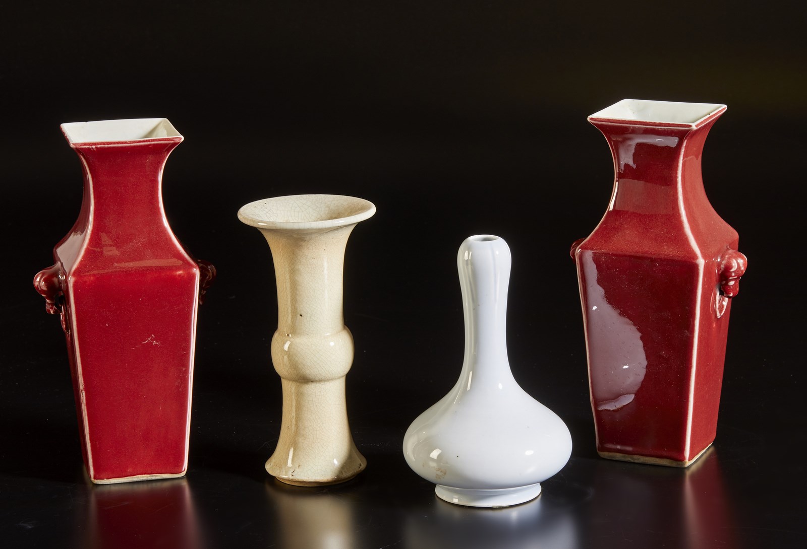 Include: Coppia di vasi quadrangolari con invetriatura sang de boeuf (h. 26 cm). Un vaso dalla forma arcaica zum con invetriatura craquelè (h. 20 cm). Un vaso a bottiglia con finale a testa d'aglio (19,5 cm)