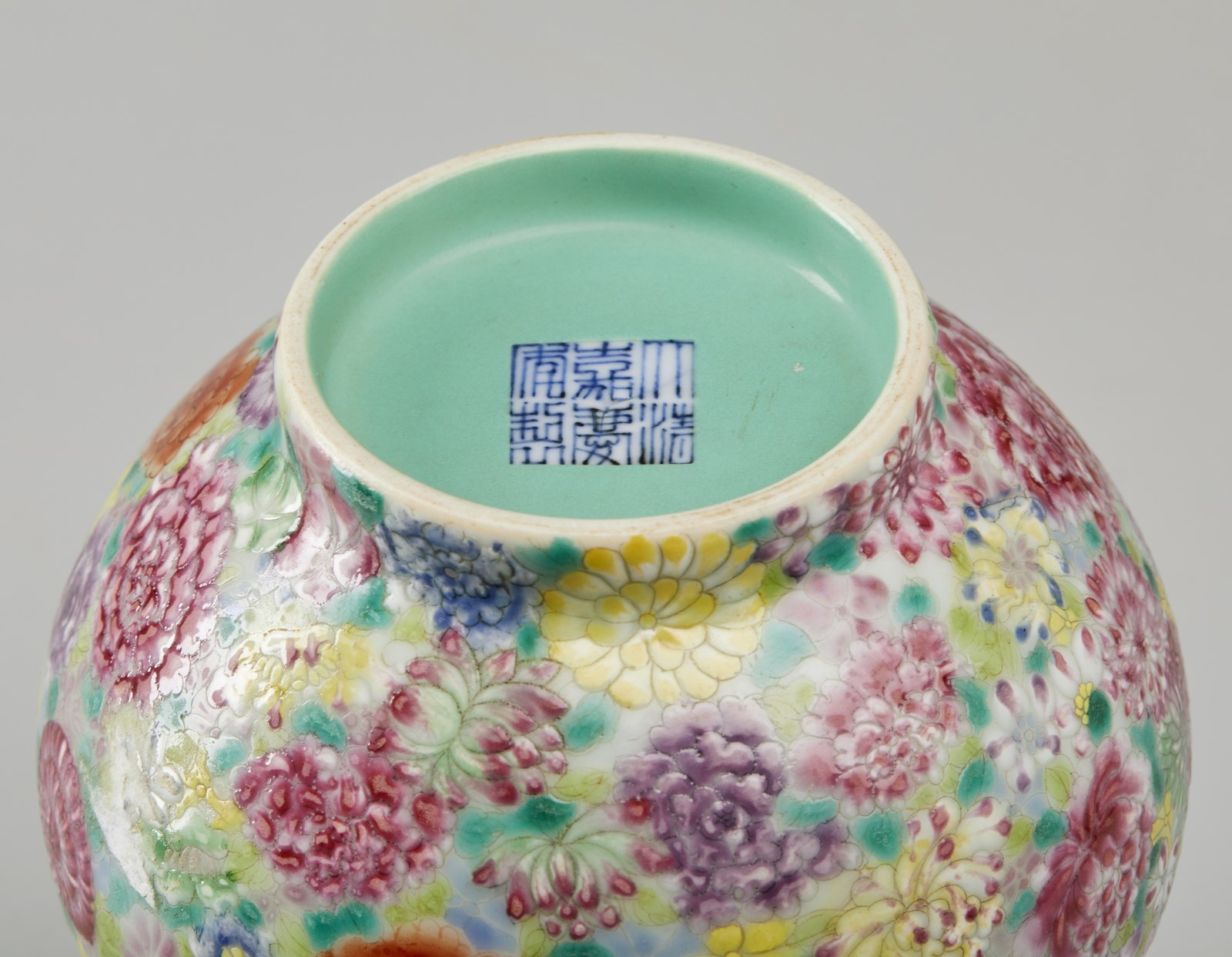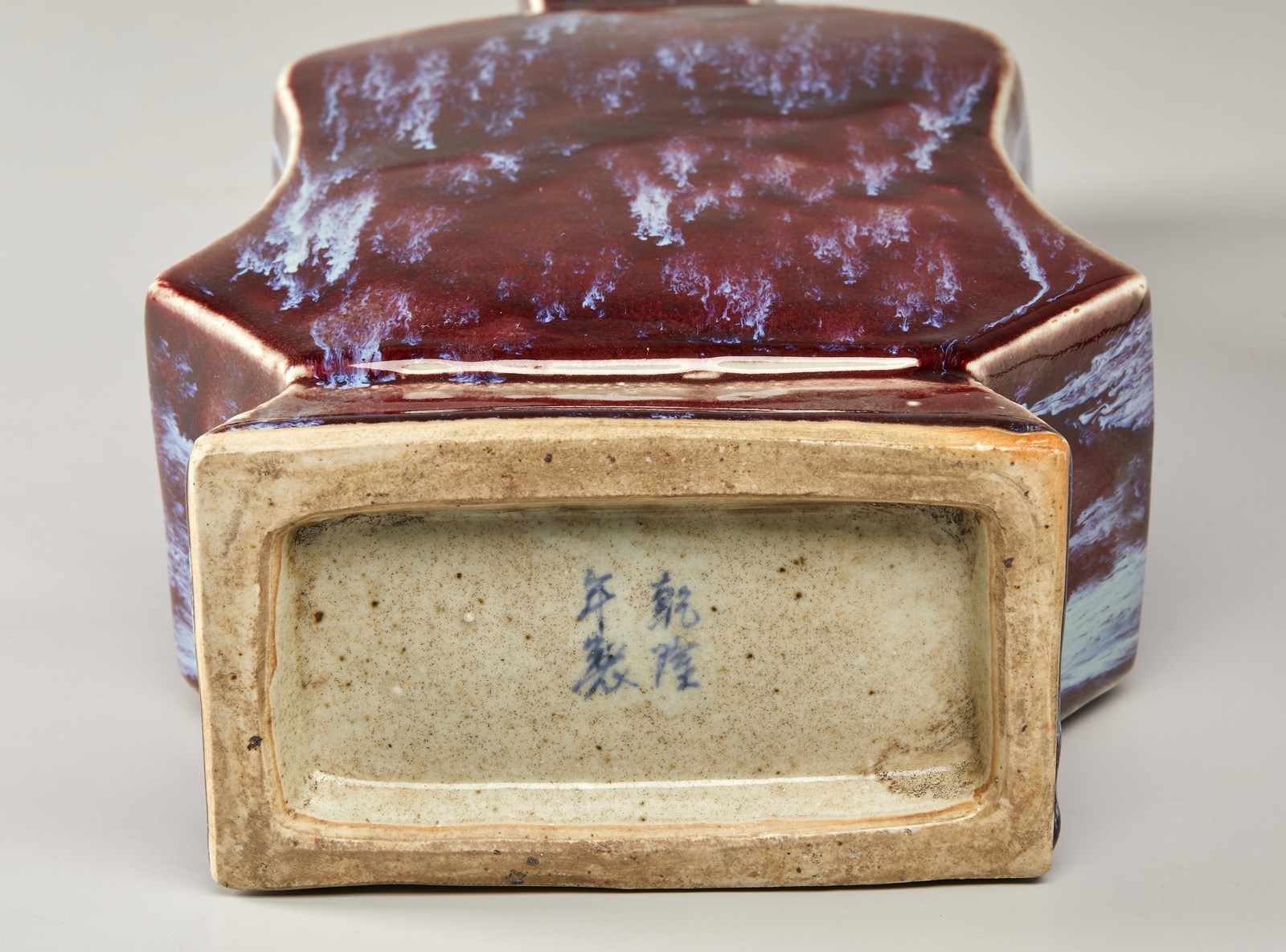 Include: Un cachepot con decorazione figurativa, completo di base (h. 20,2 X 23 cm complessiva). un vaso monocromo bianco (h. 21,5 cm). un vaso millefiori a bottiglia con marchio Qianlong sulla base (h. 19,5 cm). una figura femminile in porcellana smaltata (h. 38,5 cm) con due marchi impressi sulla base. Una figura di Guanyin invetriata nei colori sancai (h 34,5). un vaso sfaccettato framboise con marchio a quattro caratteri sul fondo (h. 39 X l. 19,5 cm)
