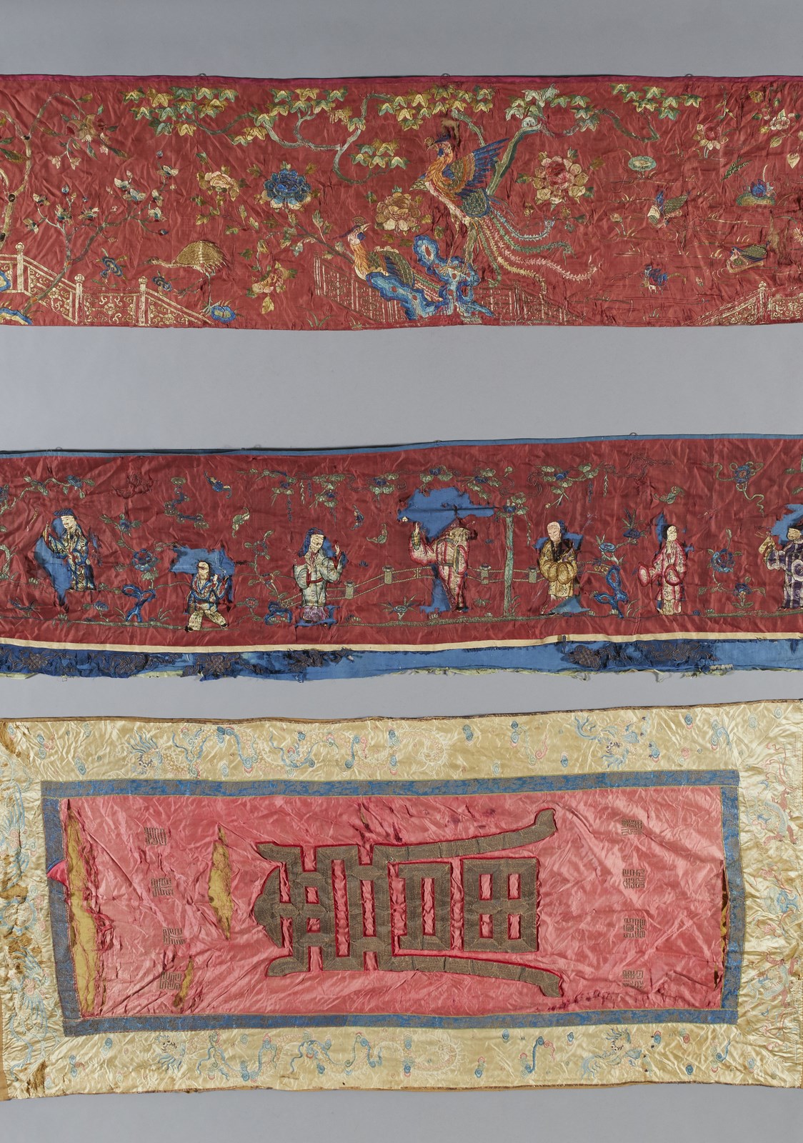 Lotto composto da tre stoffe in seta ricamata Cina, dinastia Qing, XIX secolo