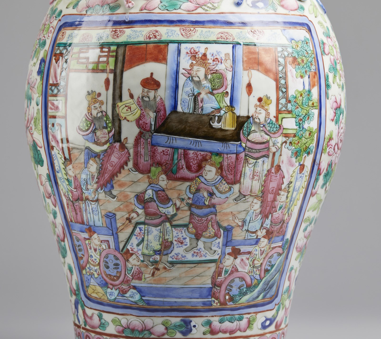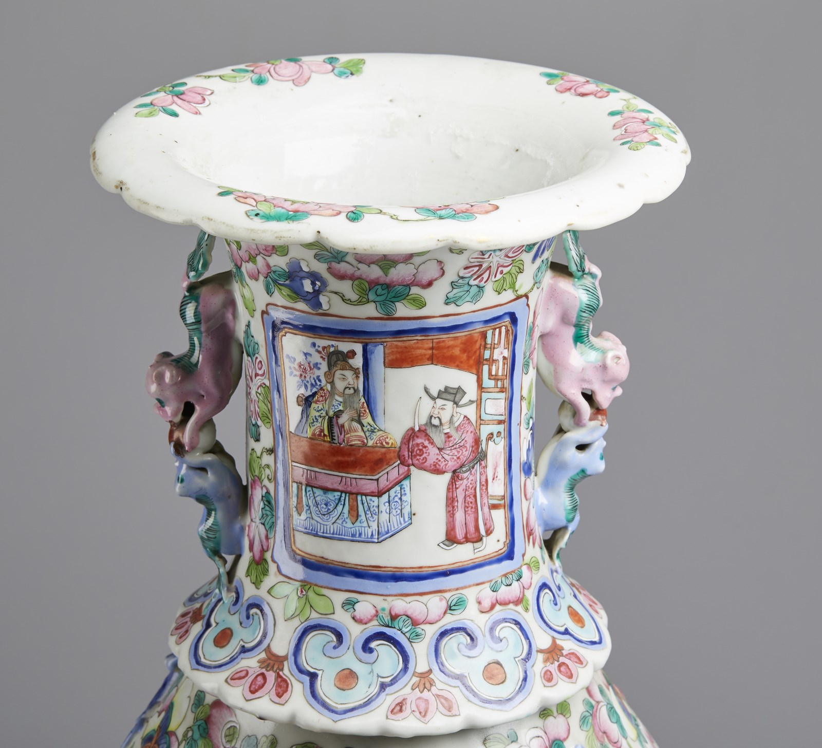 Lotto eterogeneo comprendente:Un vaso a bottiglia in terracotta invetriata di verde e decorata in rilievo con dragoni (h. 35 cm) ed un vaso a balaustro in porcellana famiglia rosa Canton dipinto con scene cortesi.