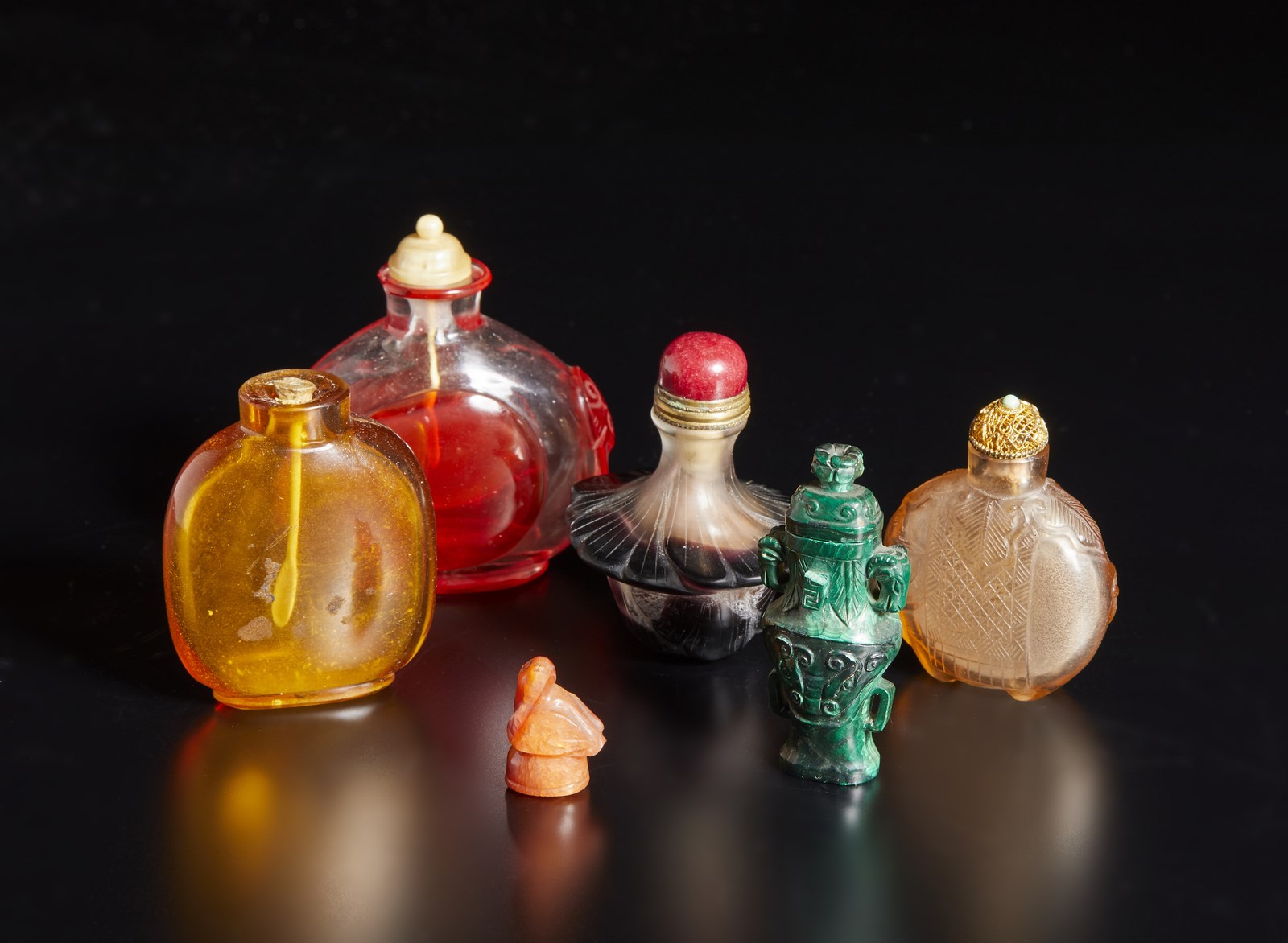 Include:una in malachite con decoro arcaistico. una in porcellana a fiori bianchi su sfondo nero, una in vetro di Pechino con bolle rosse. una in vetro di Pechino con manici a forma di elefanti e tappo in filigrana dorata. una in vetro a forma di frutto. una in corniola (?) decorata con fiori e uccelli intagliati. una in corno (?) decorata con ideogramma ed iscrizioni. una in porcellana flambč ( tappo mancante).una in vetro di Pechino a forma di fiore. una in porcellana lavorata a stampo. una in agata liscia.