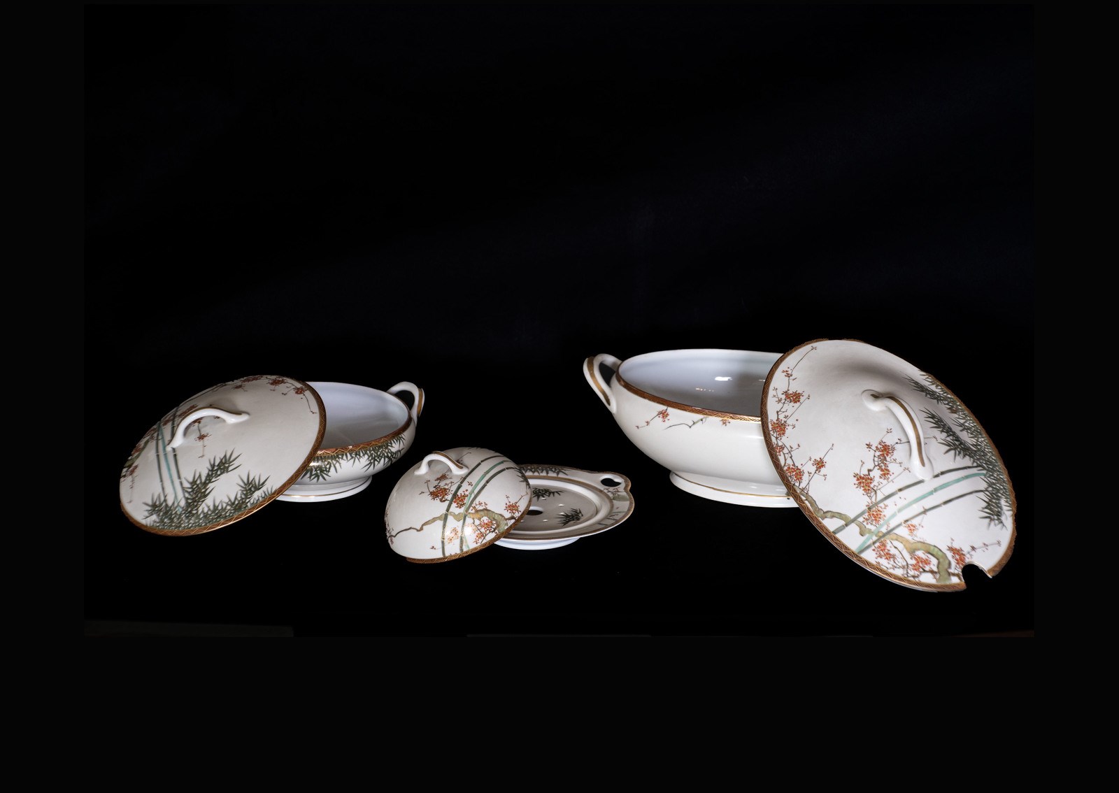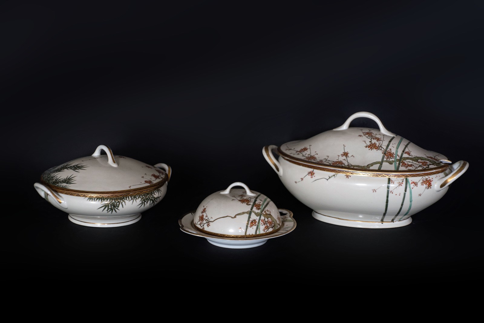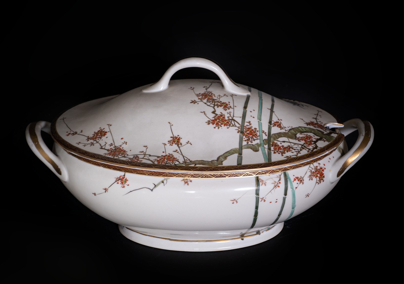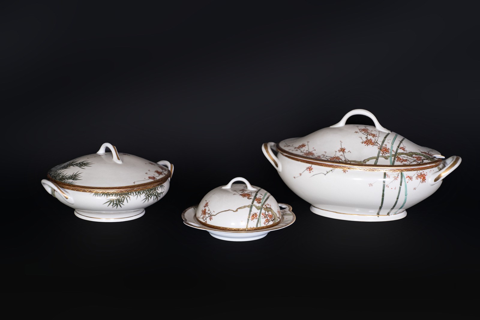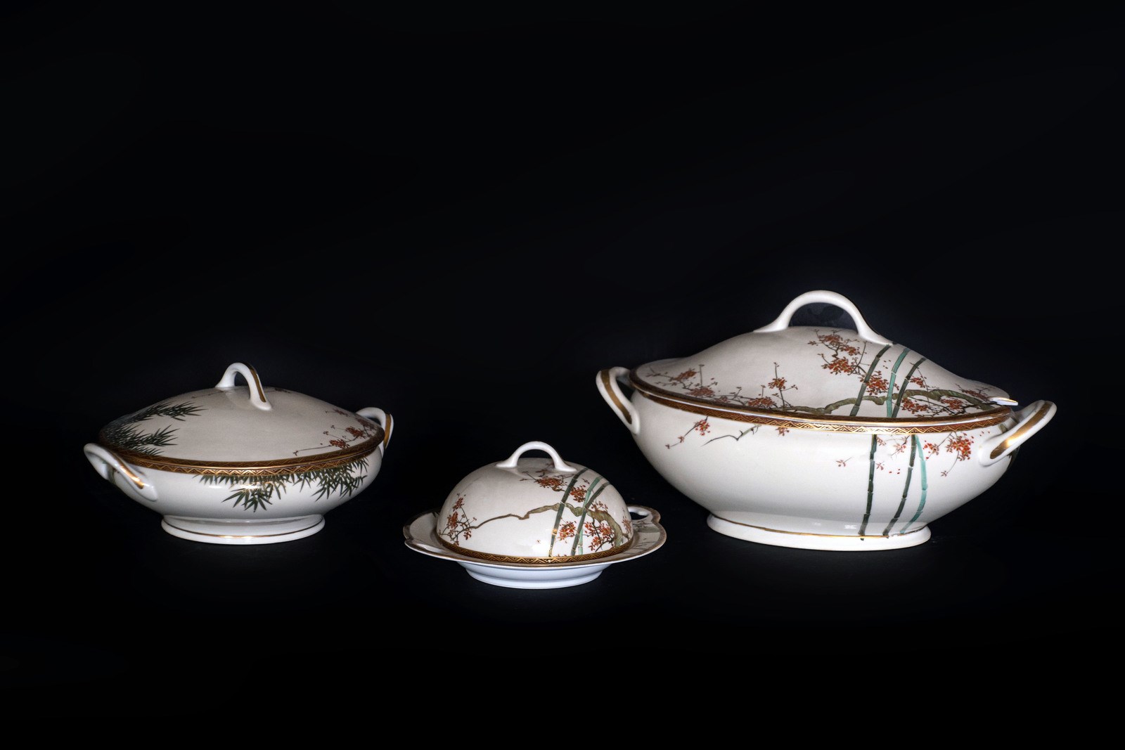 Lotto composto da due zuppiere ed uno scaldavivande in porcellana bianca (forse Arita) con decoro a foglie di bambù e fiori con lumeggiature in oro. Perfette condizioni. Provenienza: Importante famiglia italiana, acquistato in Giappone intorno al 1910.