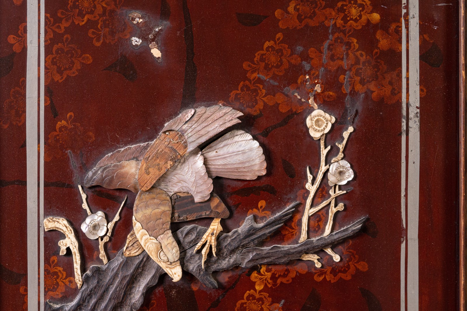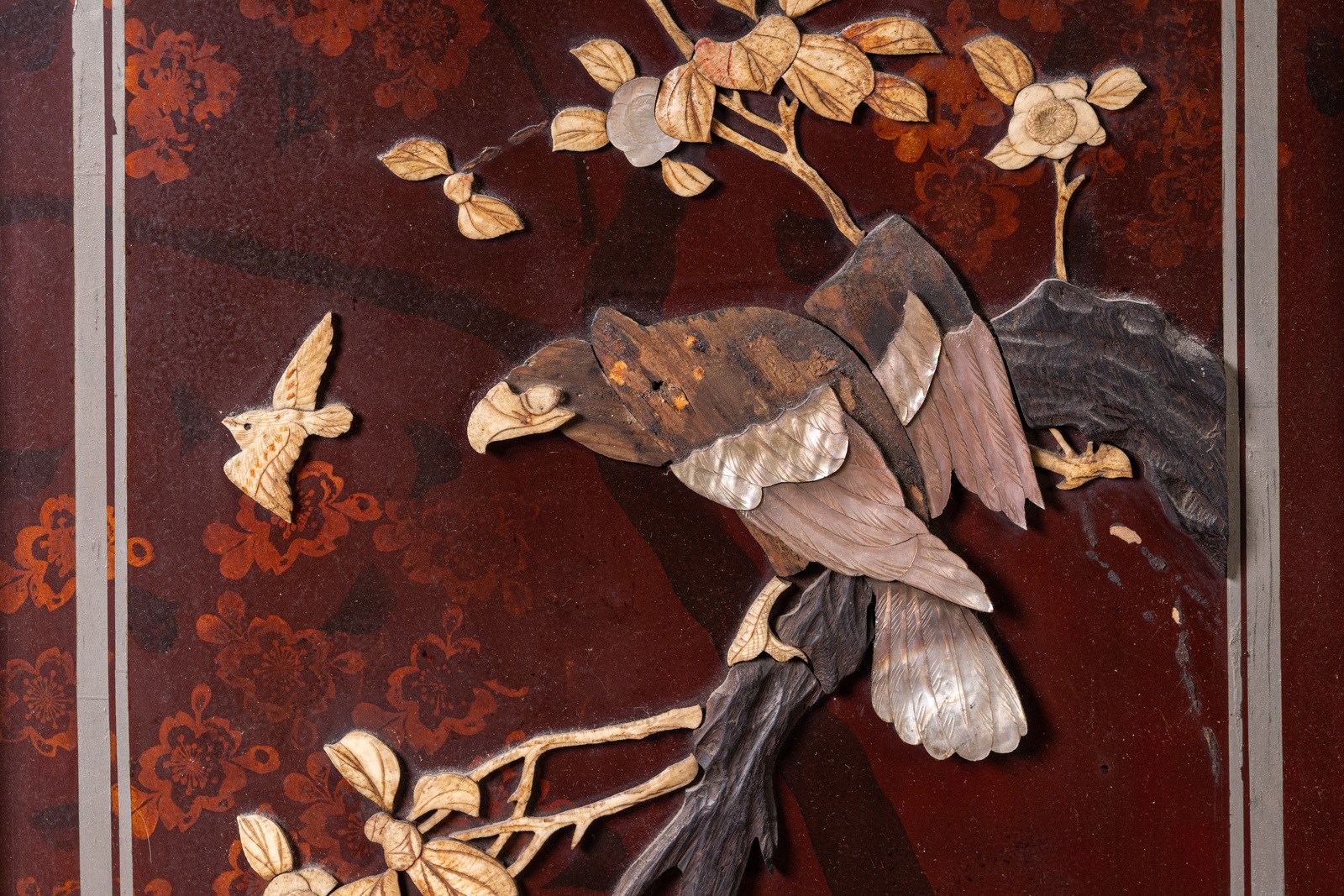 Due pannelli in legno e legno dipinto con decorazione parzialmente a rilievo raffigurante uccelli ricoperti di madreperla su rami fioriti. Altre parti della decorazione sono in resina.Mancanze.