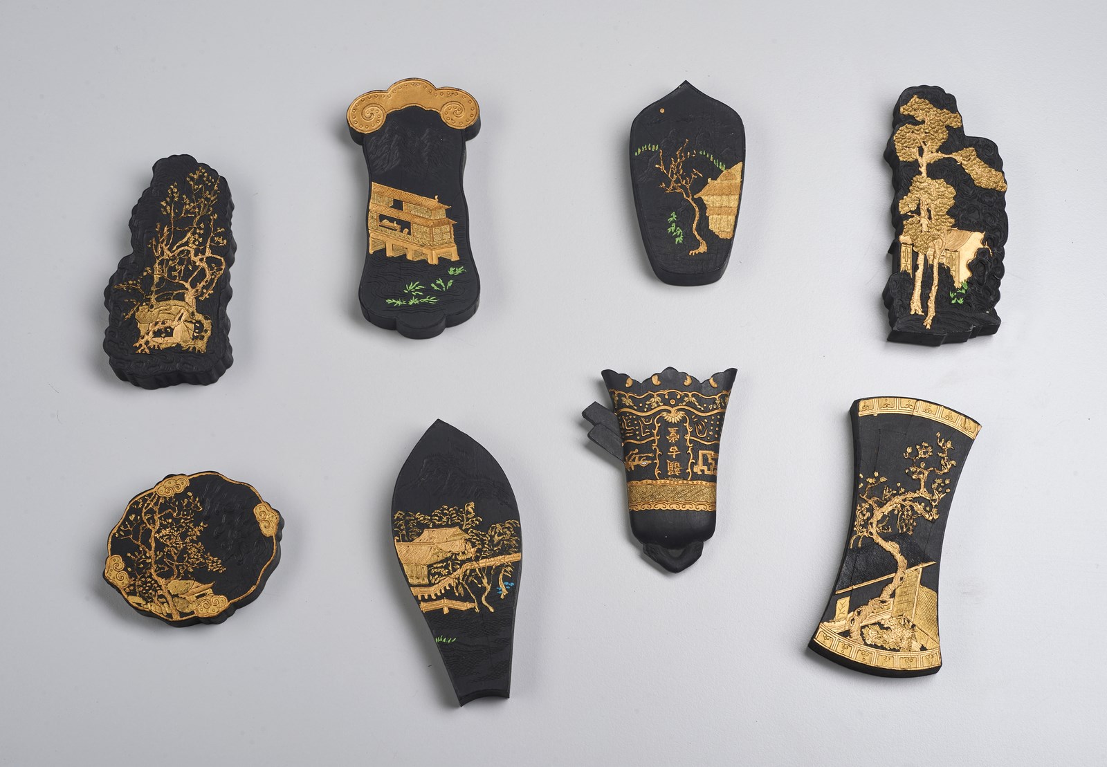 Scatola contenente otto panetti di inchiostro di varia forma e misura decorati a rilievo con iscrizioni lumeggiate in oro. Il panetto più grande misura h.10cm.