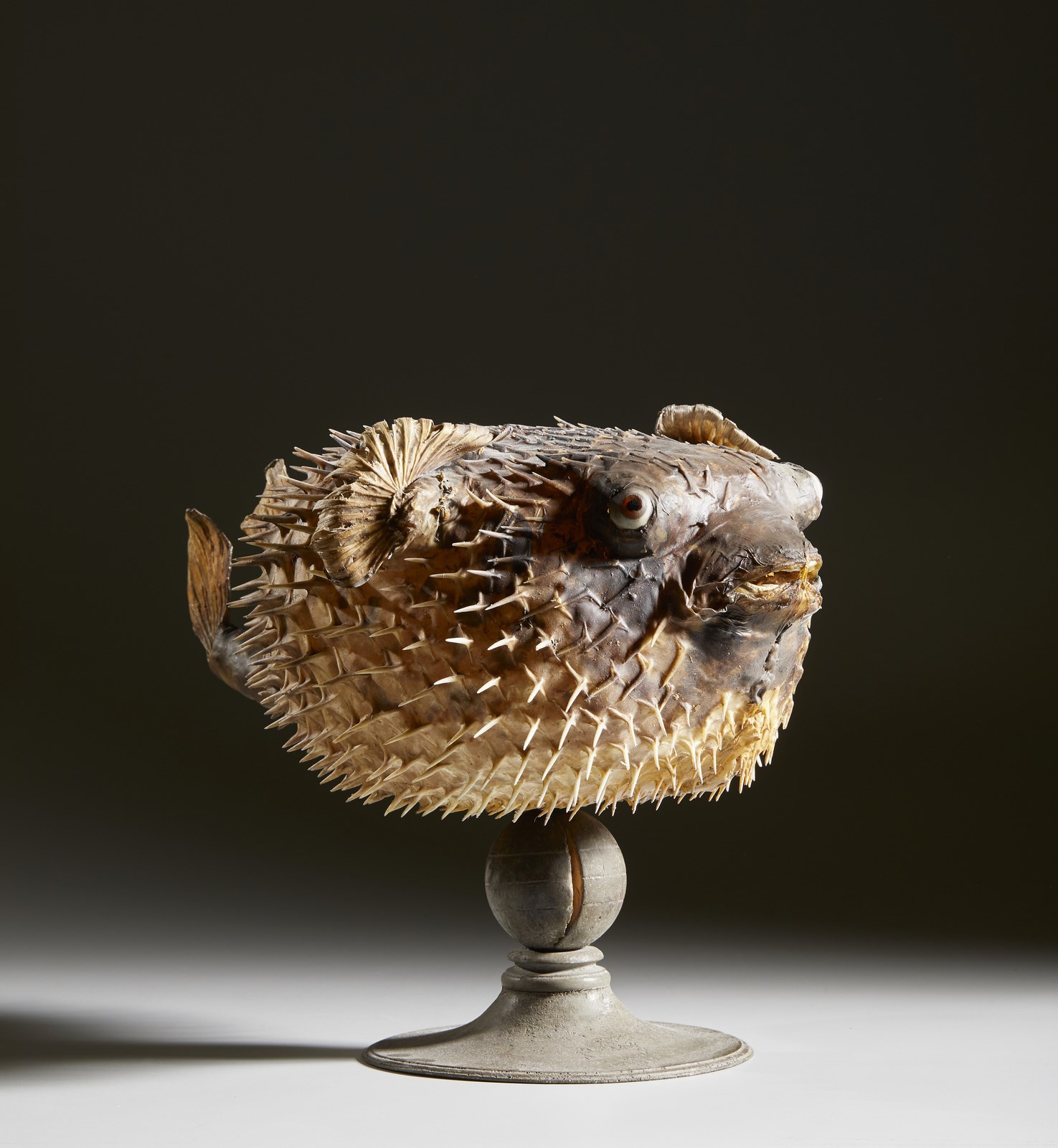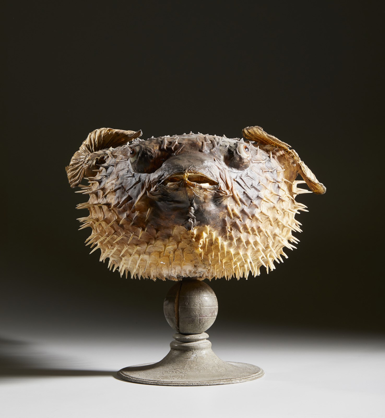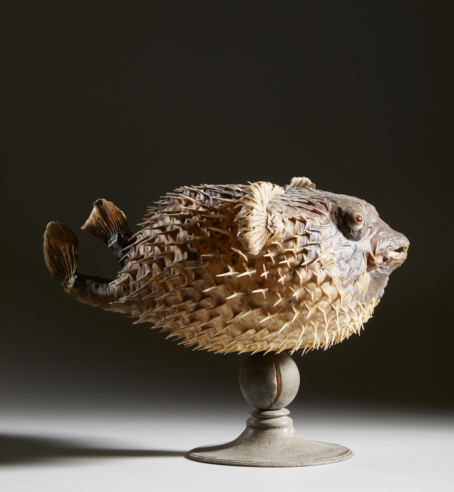 Soprammobile realizzato con un esemplare adulto di pesce istrice (diodon holocanthus) appartenente alla grande famiglia dei tetraodonti coś definiti per la particolare conformazione del loro bizzarra bocca a ''becco'', formata dalla fusione di quattro denti.