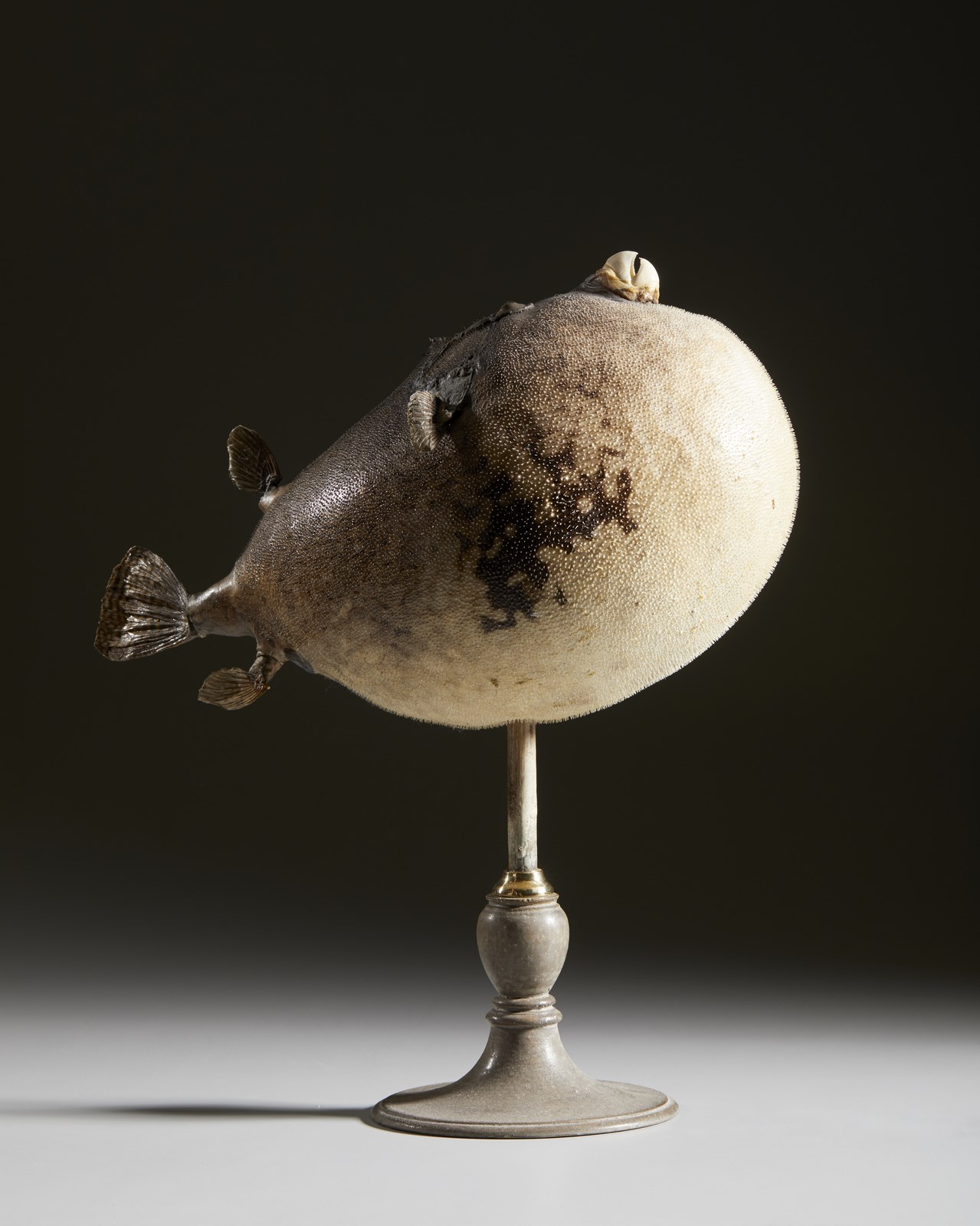 Soprammobile realizzato con un esemplare adulto di tetraodontide montato su base in legno tornito. Il pesce palla, conosciuto in giappone con il nome di fugu, contiene una potente neurotossina che rende le sue carni altamente tossiche se non preventivamente private degli organi che la contengono, soprattutto fegato, interiora e pelle.