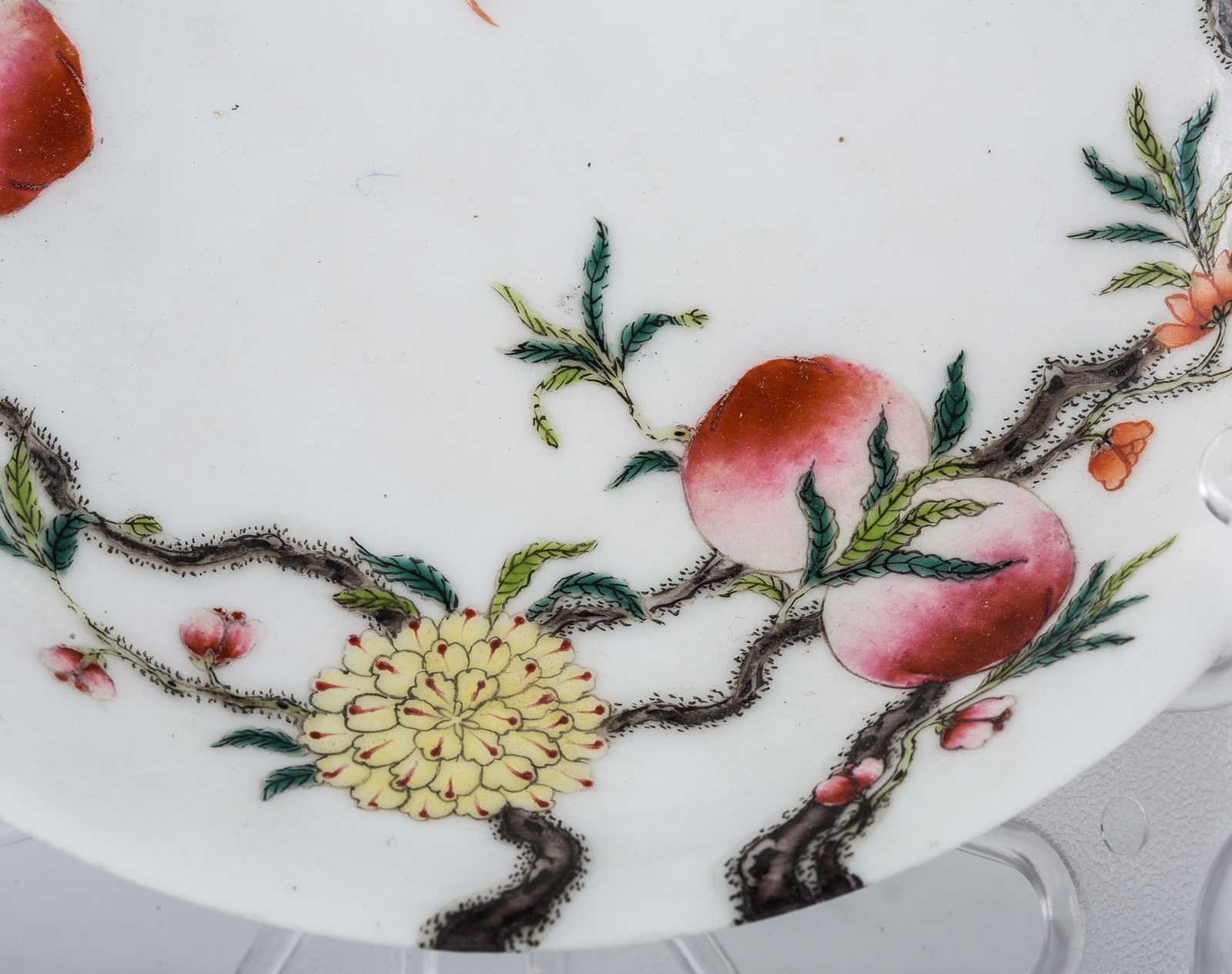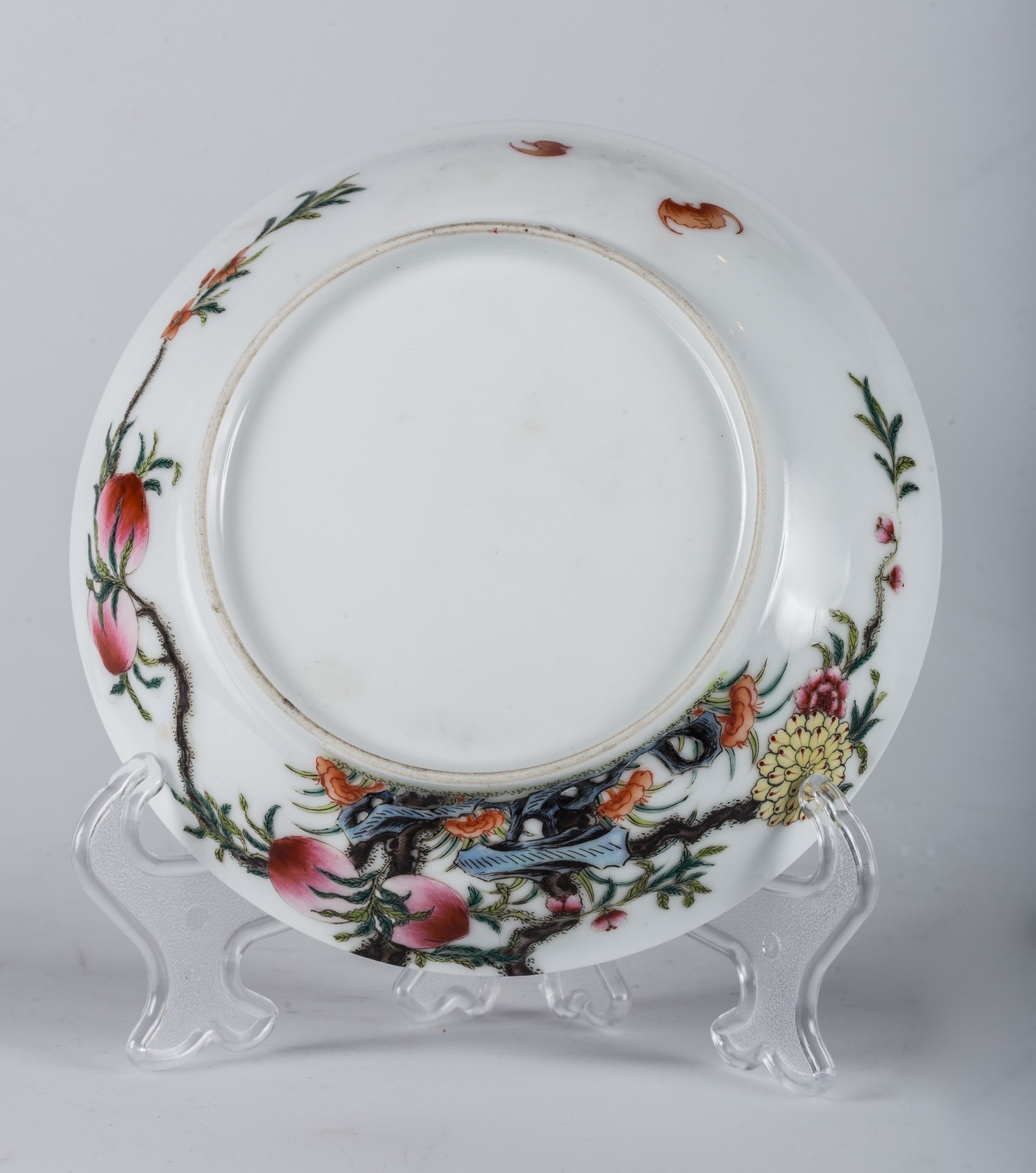 Piatto in porcellana famiglia rosa dipinto con pesche Cina, dinastia Qing, marcato [..]