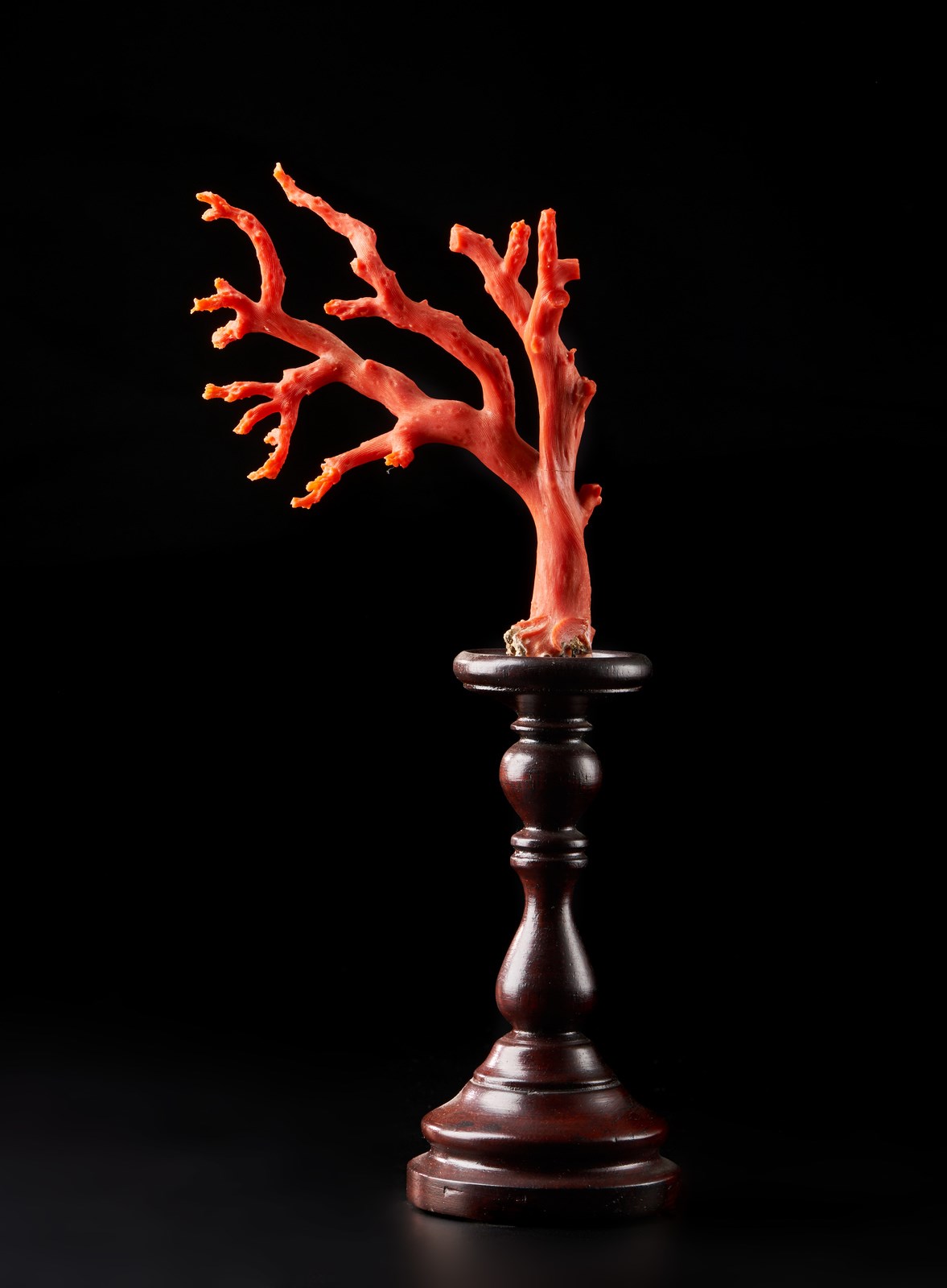 Piccolo ramo di corallo rosso su base in legno Italia