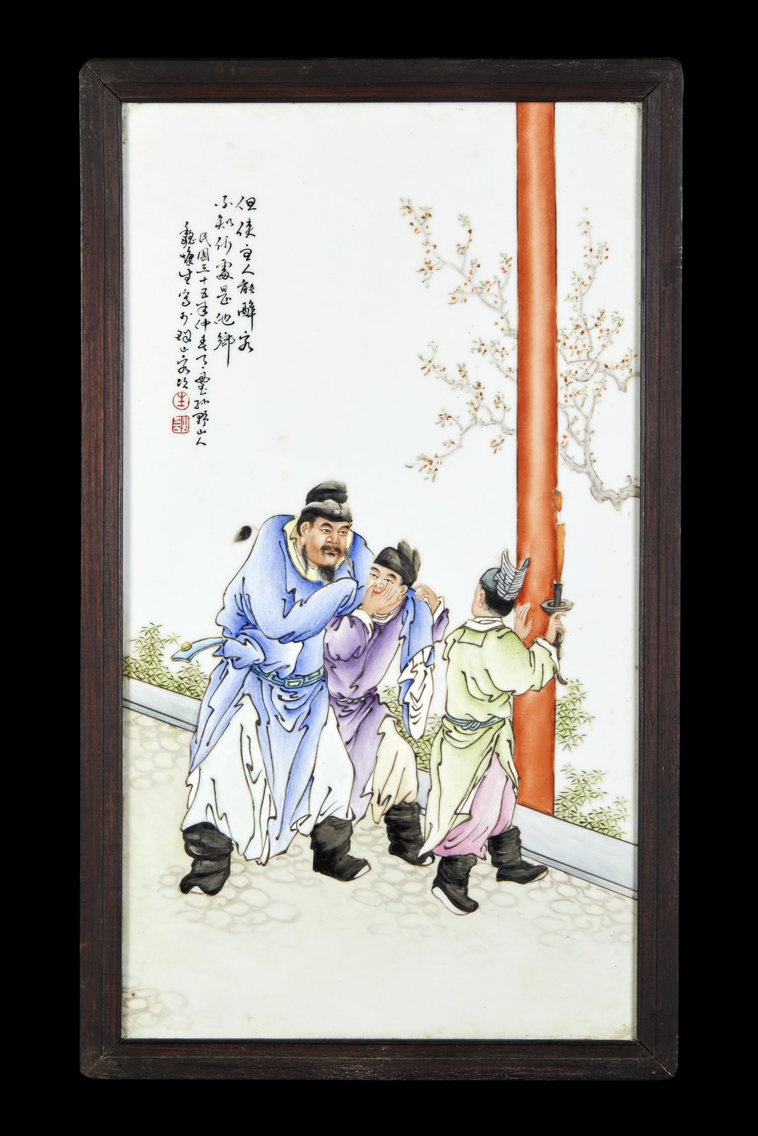 Placca quadrangolare in porcellana bianca con decoro policromo raffigurante gruppo di personaggi in abiti tradizionali in un esterno.