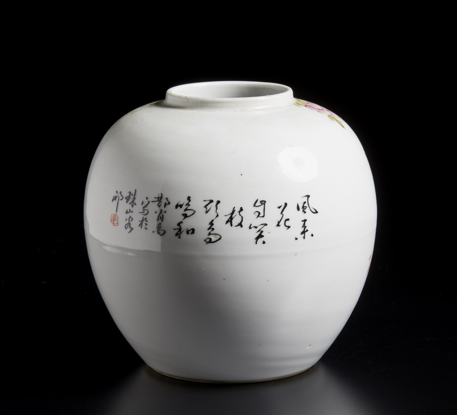 Contenitore globulare decorato con rami fioriti e lunga iscrizione sul retro.