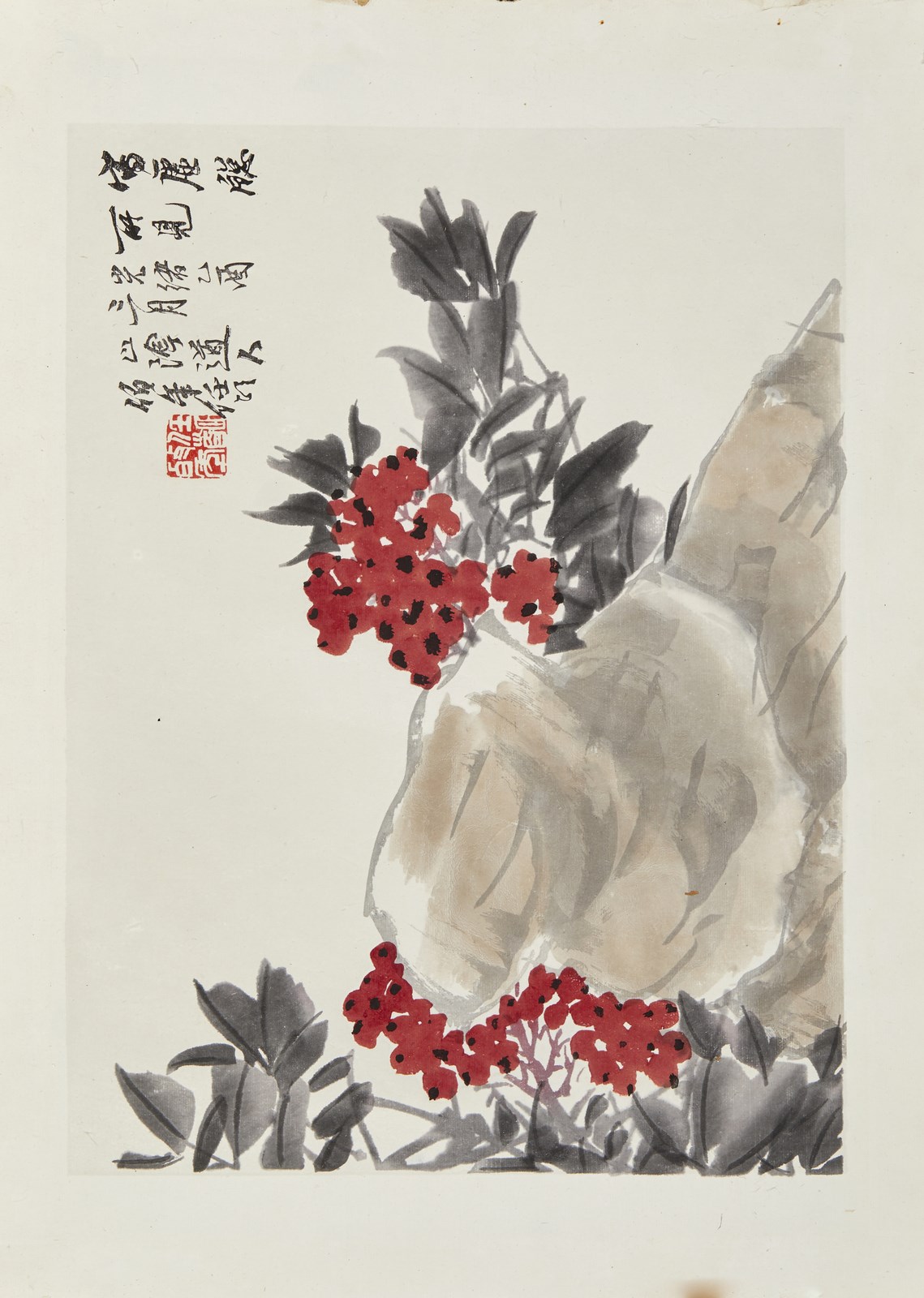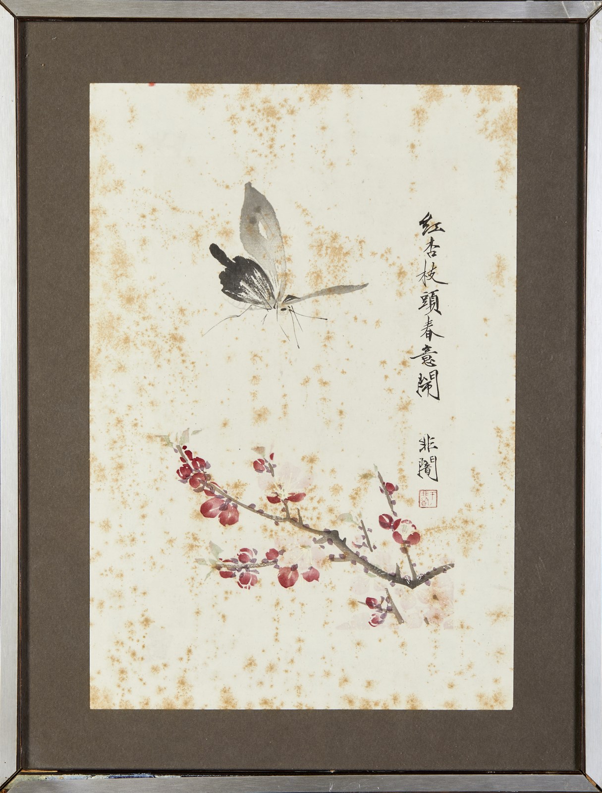 Lotto composto da un dipinto con scena erotica in un interno domestico (h.30x30cm), un dipinto ad inchiostro raffigurante una libellula in volo sopra un ramo fiorito di pruno (h.36,5x25 cm), una stampa con fiore di loto(h.26x35,5 cm) e una stampa con pianta di peonia fiorita e rocce.