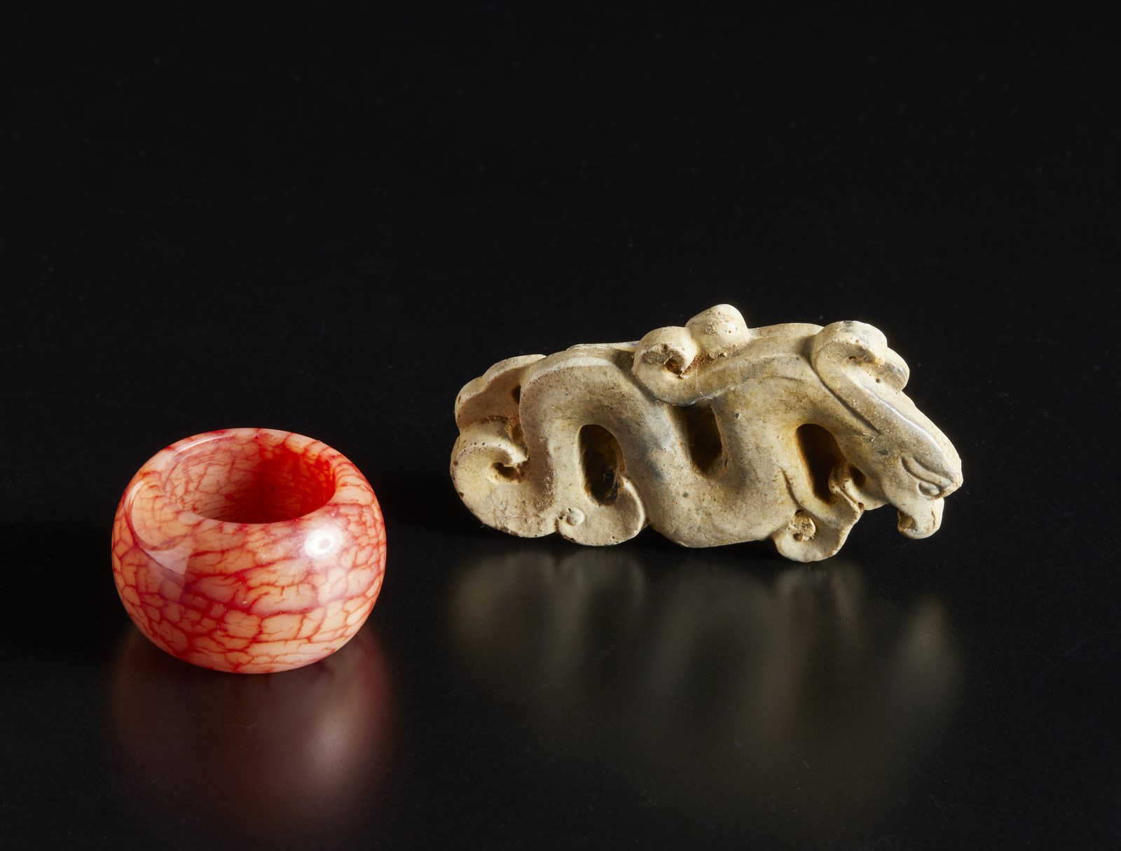 Lotto composto da quattro manufatti in giada: un anello, un pendente in stile arcaico, un qilong ed un pendente circolare in forma di dragone.