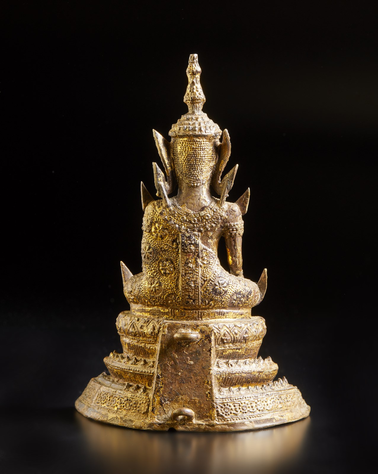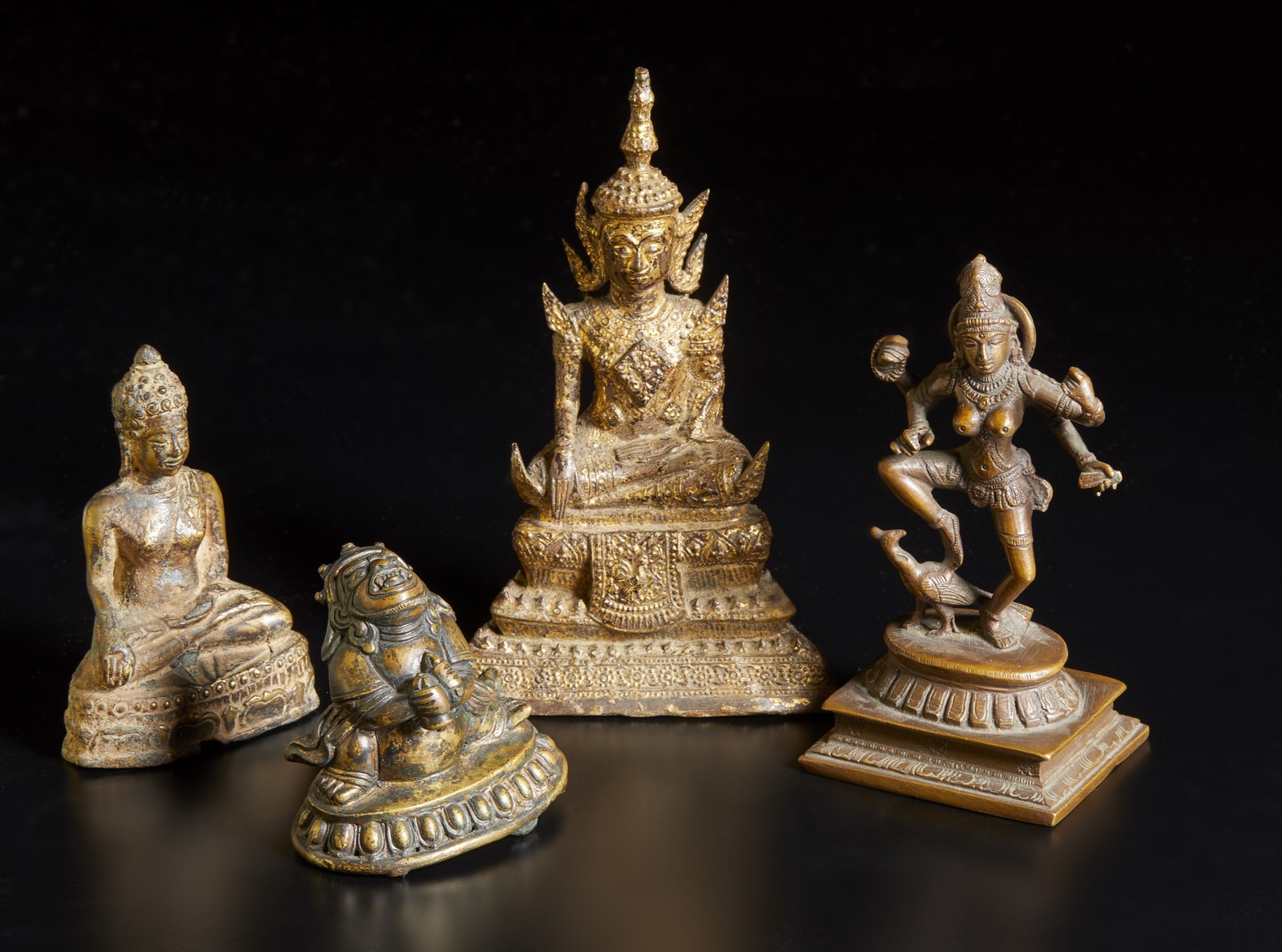 Lotto composto da quattro fusioni in bronzo di diversa epoca e provenienza. Il lotto comprende: un buddha assiso (h. 11,5 cm), una fusione raffigurante Kubera (h. 7 cm, iscrizione incisa sul retro in devanagari), un buddha thailandese dorato (h. 18,5 cm) ed un bronzetto indiano raffigurante Sarasvati danzante (h. 15,2 cm)