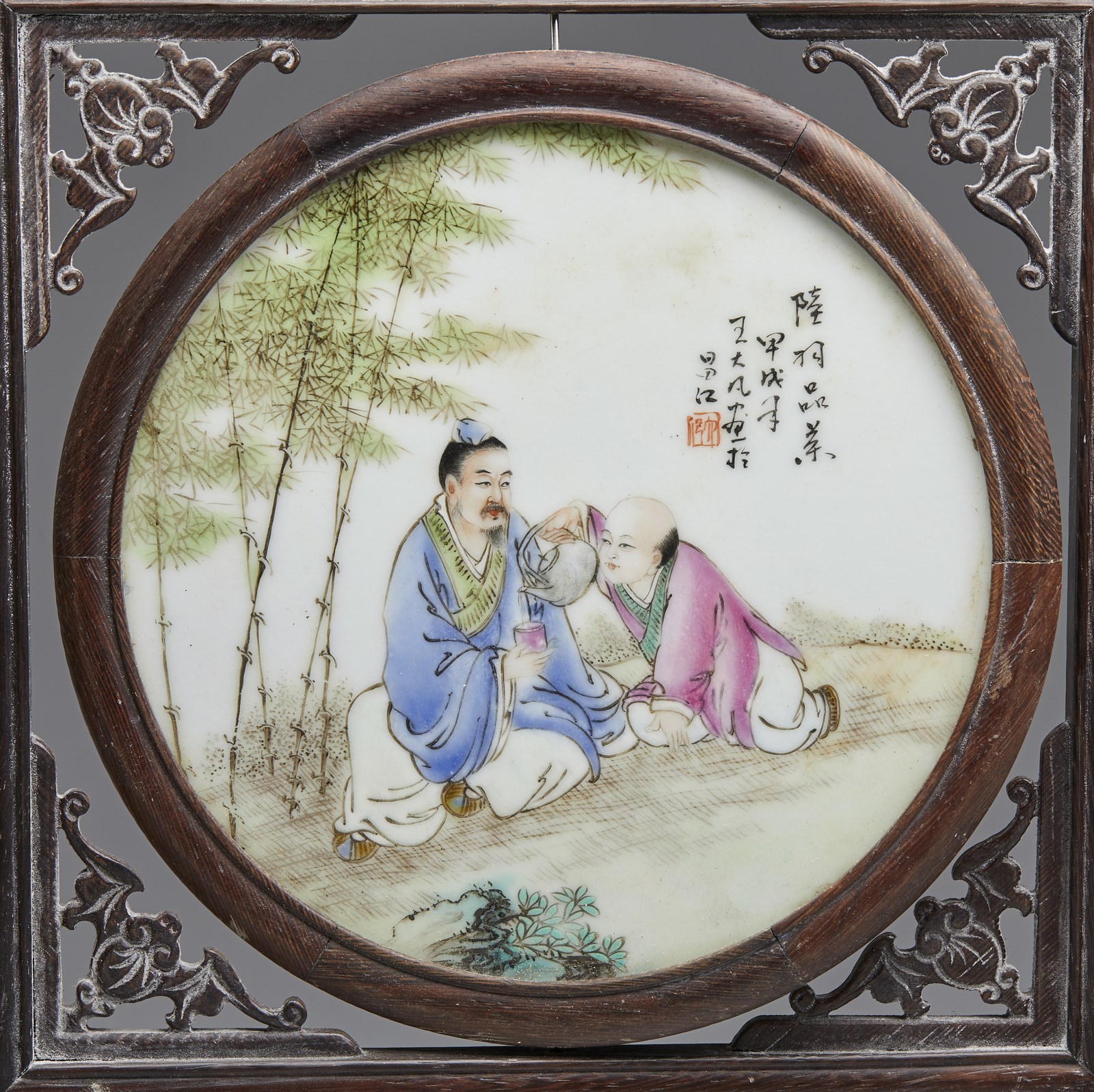 Elemento decorativo con montatura in legno intagliato a traforo con motivi vegetali intrecciati che ospita una placca in porcellana (diam 20 cm ca.) dipinta nei colori della famiglia rosa con letterato ed attendente in esterno. Iscrizione e sigillo in alto a destra.