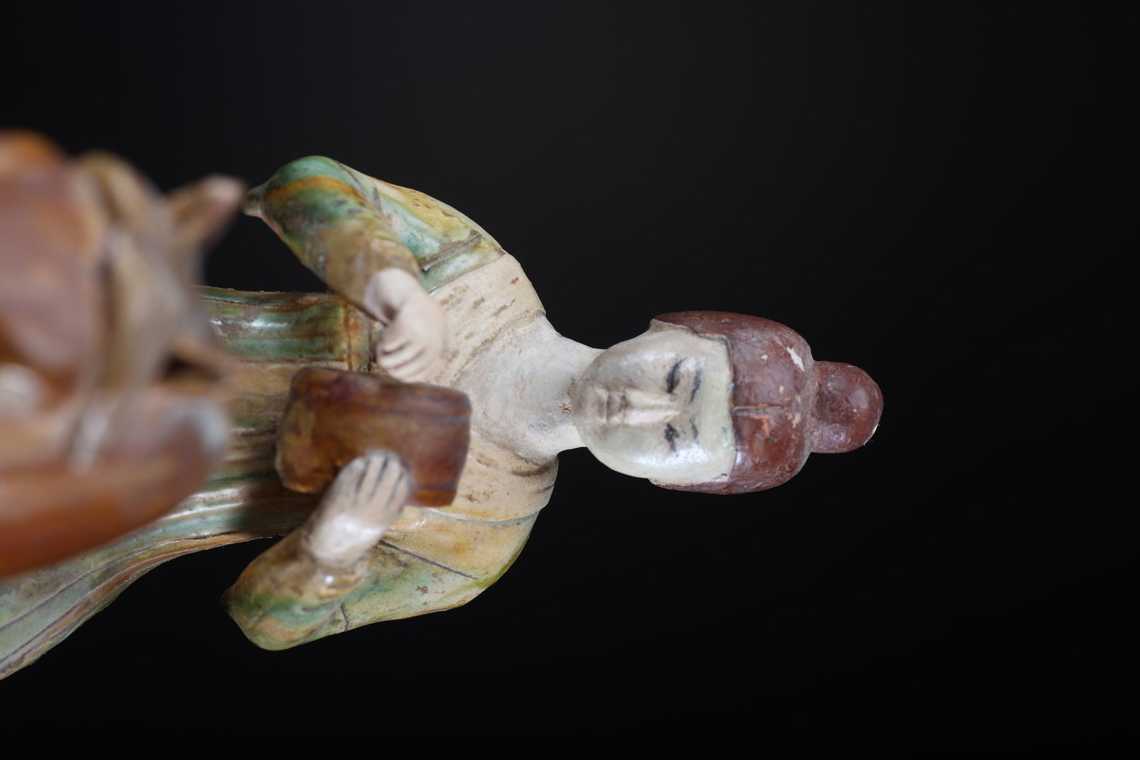 Scultura di donna a cavallo in ceramica invetriata nei colori sancai nello stile [..]
