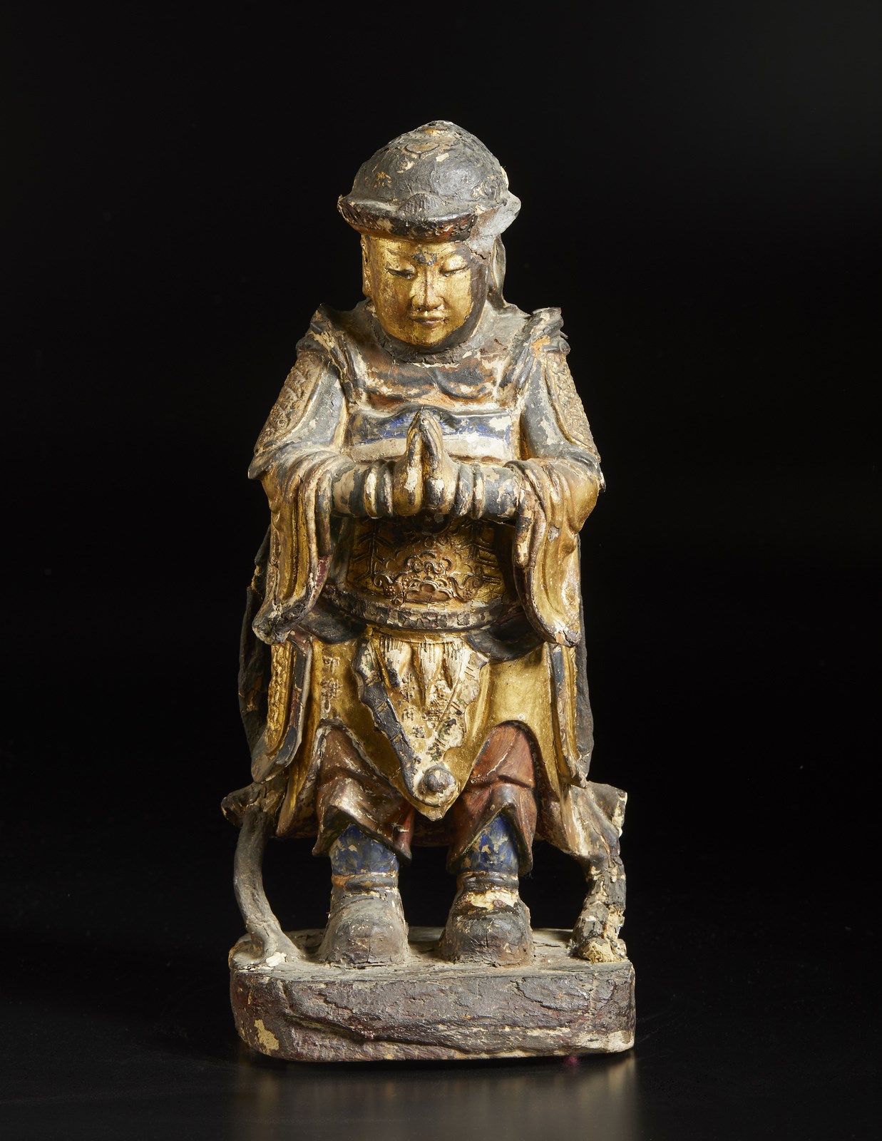 Intaglio in legno laccato e dorato raffigurante il guardiano buddista in abiti sontuosi ed atteggiamento devozionale.