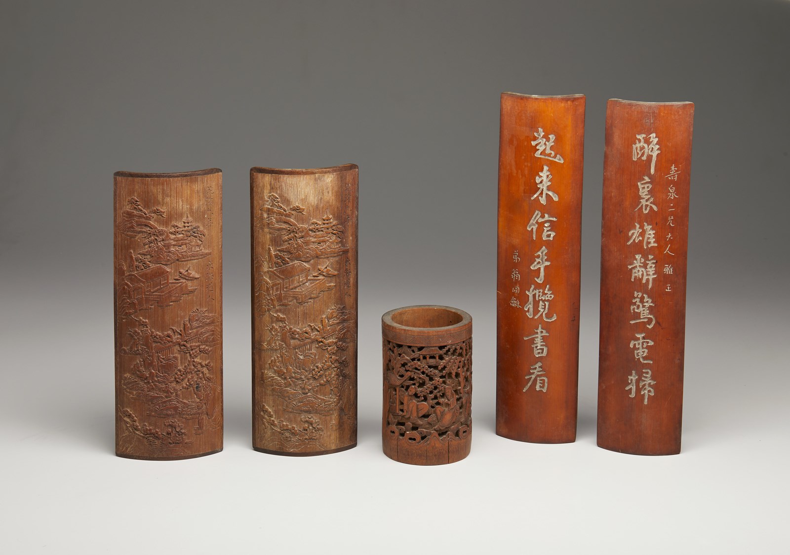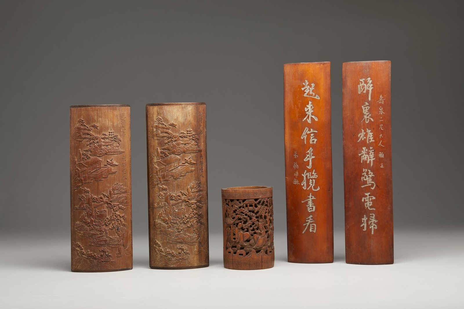 Il completo include: una coppia di poggia braccia intagliati con iscrizione ( l. 32,5 cm) , un'altra intagliata con paesaggio (l. 26, 5 cm) ed un bitong in bamboo (h. 12,5 cm ) intagliato con motivi zoomorfi.