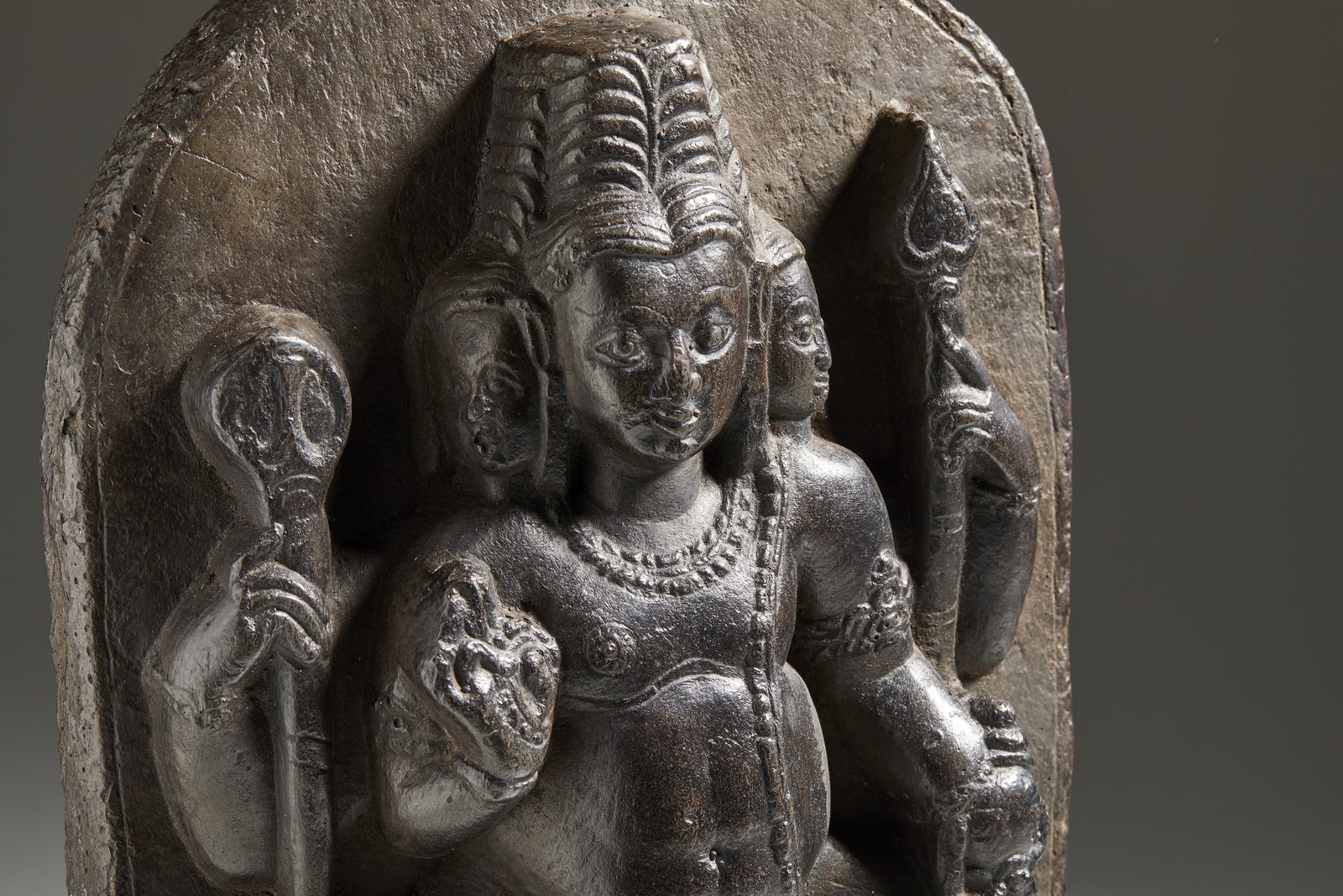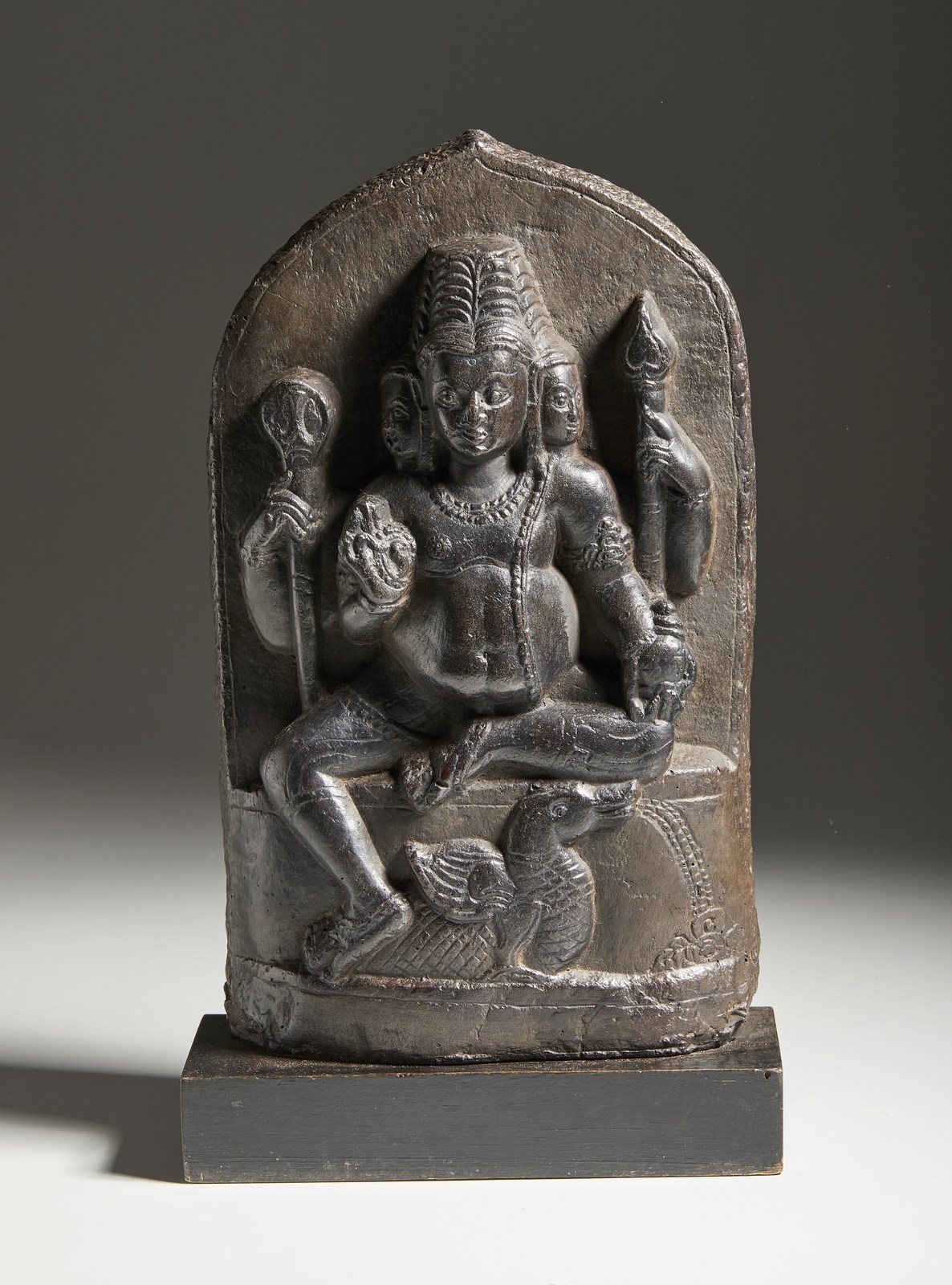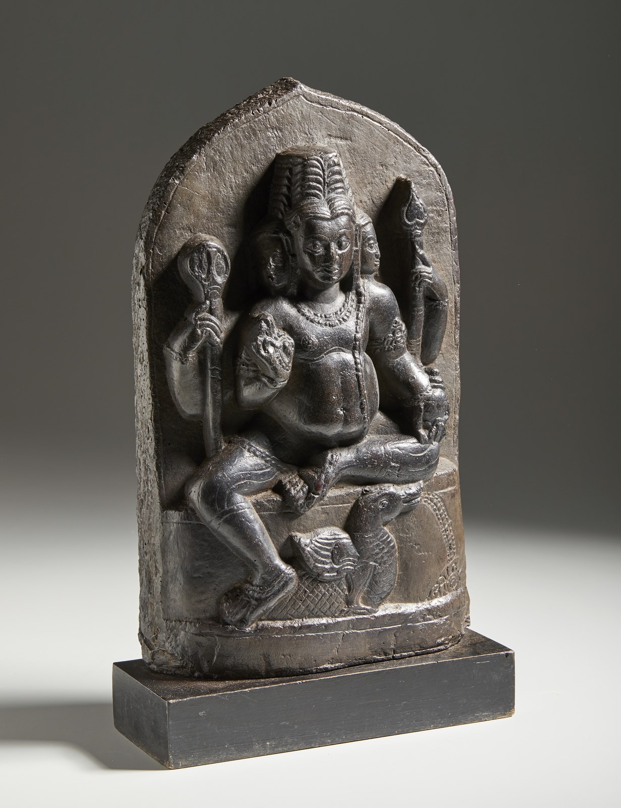 Altorilievo in pietra nera raffigurante il condottiero figlio di Shiva con i suoi attributi e a cavallo della sua cavalcatura.