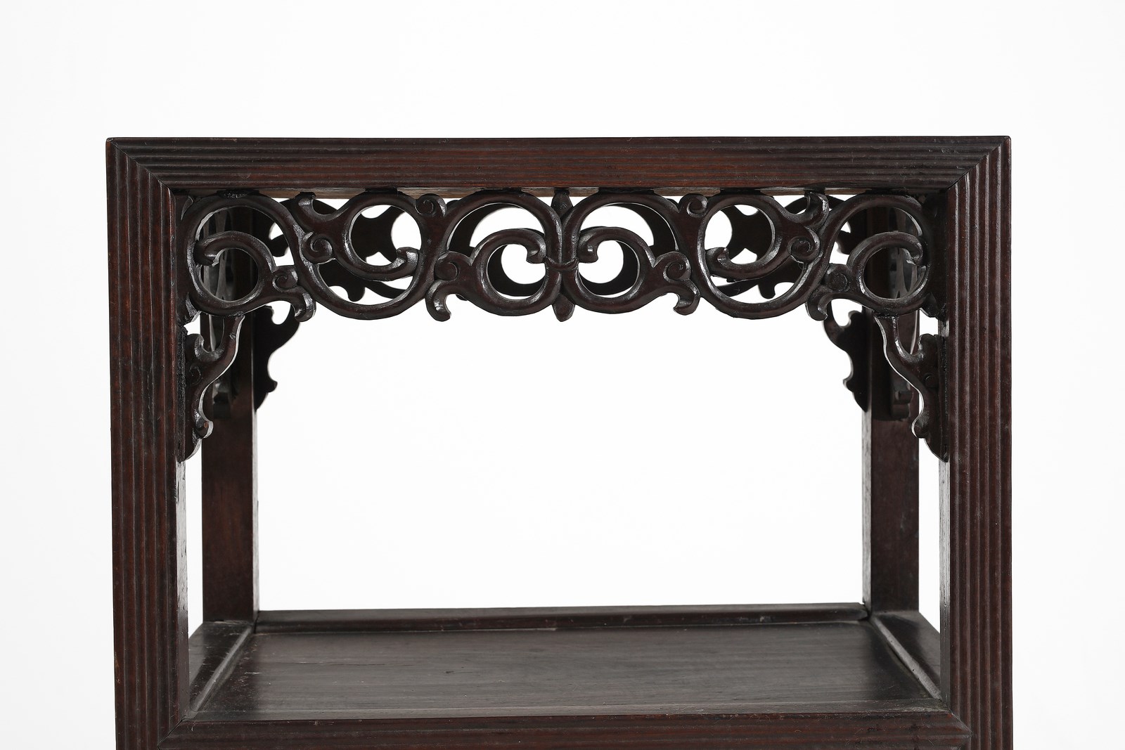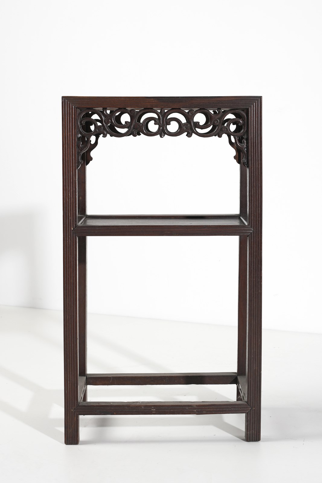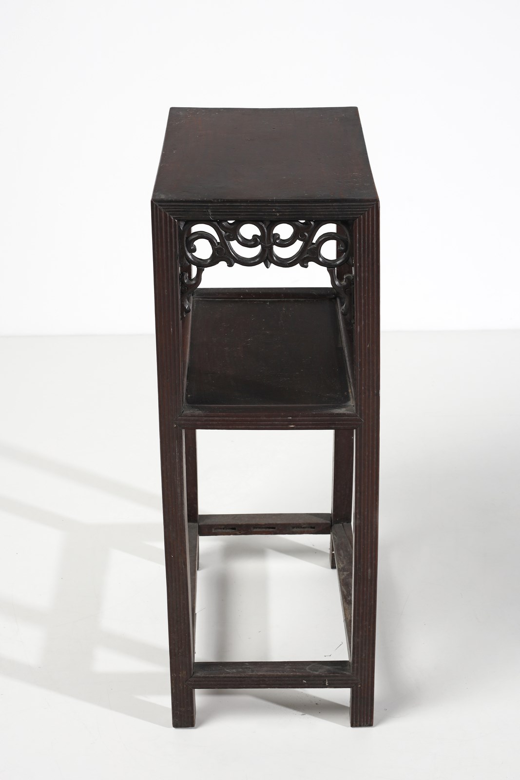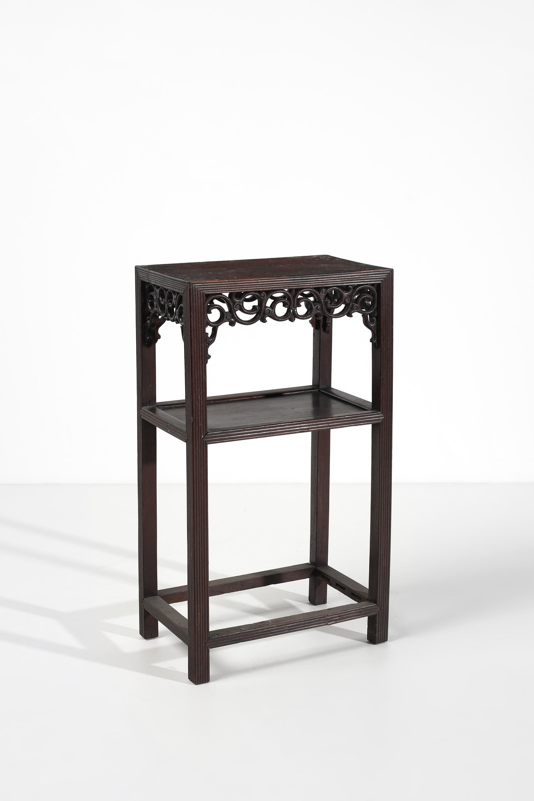 Tavolino in legno duro intagliato con doppio piano d'appoggio, i profili costolonati e decorazione vegetale a traforo.