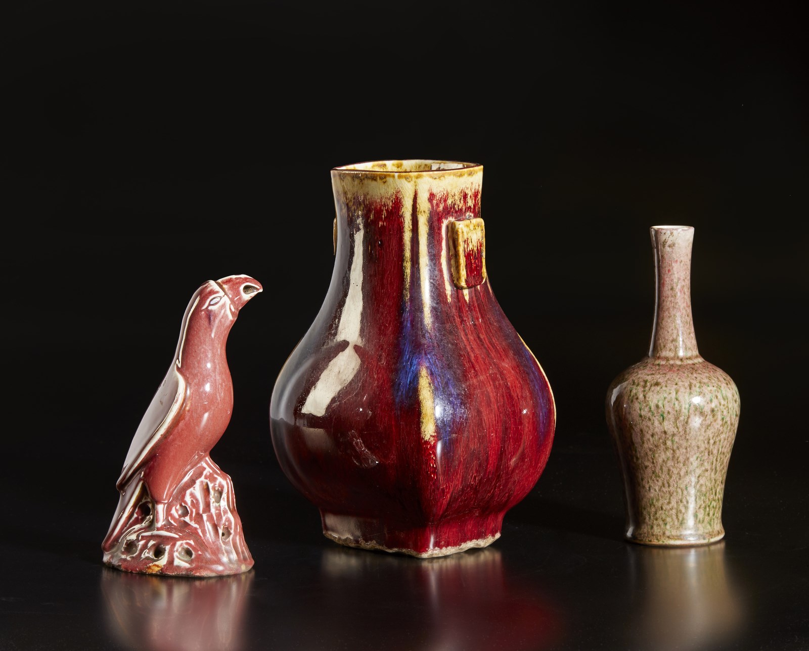 Lotto composto da tre porcellane a spessa invetriatura rossa: un vaso a freccia sangue rosso flambč yao bian, un vaso a collo lungo yao bian ed un pappagallo sangue di bueIl piů alto ha le misure indicate.