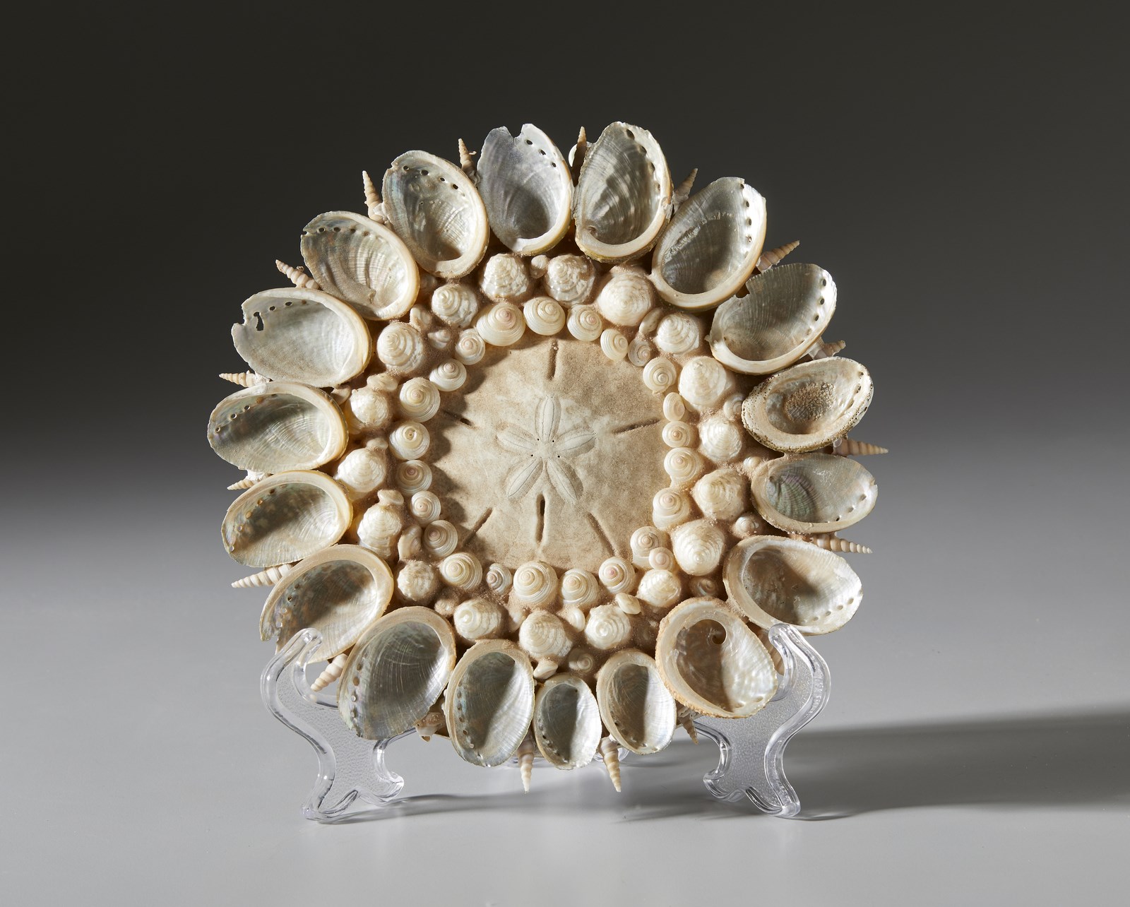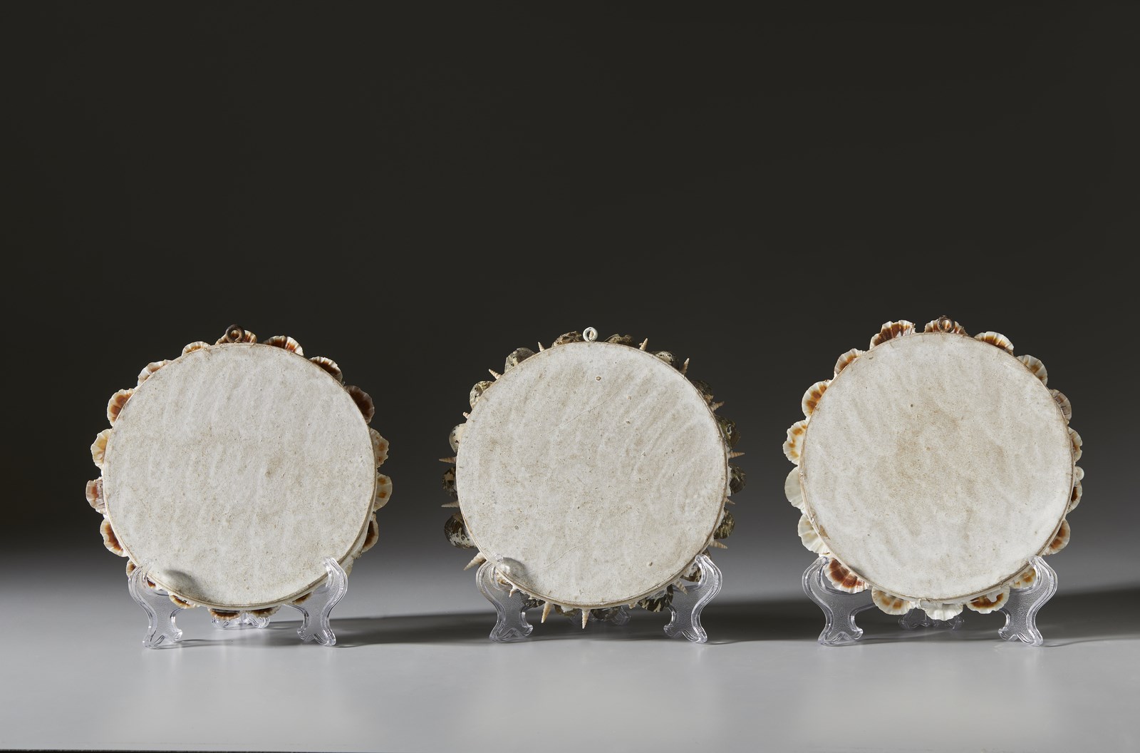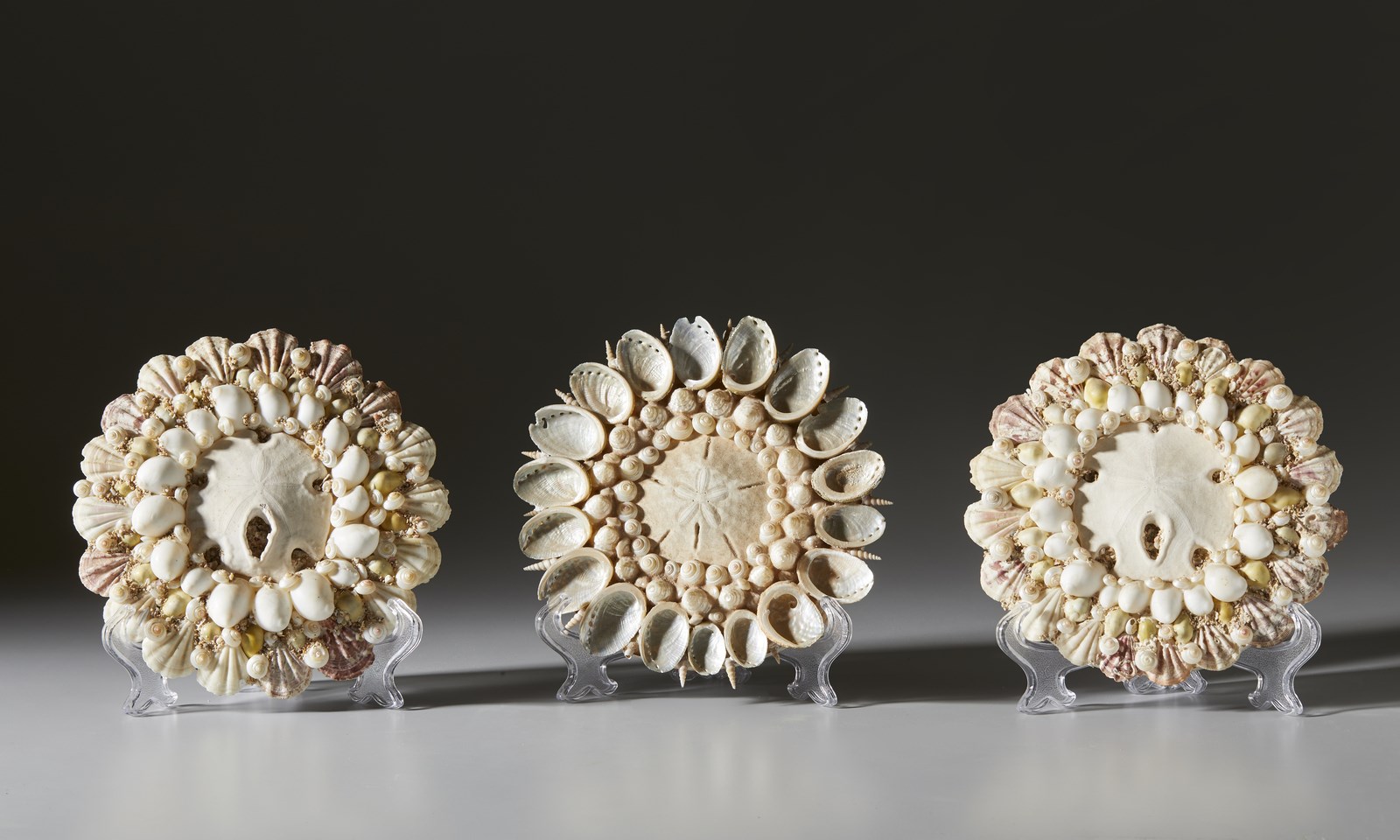 Tre manufatti realizzati con gusci di conchiglia e di riccio marino a formare complessi girali decorativi.