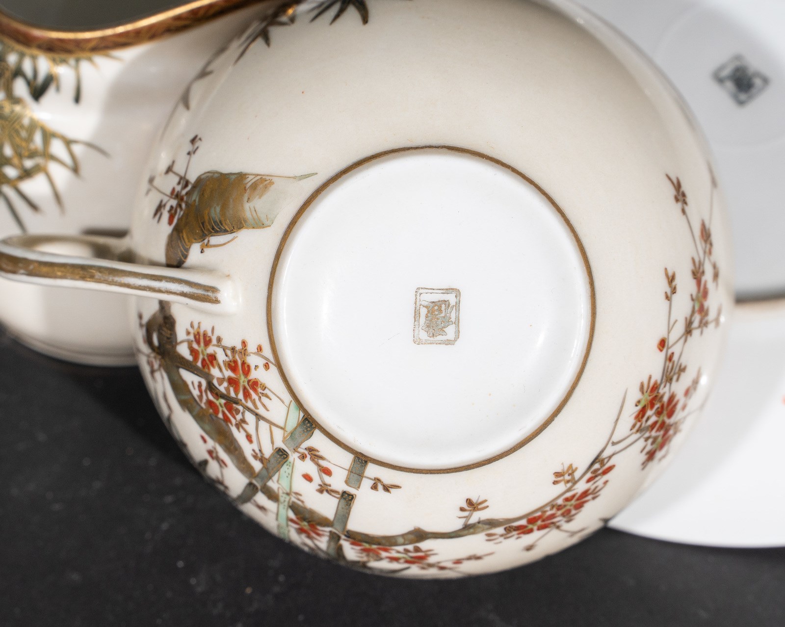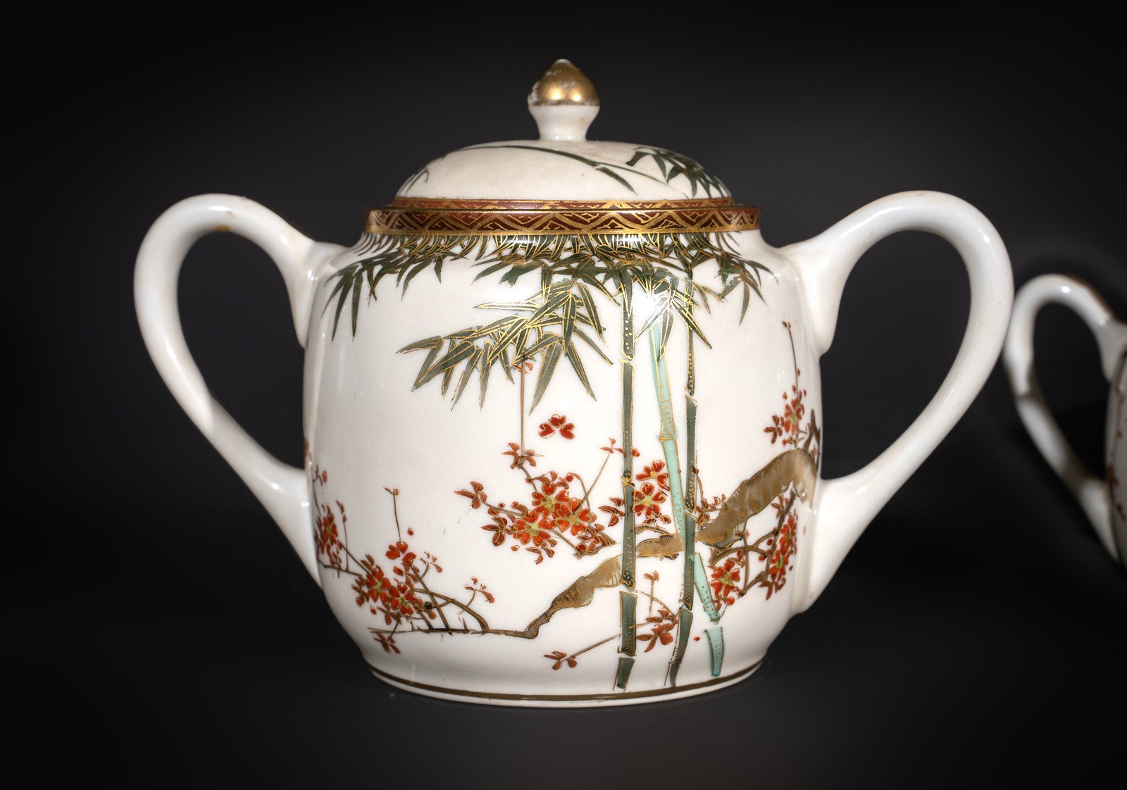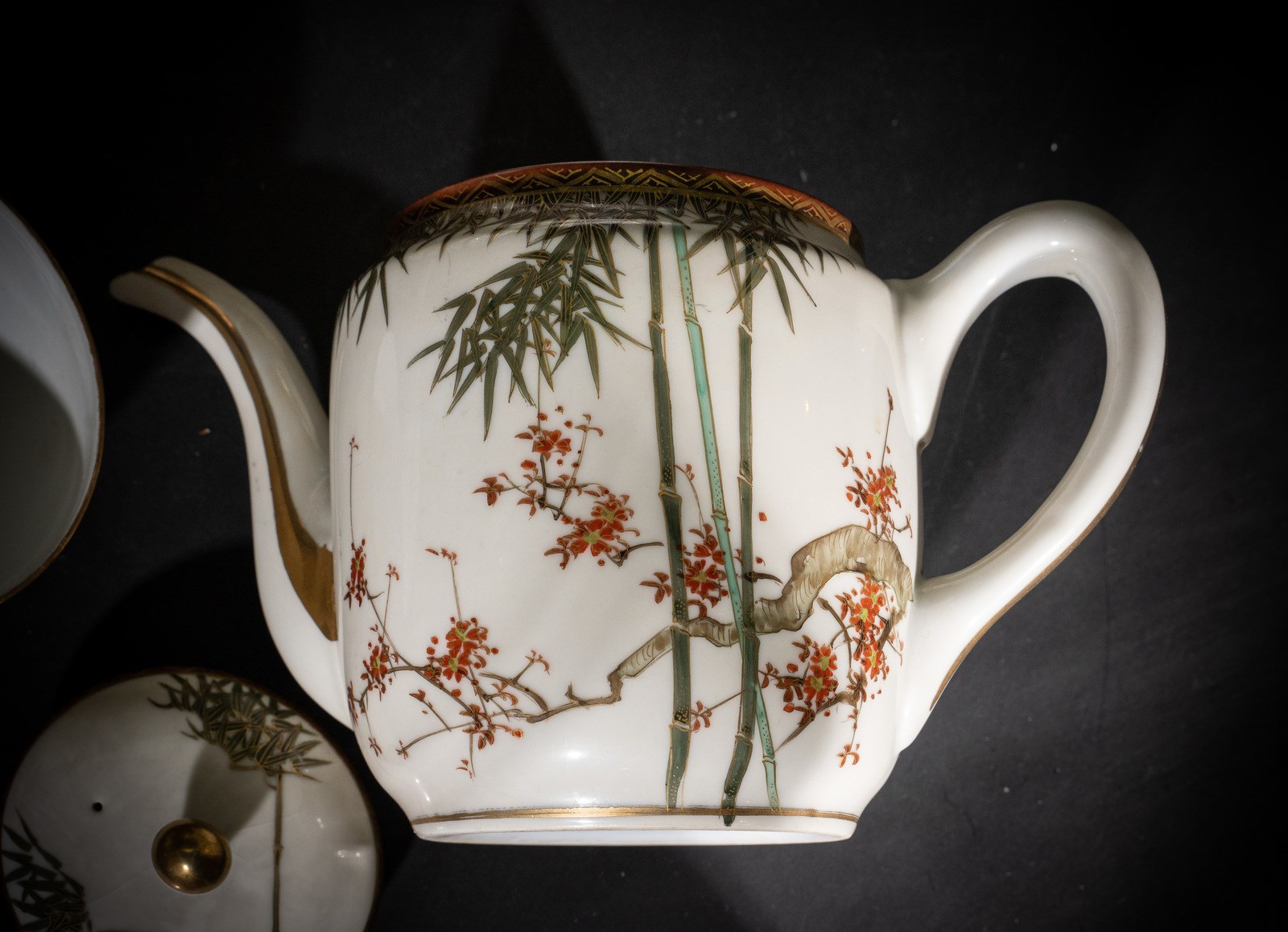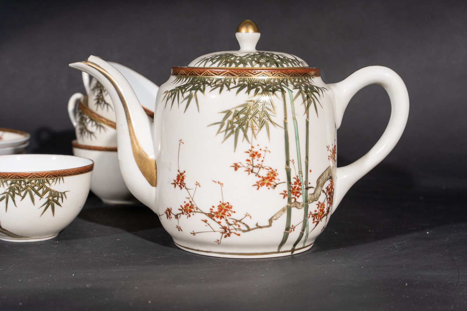 Lotto composto da otto tazze con piattino, una zuccheriera, una teiera ed un bricco per limone in porcellana bianca (forse Arita) con decoro a foglie di bambù e fiori con lumeggiature in oro. Perfette condizioni. Provenienza: Importante famiglia italiana, acquistato in Giappone intorno al 1910.misura tazza: 5,4x9,5misura piattino: 2x14,8misura zuccheriera: 13x17,5misura teiera: 15,5x23,5misura bricco: 7,5x10