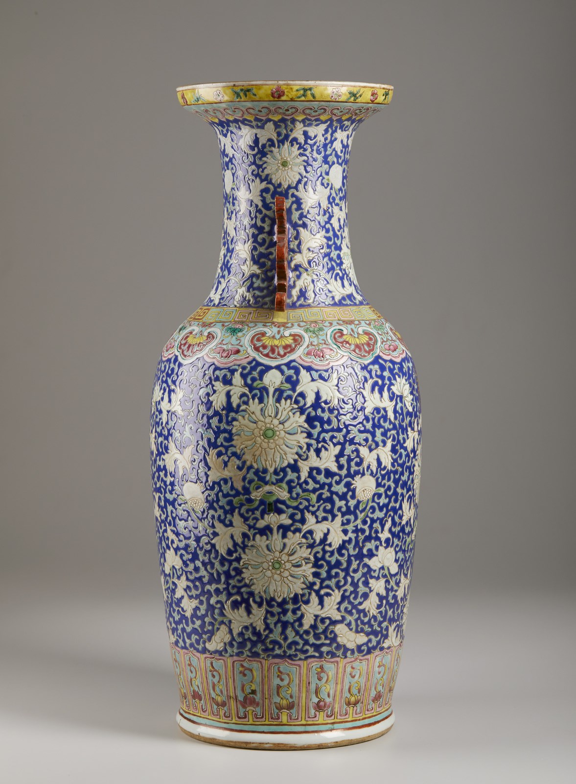 dalla caratteristica forma a balaustro con orlo superiore strombato, la superficie decorata con peonie e tralci vegetali su sfondo blu. Coppia di manici color corallo sagomati a chilong.