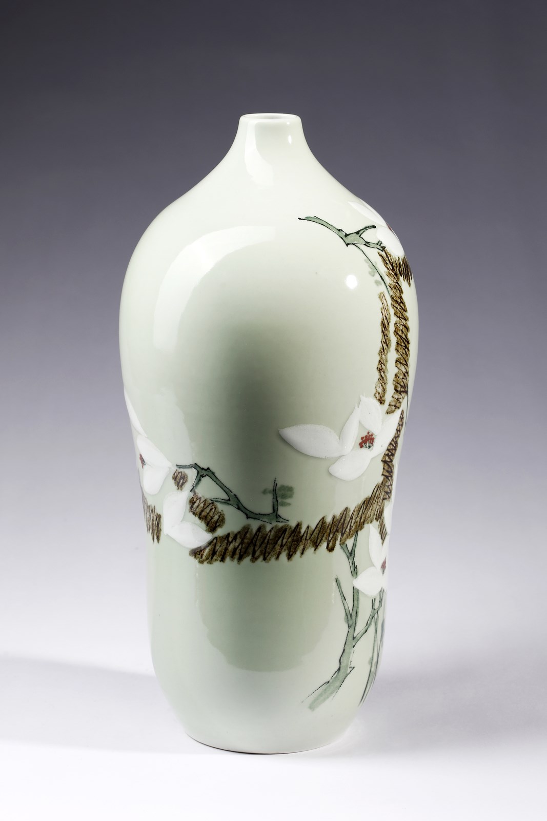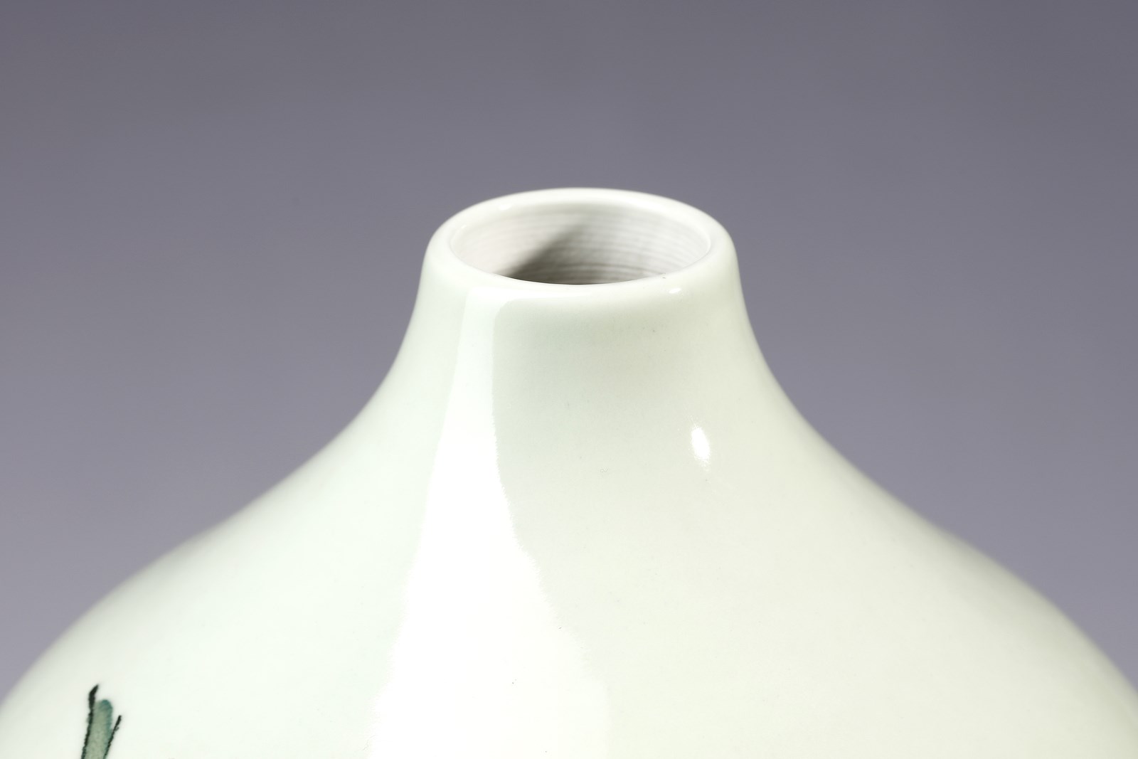 Vaso a zucca in porcellana a smalto verde pallido con decorazione dipinta in stile calligrafico ed iscrizione.