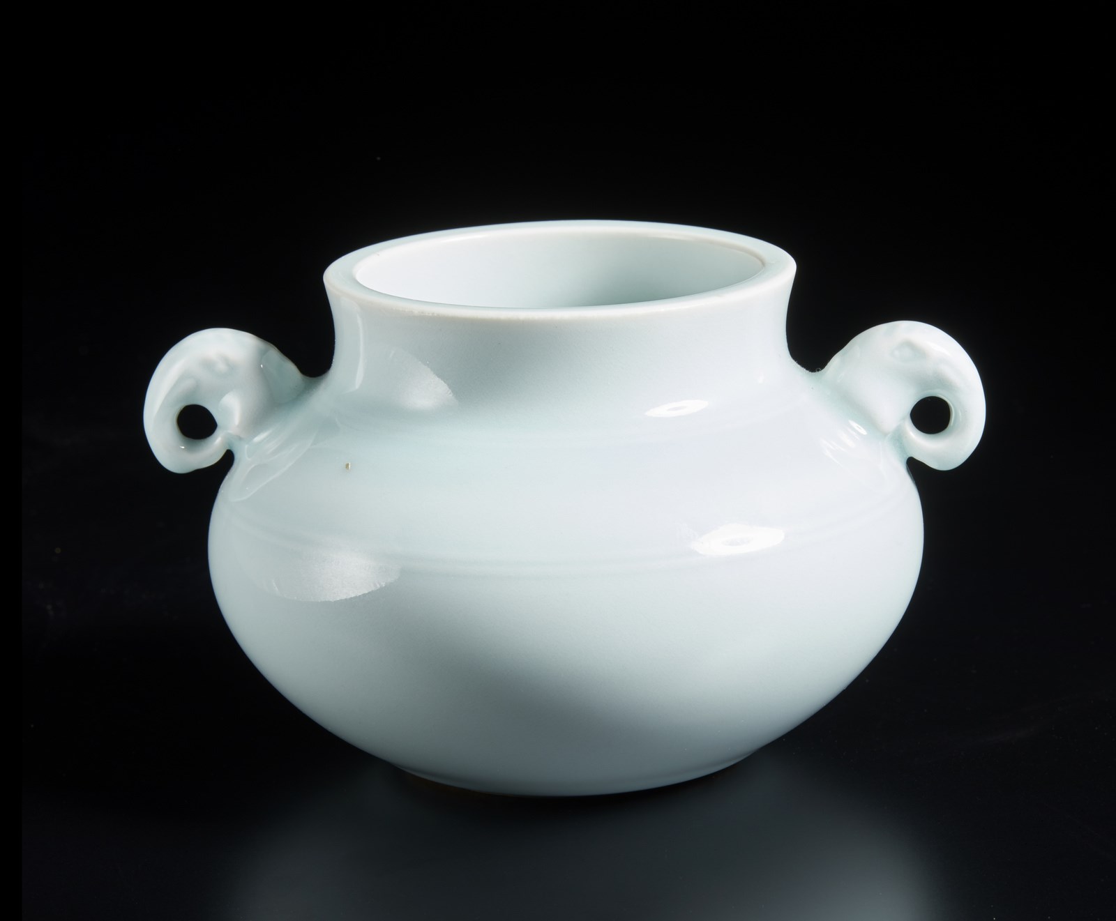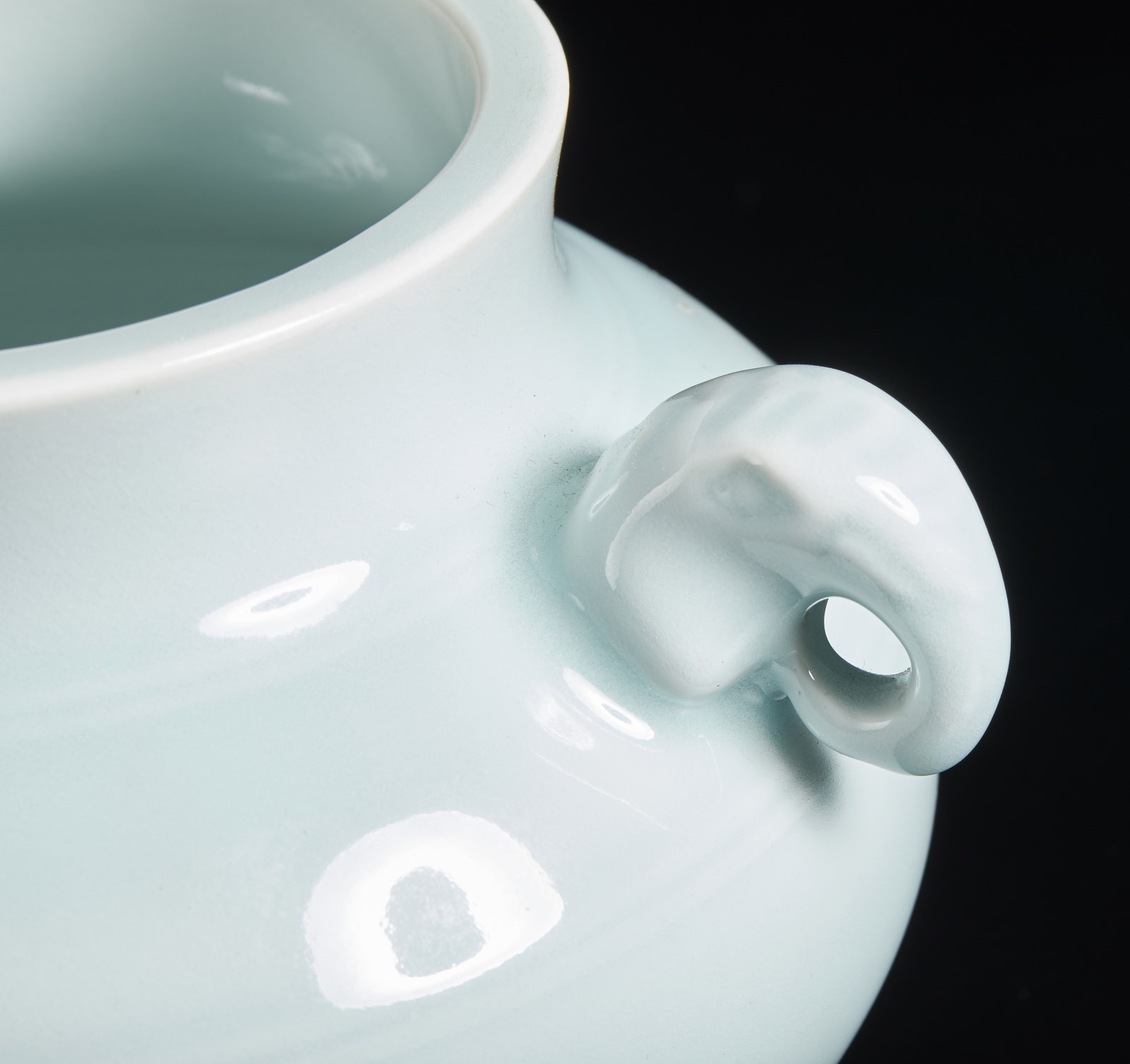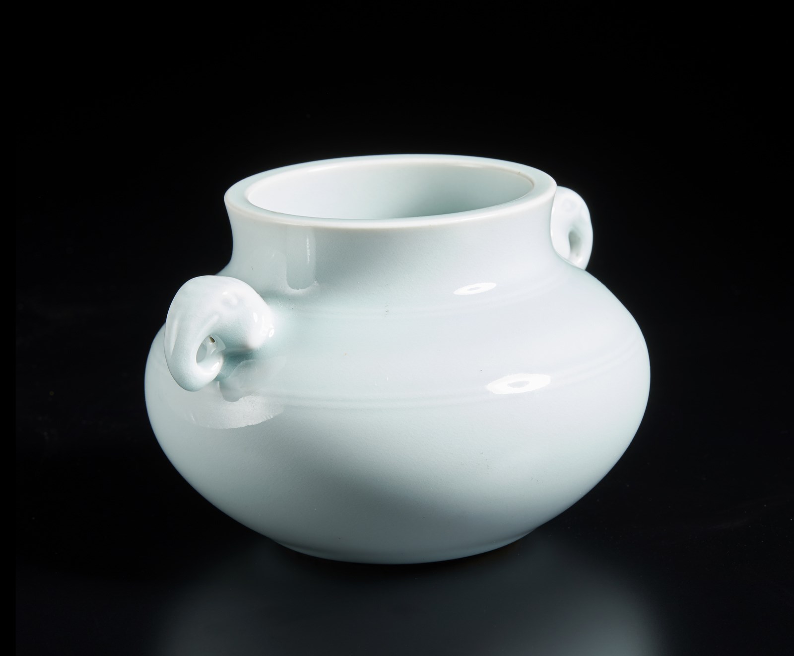Vaso con ampia pancia e collo cilindrico, interamente ricoperto di invetriatura celadon. Doppia ansa zoomorfa in forma di teste di elefante e marchio Kangxi a sei caratteri sulla base.