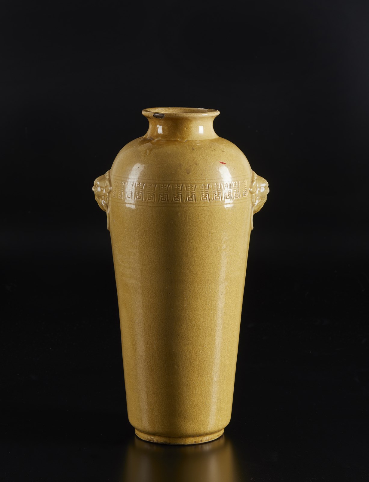 Vaso simile a un meiping con doppia ansa a protome leonina, ricoperto di invetriatura gialla e decorato con banda sgraffiata sulla spalla.