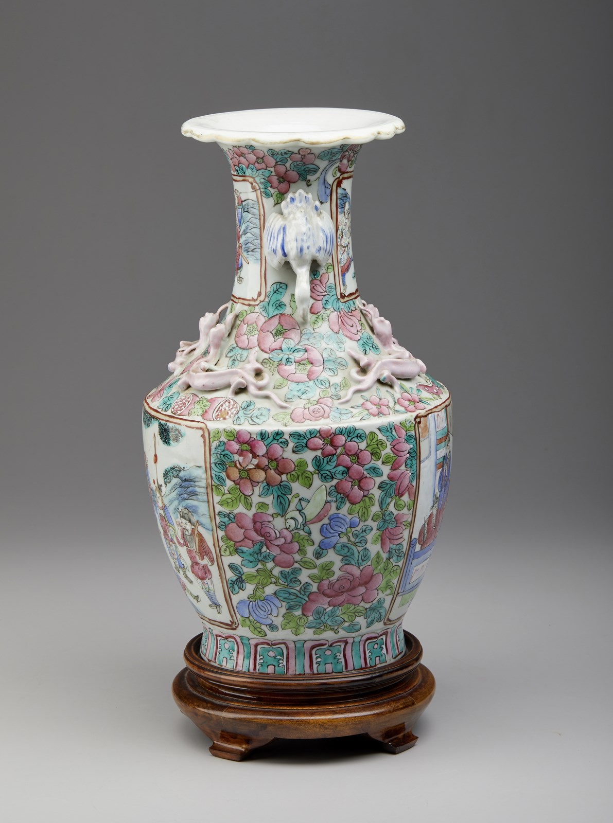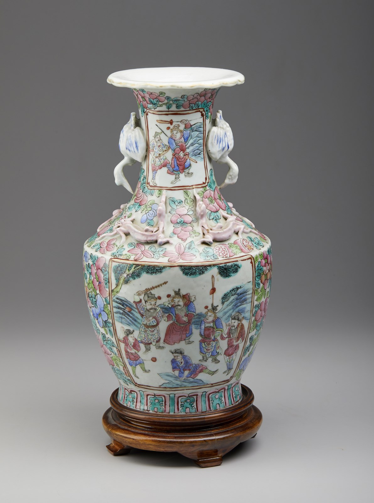 Vaso a decoro Canton, con manici in forma di aironi e applicazioni a rilievo in forma di qilong.