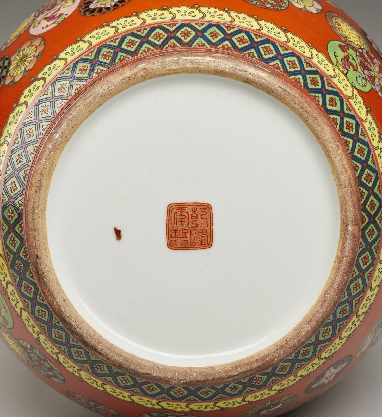 Vaso a bottiglia con corpo globulare e lungo collo strombato, l'esterno smaltato con simboli di buon auspicio entro rondelle su sfondo rosso. Marchio a sigillo Qianlong in rosso sulla base.