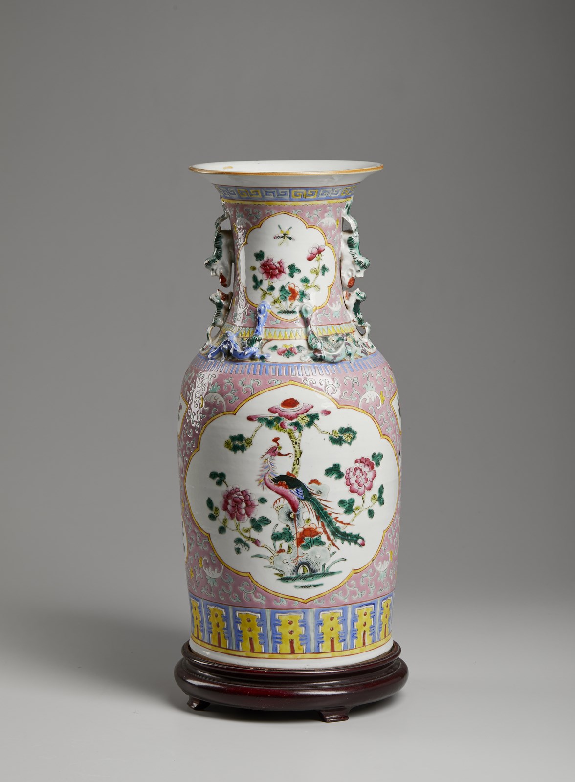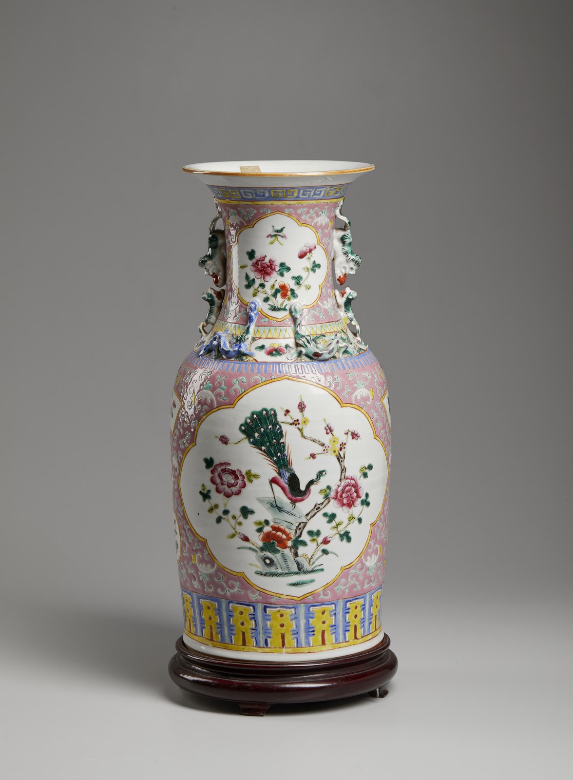 Vaso a balaustro decorato con pavoni e fiori entro cartucce polilobate a loro volta poggianti su uno sfondo di tralci poggianti su un tappeto rosato. Dimensione base in legno: 5,5x21 cm