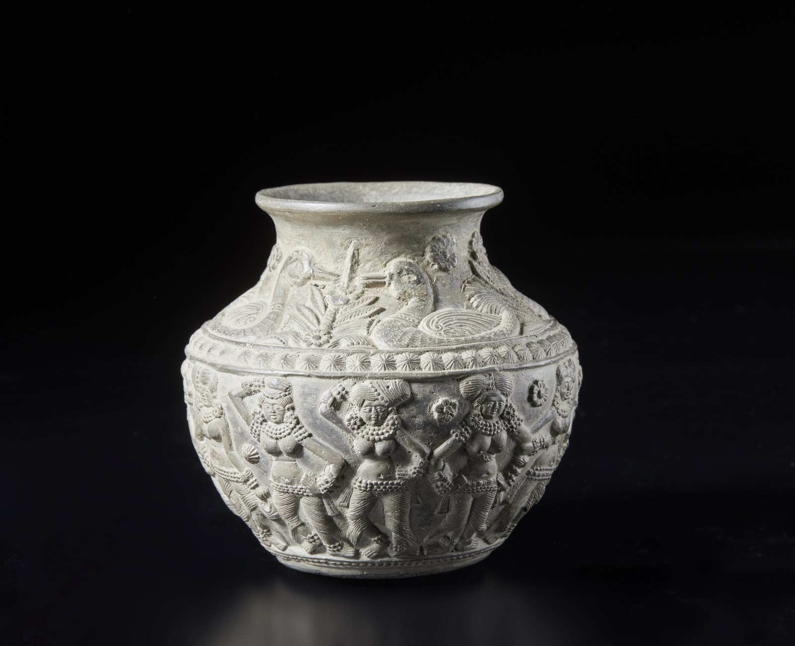 Vaso con corpo globulare e bocca eversa, l'esterno decorato con Yakshini danzanti ed anatre inframezzate da piante sul collo a clessidra. Lotto corredato di test Termo luminescenza.