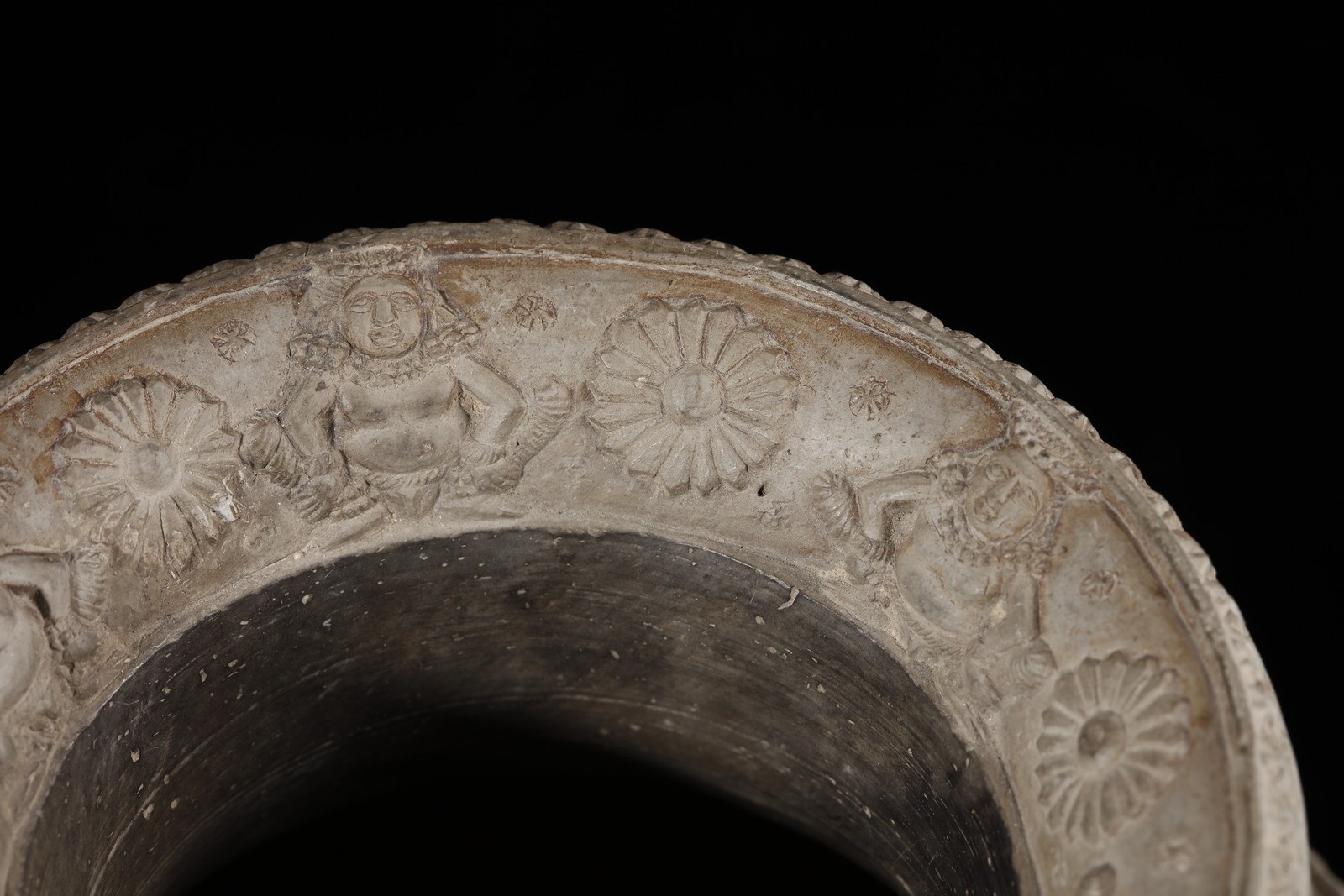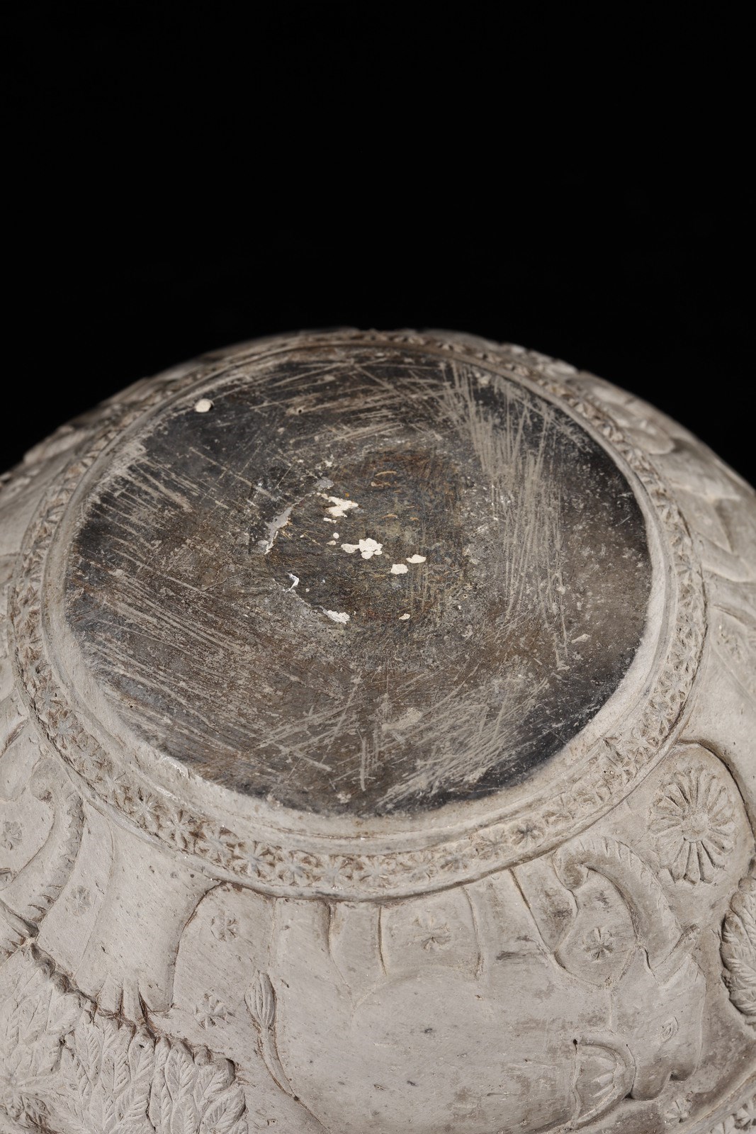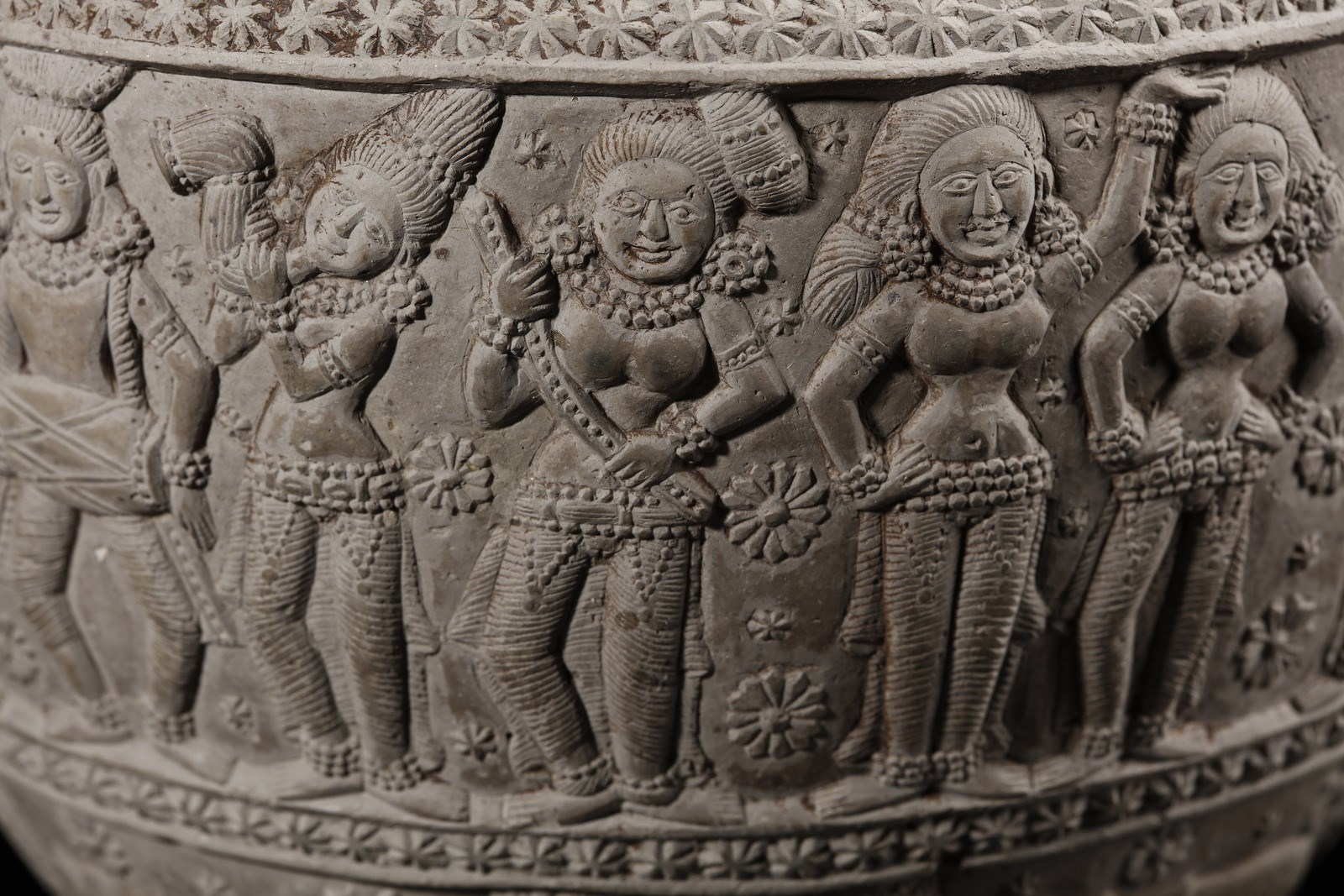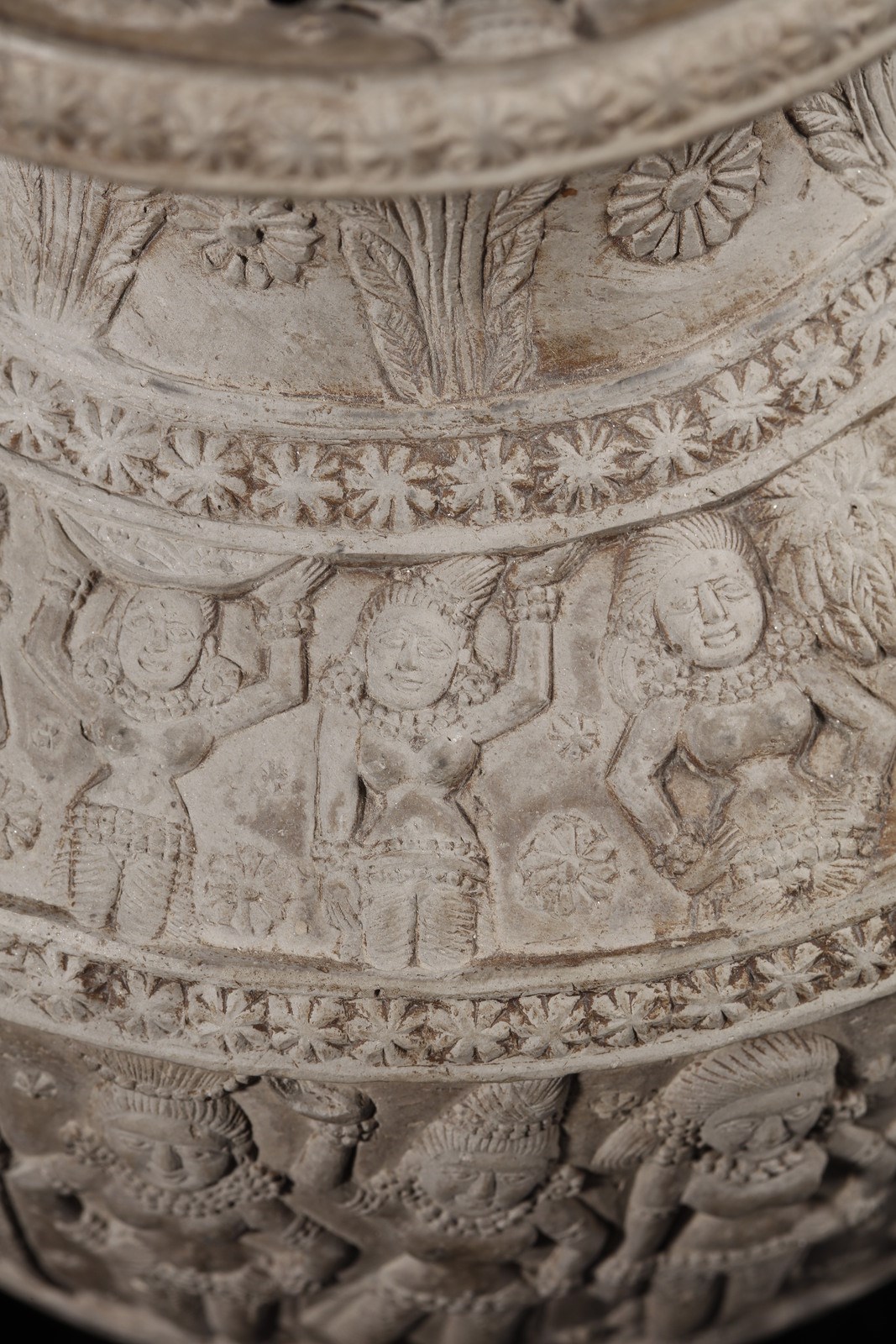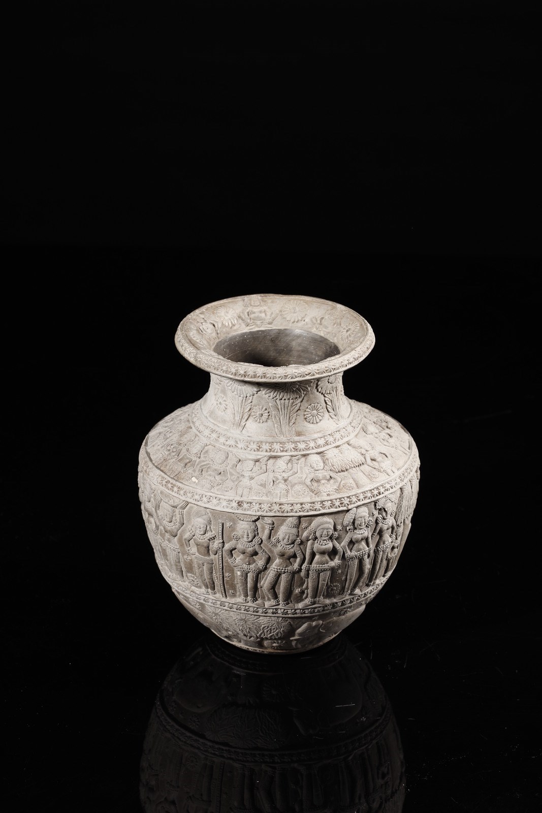 Vaso per acqua (lota) dalla classica forma con corpo globulare, collo cilindrico e bocca estroflessa. L'esterno è finemente intagliato e suddiviso in quattro registri separati da sottili bande floreali. Sulla base troviamo elefanti, simbolo di prosperità, tra alberi. i due registri centrali sono occupati da Yaksha e Yakshini, ovvero spiriti della natura maschili e femminili intenti in occupazioni ludiche canti e balli. il collo è invece riservato a decorazioni fitomorfe. Per un esemplare comparativo si veda quello conservato al Metropolitan Museum di New York, acc. n. 2002.266.Lotto corredato di test termoluminescenza.