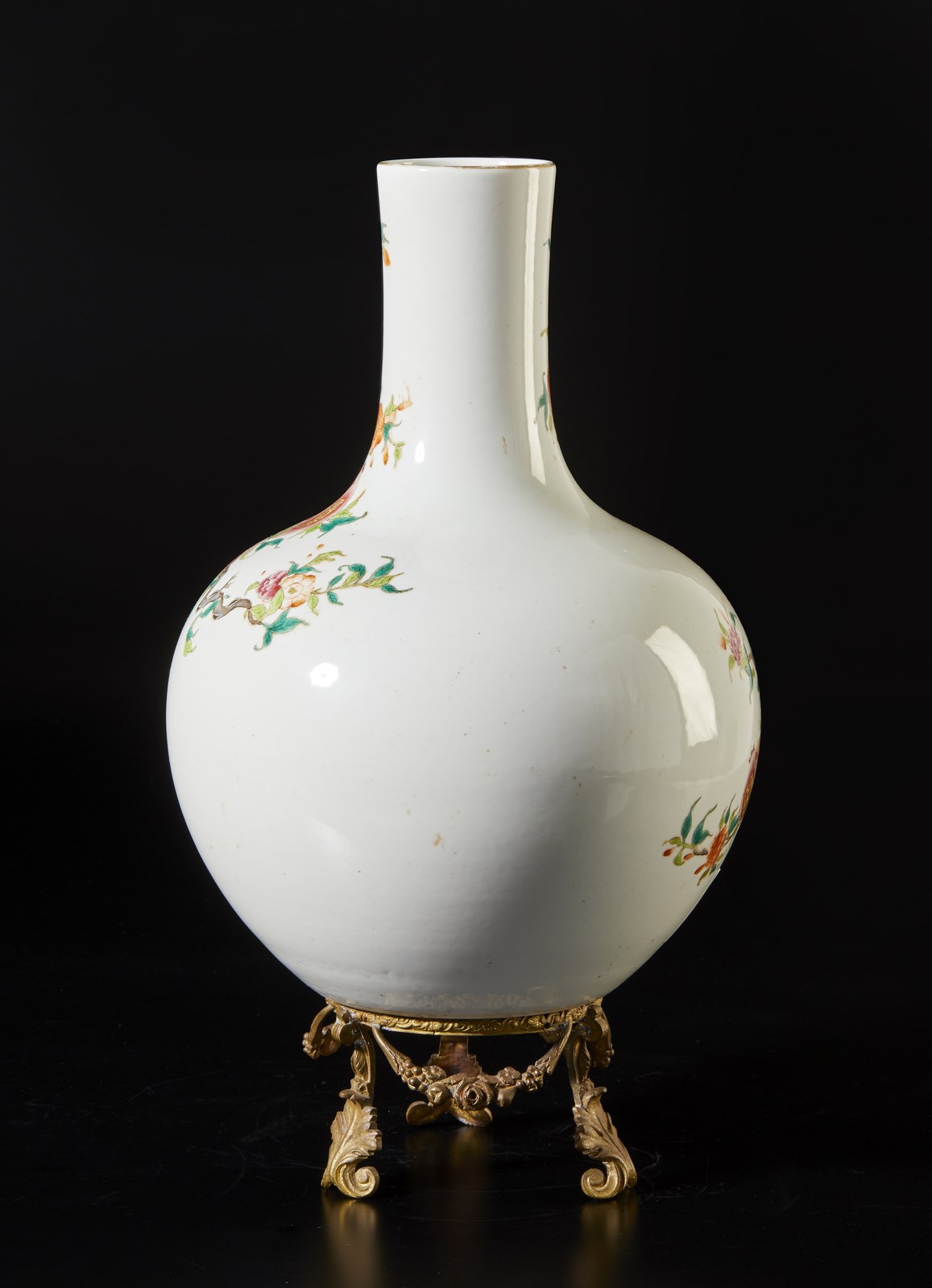 Vaso a bottiglia con ampio corpo globulare e alto collo cilindrico leggermente svasato. L'esterno dipinto in policromia con rami di pesco in fiore. Marchio apocrifo a sigillo Qianlong sulla base. Compleso di stand in metallo dorato (H. comprensiva di stand: 45 cm).