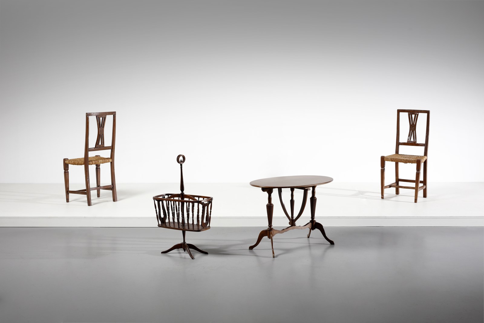 Lotto composto da coppia di sedie, tavolino e portariviste