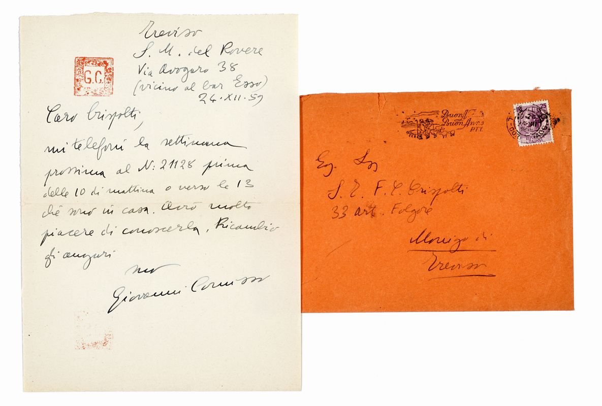 Manoscritto e dattiloscritto a inchiostro nero. Il biglietto su carta intestata “Il nuovo Corriere della Sera”; la lettera su carta intestata “L’Europeo – La redazione”. Piccoli difetti. Dimensioni lettera 210x295 mm, biglietto 140x120 mm. SI AGGIUNGE: Borgese Giulio Antonio. 1 lettera autografa firmata su carta intestata “Corriere della Sera” datata 1930 (ringraziamenti ad una marchesa per la “mirabile” casa e la bella serata); 1 biglietto autografo firmato datato Milano 1923 con dedica e una sua piccola foto giovanile (segni del tempo); 1 biglietto da visita senza data, autografo, siglato, con indirizzo di Berna, relativo ad un visto per “Yougine” (piccolo strappo); 1 cartolina di saluti autografa firmata datata 1925; 1 pagina del Corriere della Sera del 7 maggio 1922 con un articolo a firma di Borgese su Mario Rapisardi. SI AGGIUNGE: Comisso Giovanni. 1 lettera autografa firmata, inviata da Treviso ad un militare, datata 1959 (fissa un appuntamento per fare conoscenza). Busta viaggiata conservata. SI AGGIUNGE: Branca Vittore. 1 lettera dattiloscritta con firma autografa su carta intestata “La nazione del popolo”, Firenze, datata 1946, inviata al Prof. Ettore Li Gotti a Palermo. “[…] ho già fatto parlare delle tue Trecentonovelle all’amico Augusto Livi […]”.