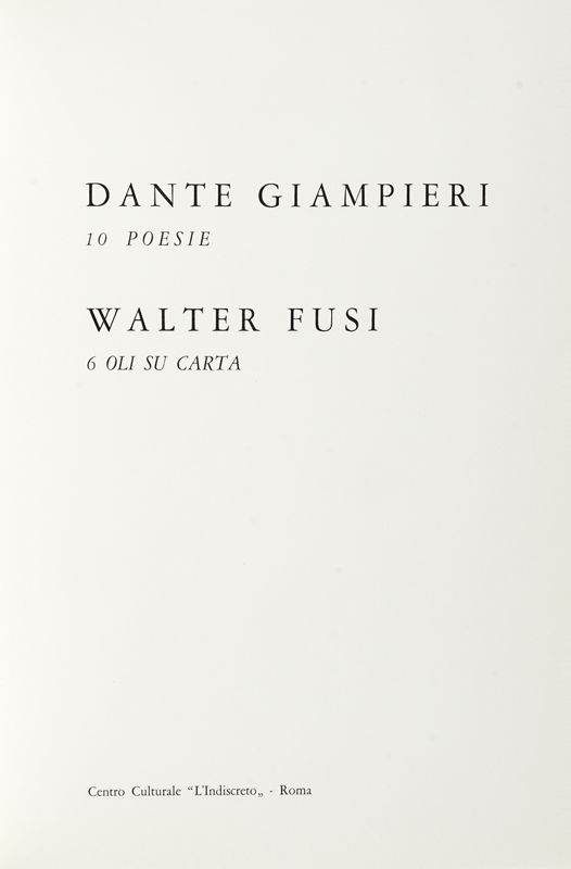 In-folio (mm 500x348). Carte [16]. Con 6 splendide tecniche miste (olio, carboncino, matita) di Walter Fusi, sciolte e fuori testo, numerate e firmate a matita dall'Artista. Esemplare a bifoli sciolti, in ottimo stato di conservazione, con il testo, e le opere di Fusi, al recto della seconda carta di ciascun bifolio. Cartella editoriale in pieno cartonato con alette laterali, e titoli in nero al piatto anteriore. Lievi difetti. Copia n. 31 su una tiratura complessiva di 40, uno dei 35 in numeri arabi, firmato al colophon dall'Autore e dall'Artista.