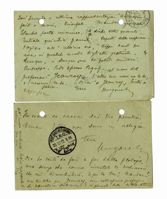 Manoscritti a inchiostro nero. Due “Cartes postales” inviate da Rue de Carmes 5, scritte 2 pagine. Fori di raccoglitore. Dimensioni mm 90x140.